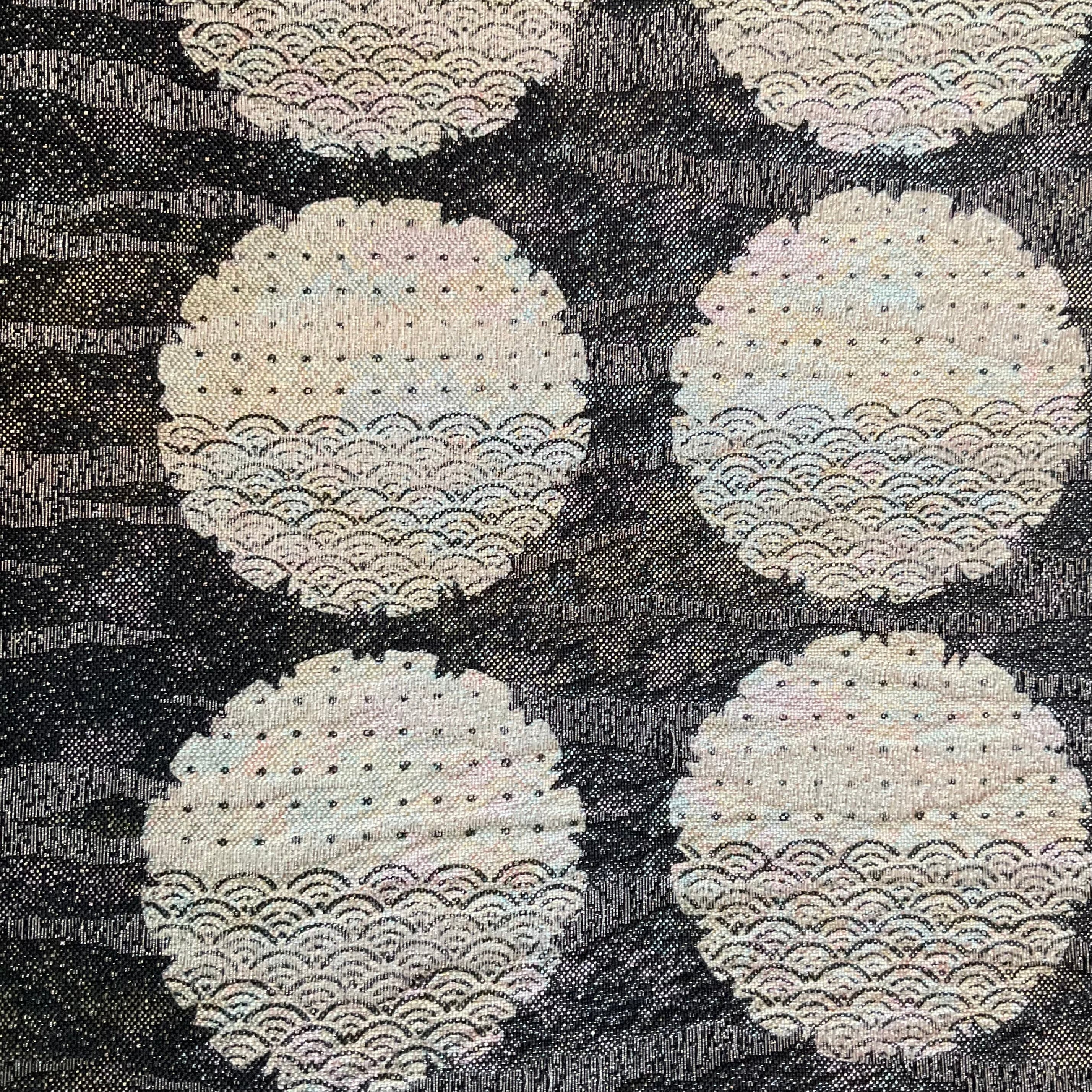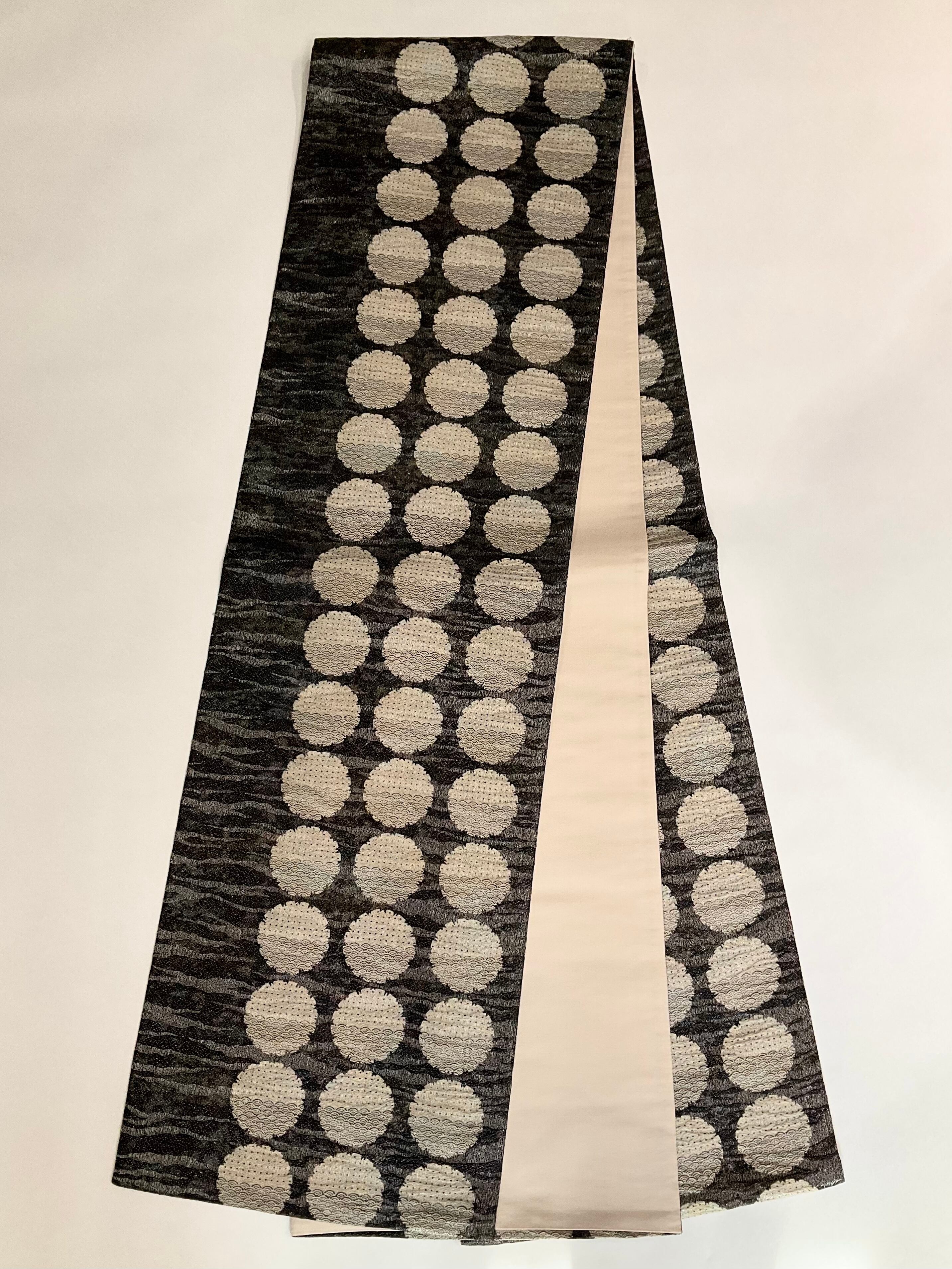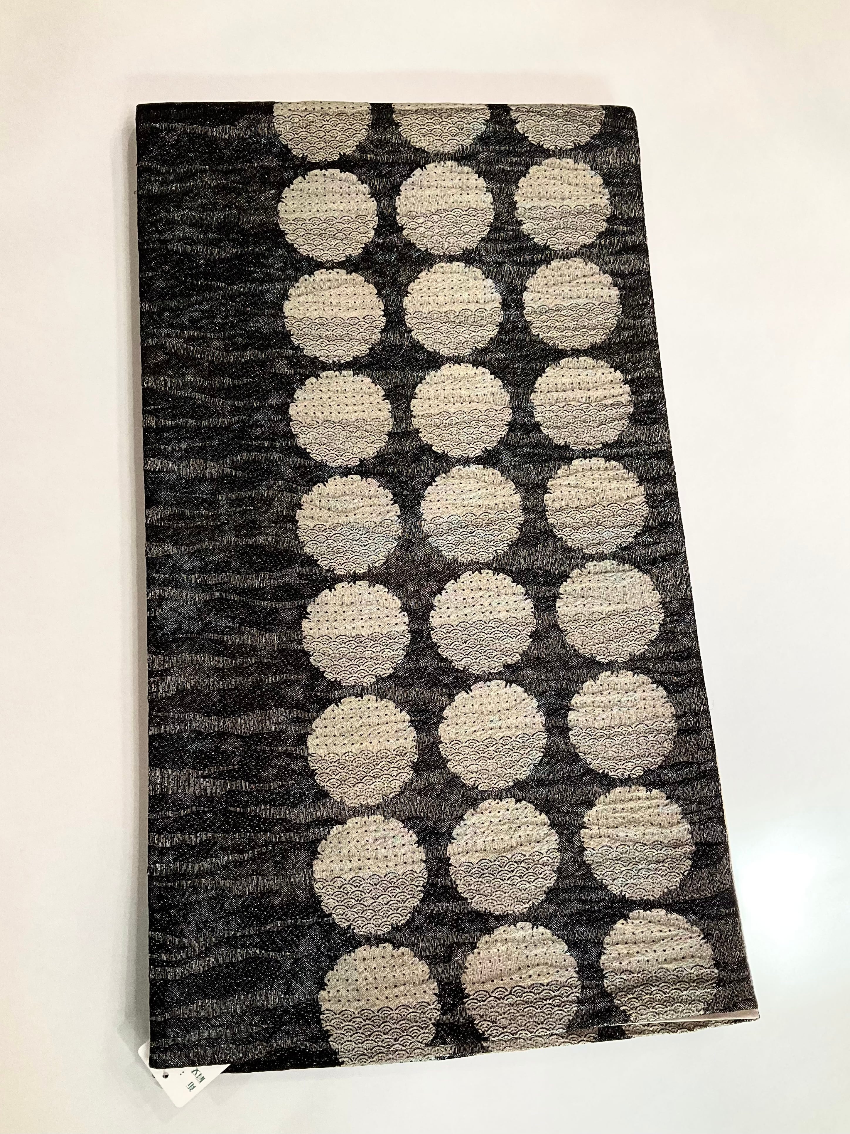 ブラック系の地色に、サークルが連なったデザインの洒落袋帯です♪