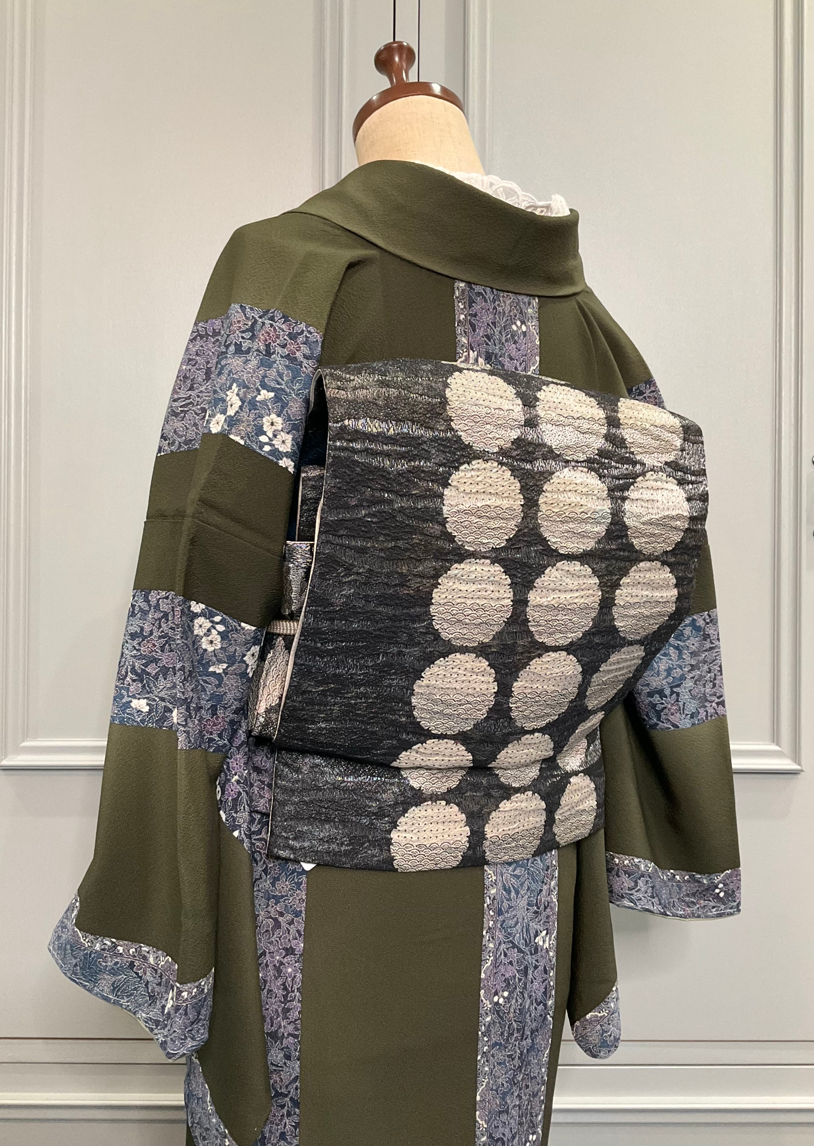 またこちらの名古屋帯は、お太鼓部分のデザインを見ていただくとわかりやすいのですが、サークル模様が縦ラインに連なっており、片側寄りに配置されたデザインになっている為、右回し・左回しと締める方向によって、胴回り部分に出るデザインが変わるんです!