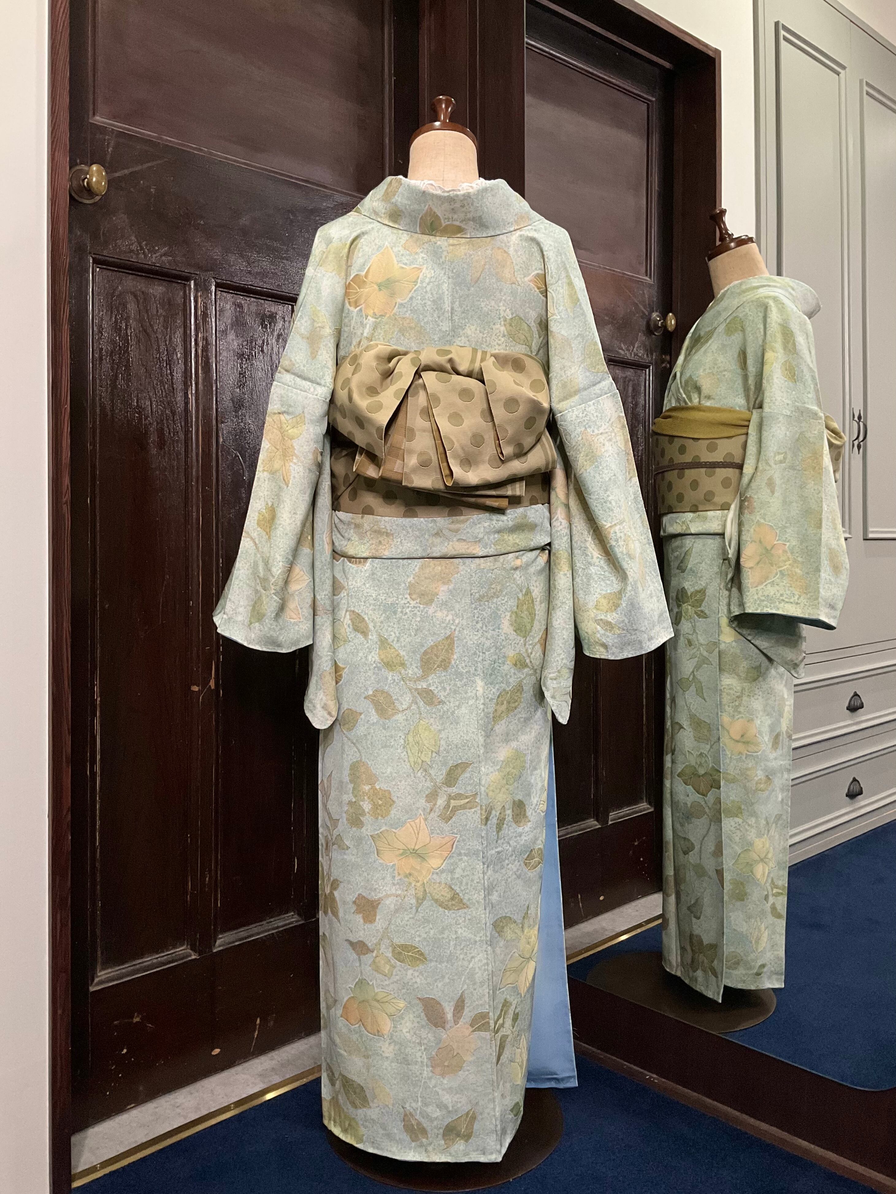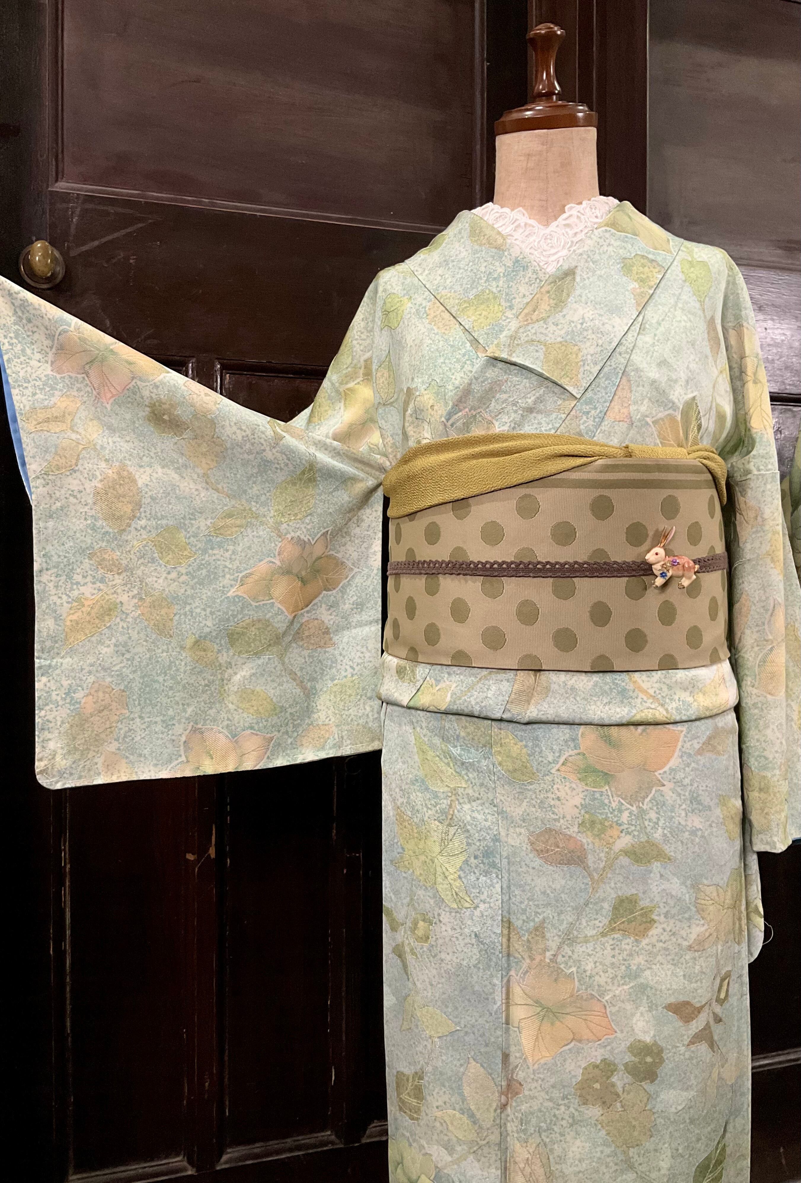 アイボリーのような、ほんのり黄みがかったお色と、ライトブルー系のお色がミックスされた地色に、淡いグリーンやイエロー系のグラデーションの花模様が綺麗なこちらのお着物。