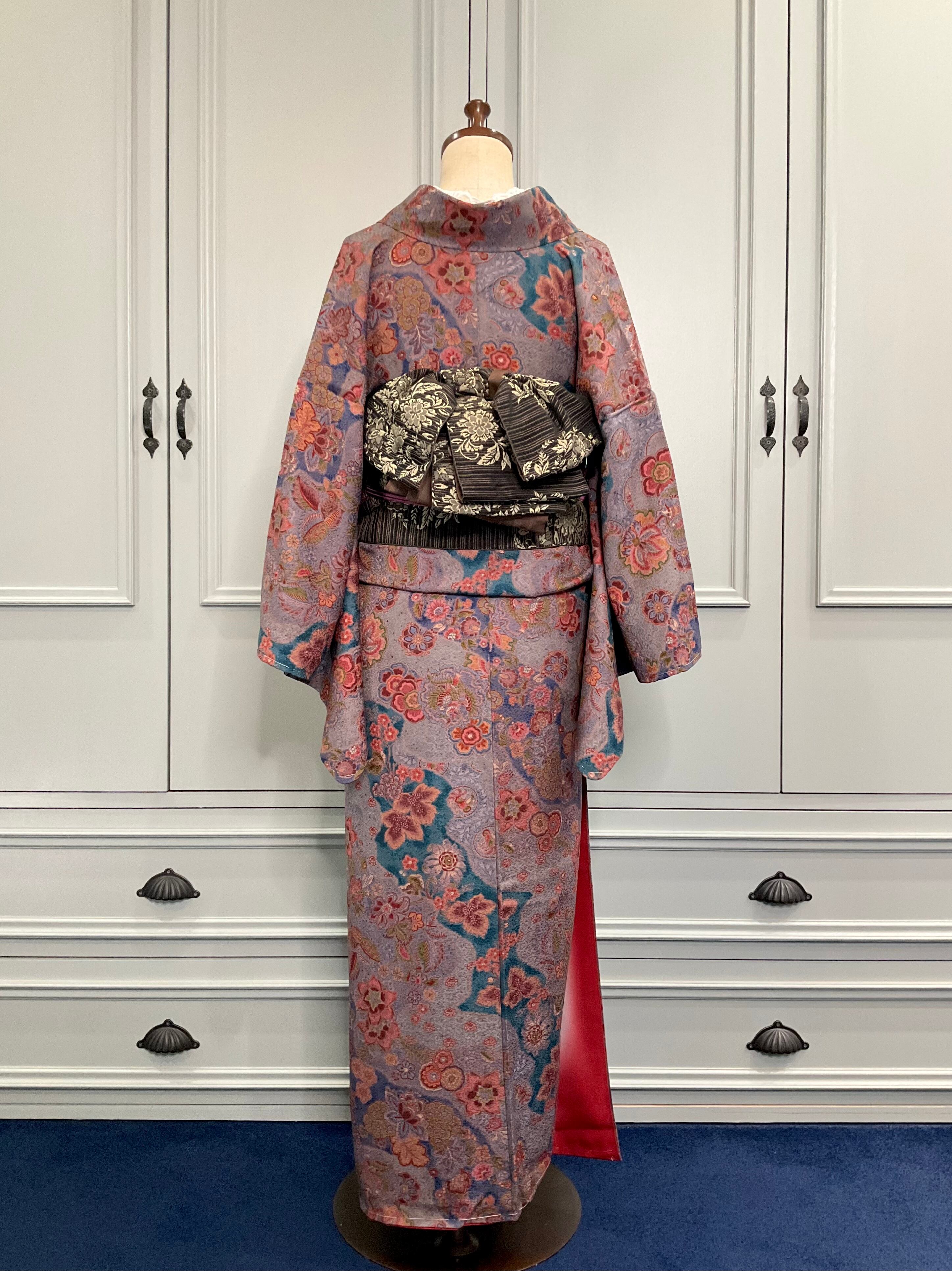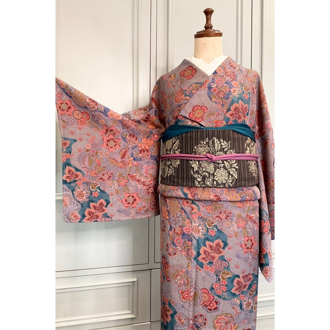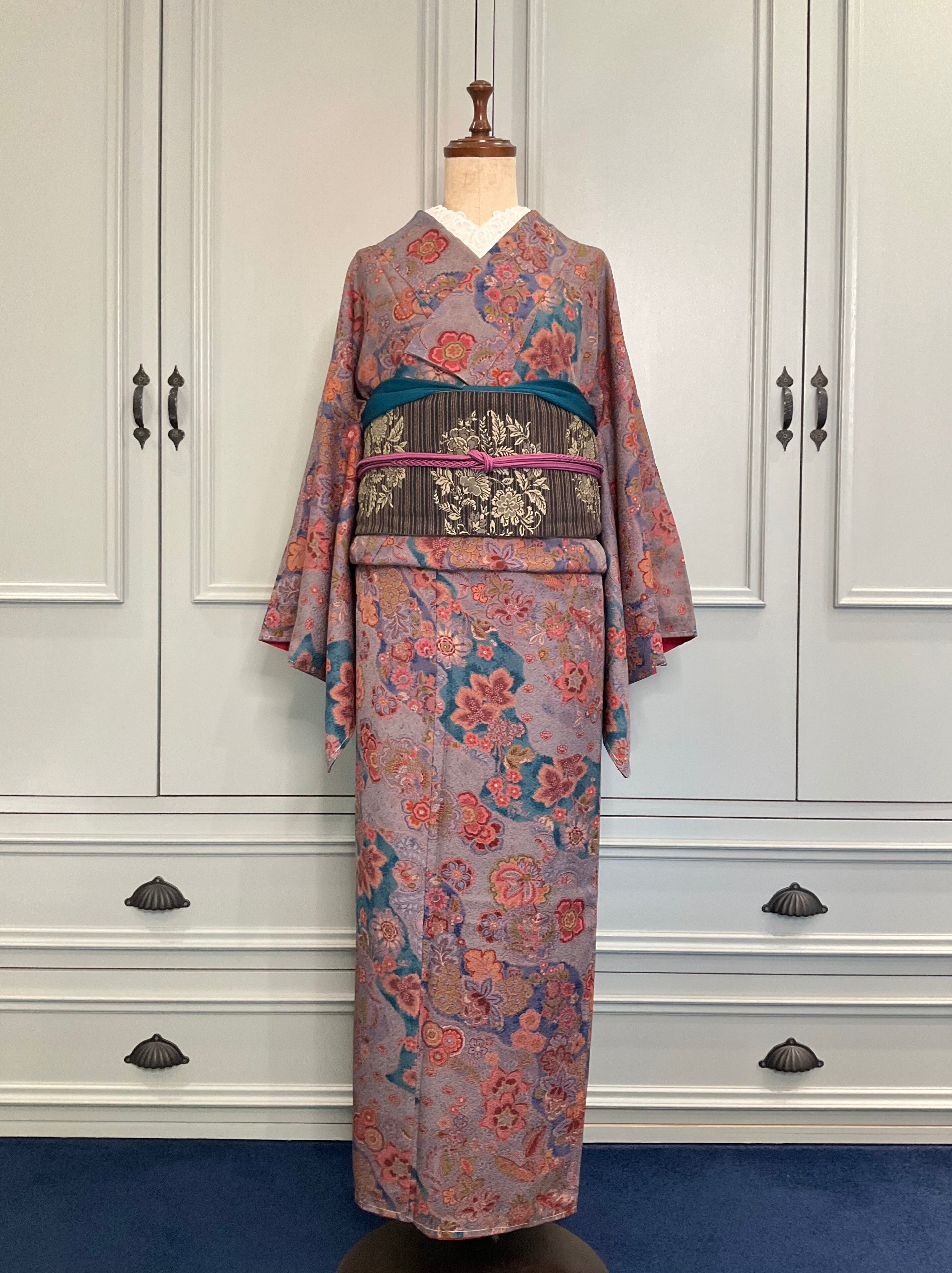 グレー系を中心とした地色に、花模様がデザインされた、リサイクル小紋着物です♪