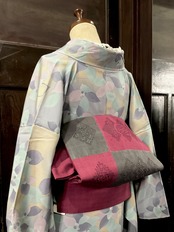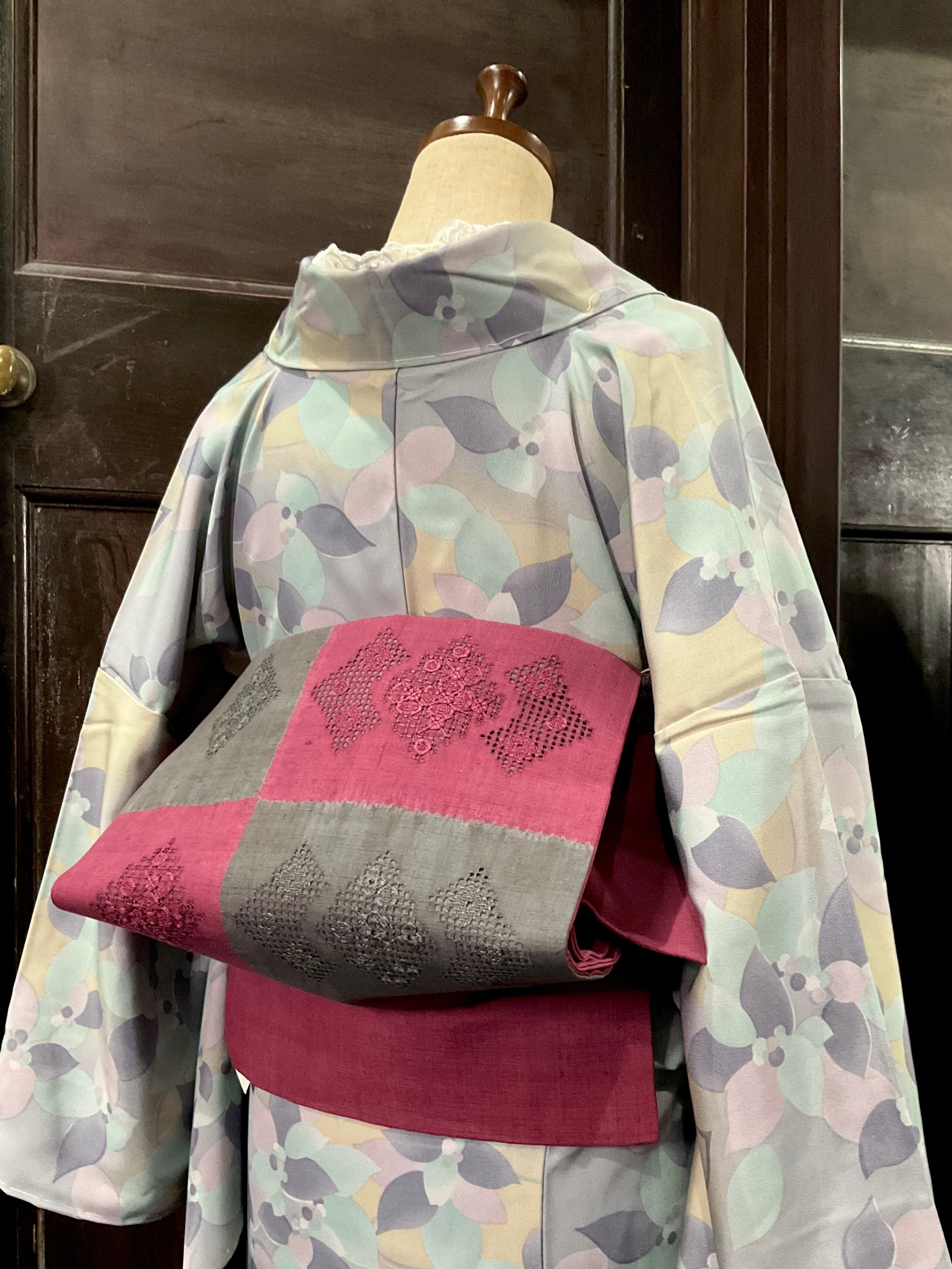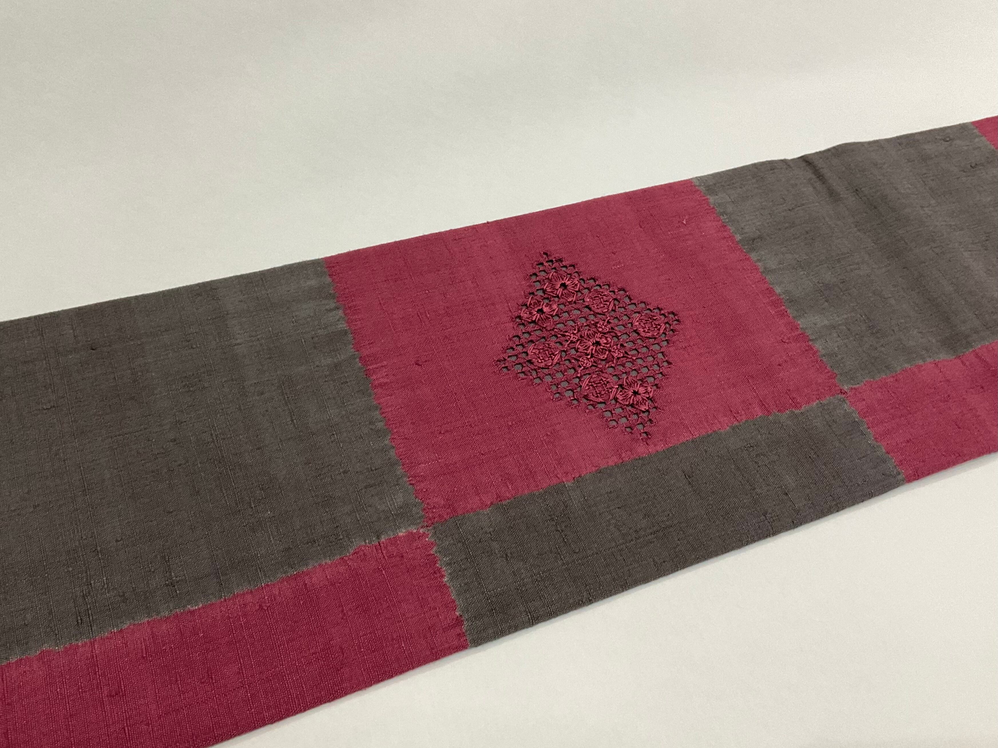レッド系×グレーのブロックチェックと、刺繍が素敵な、名古屋帯です♪