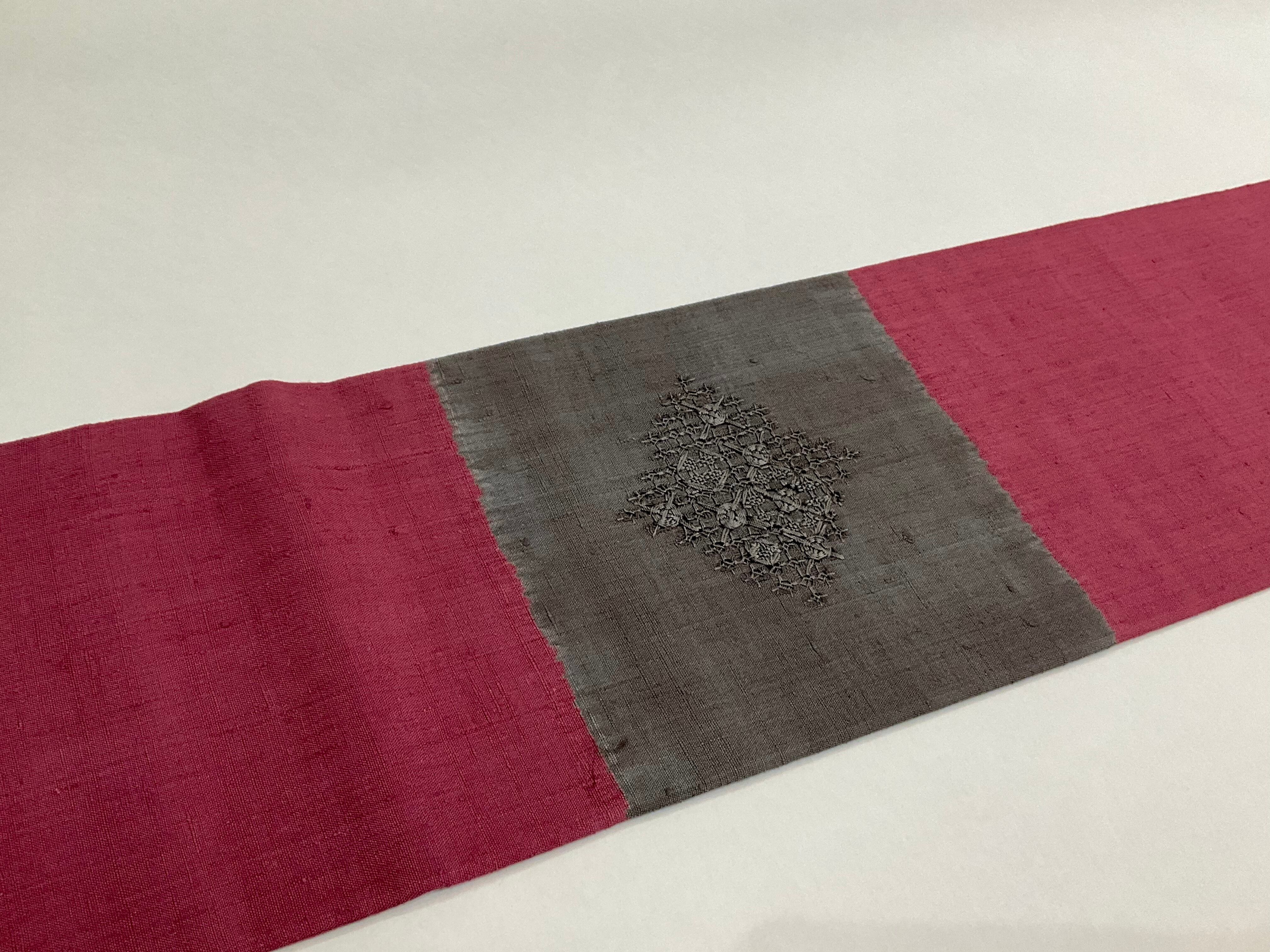 お太鼓部分と胴回り部分のデザインには、スワトウ刺繍がほどこされ、繊細で美しいデザインがとても素敵です✨