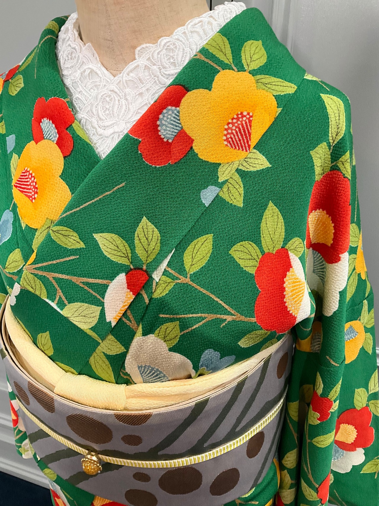 鮮やかなグリーンの地色に、これまた鮮やかなレッドやイエロー、そして上品なホワイトやブルーで彩られた椿の花模様がとても綺麗✨