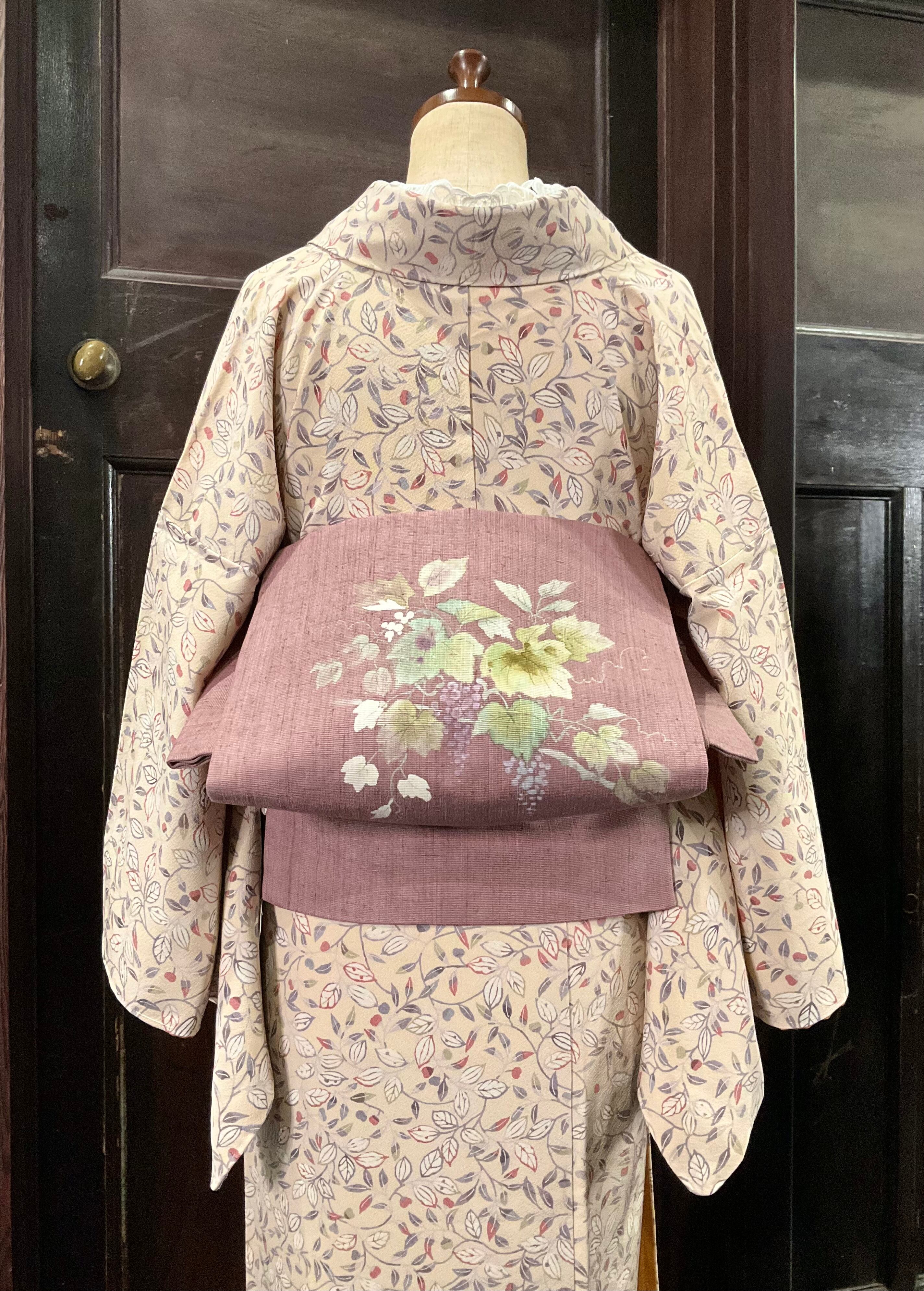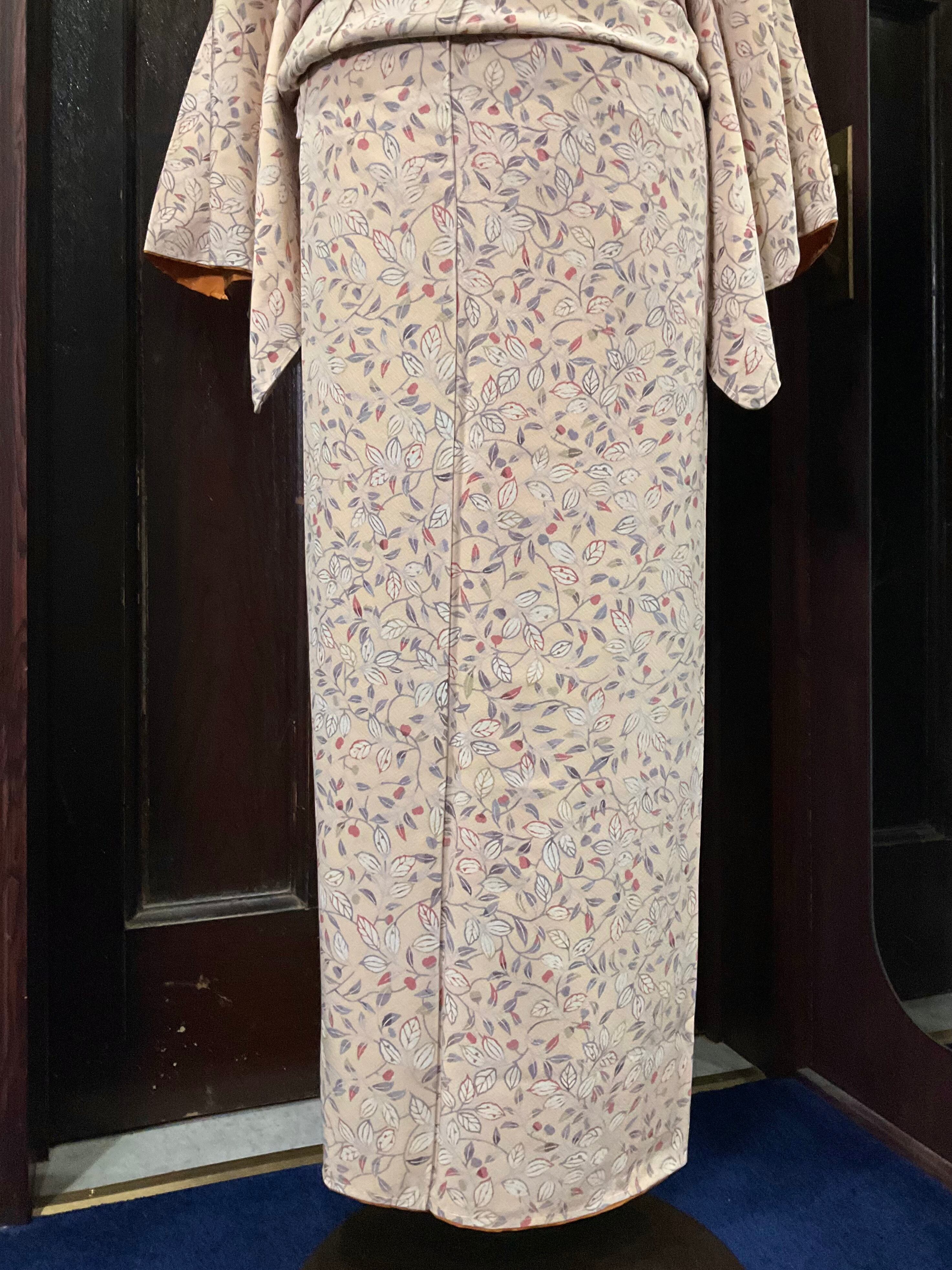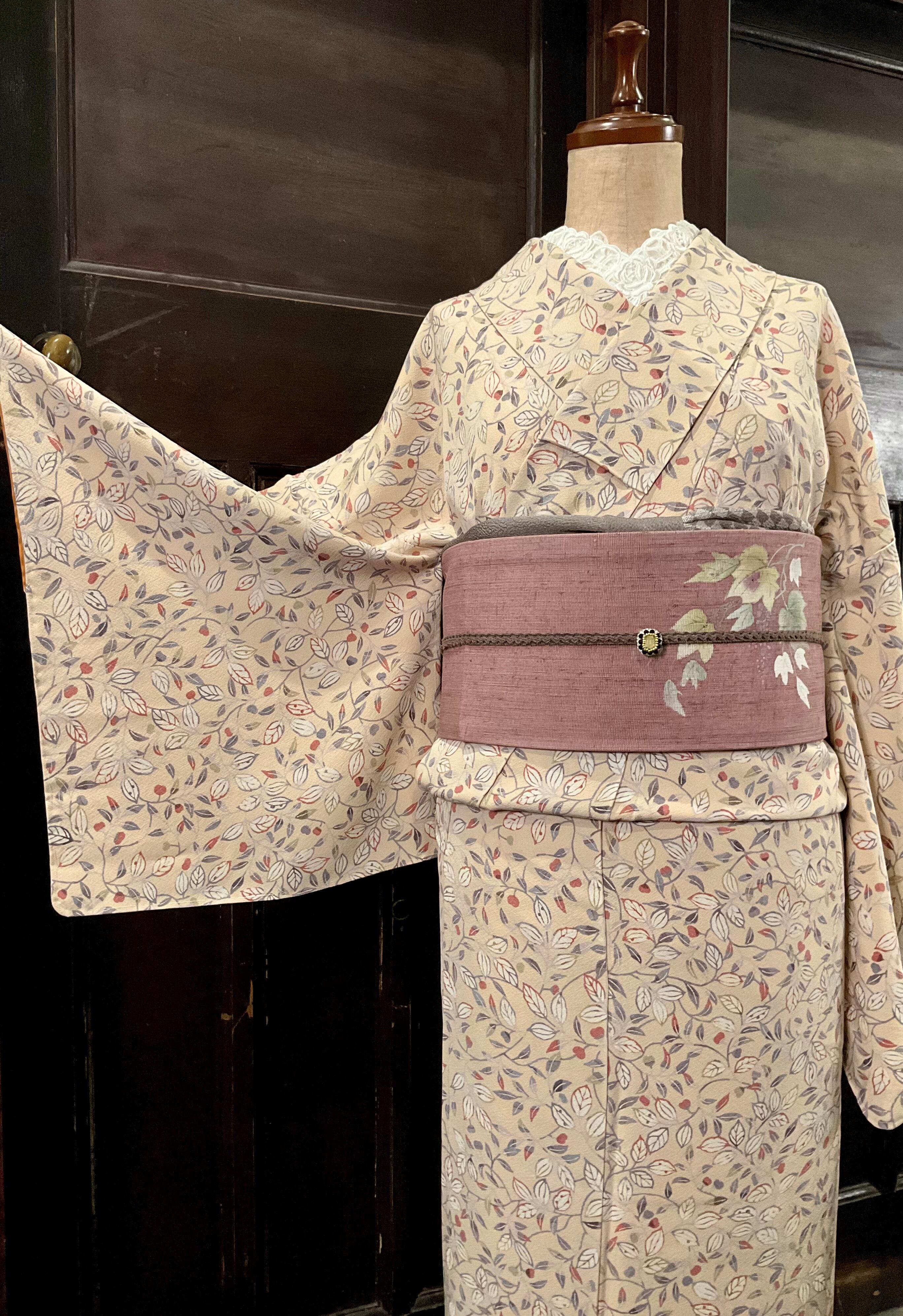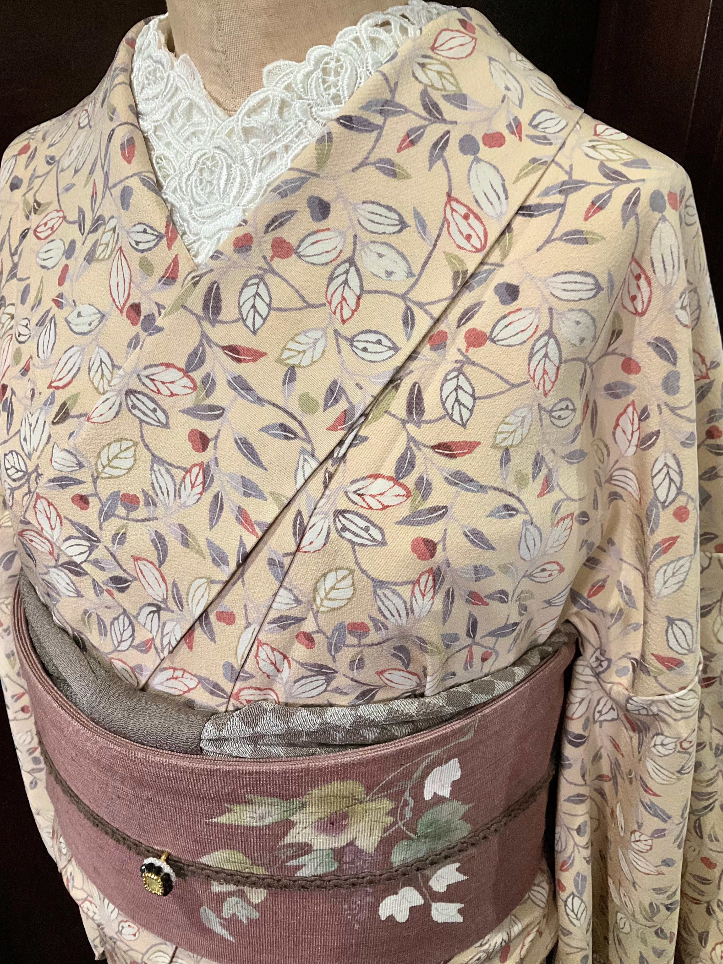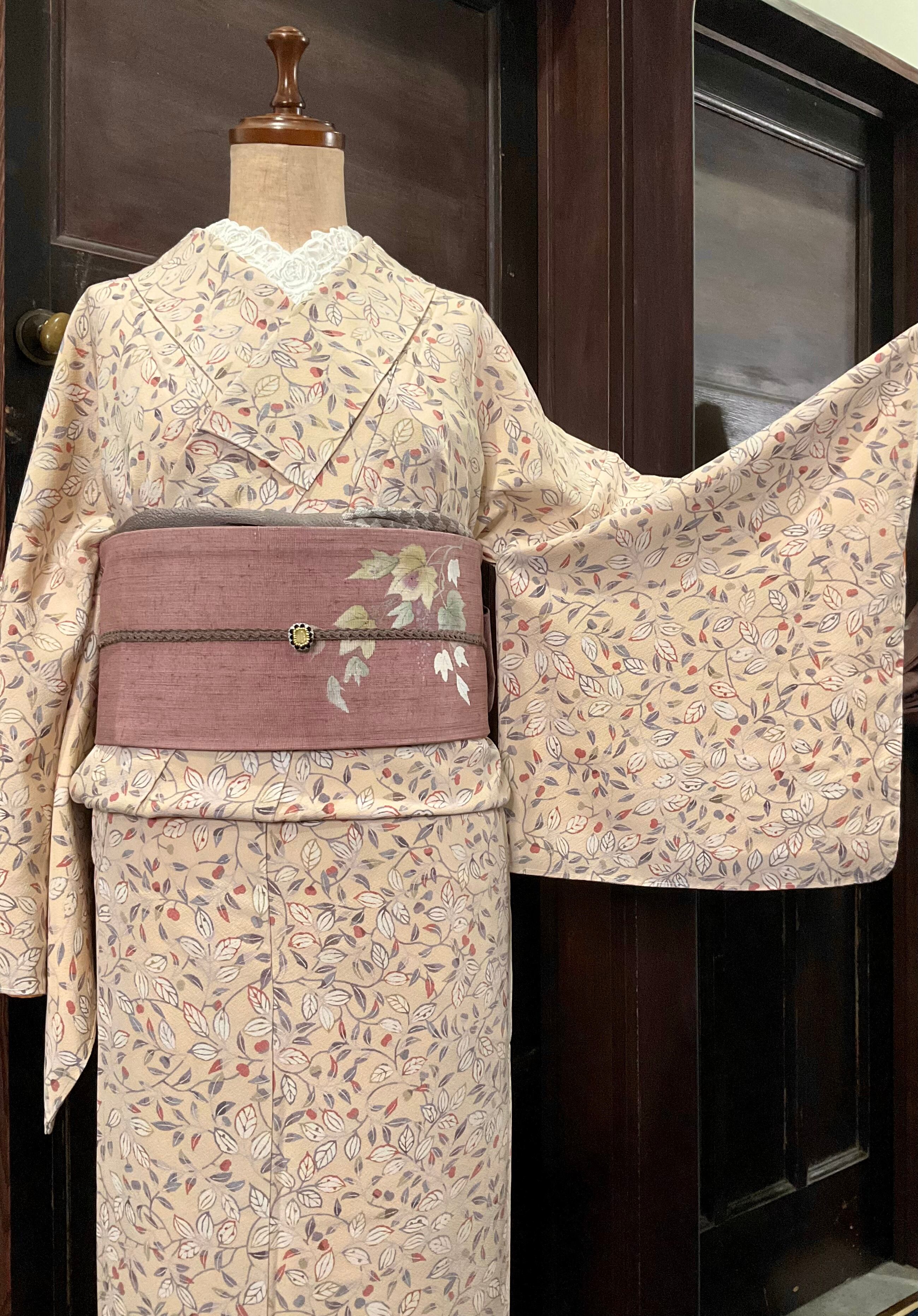 ベージュ系の地色に、葉模様をメインにデザインされた、小紋着物です♪