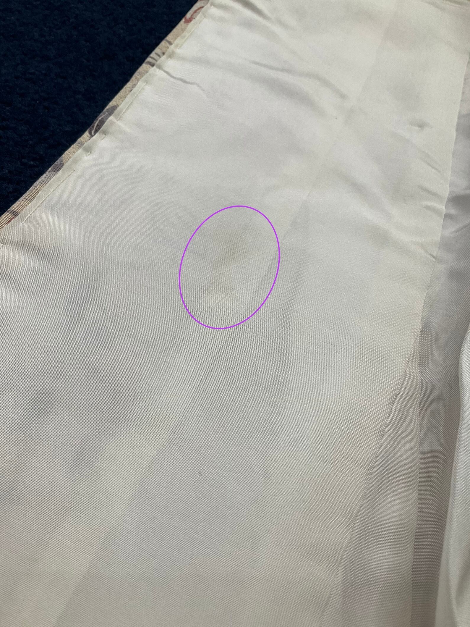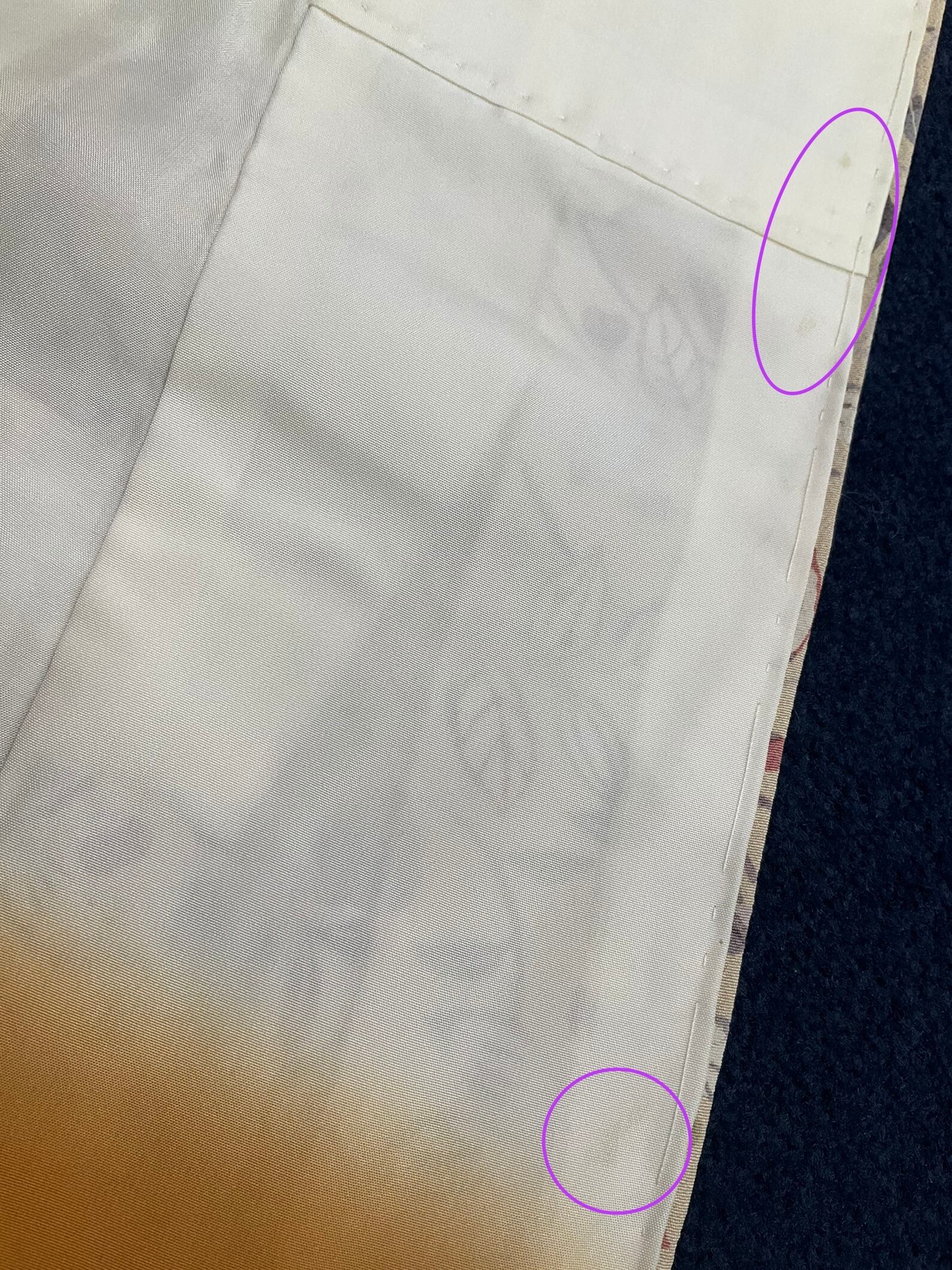 胴裏(上前身頃の八掛との切り替わり付近)、衿(右側、真ん中付近、左側)に、目立ちにくいですが、うっすら変色(?)有り。