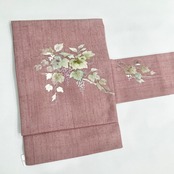 ピンク系とパープル系の間のような、少しスモーキーで落ち着いた絶妙カラーが素敵なこちらの名古屋帯。