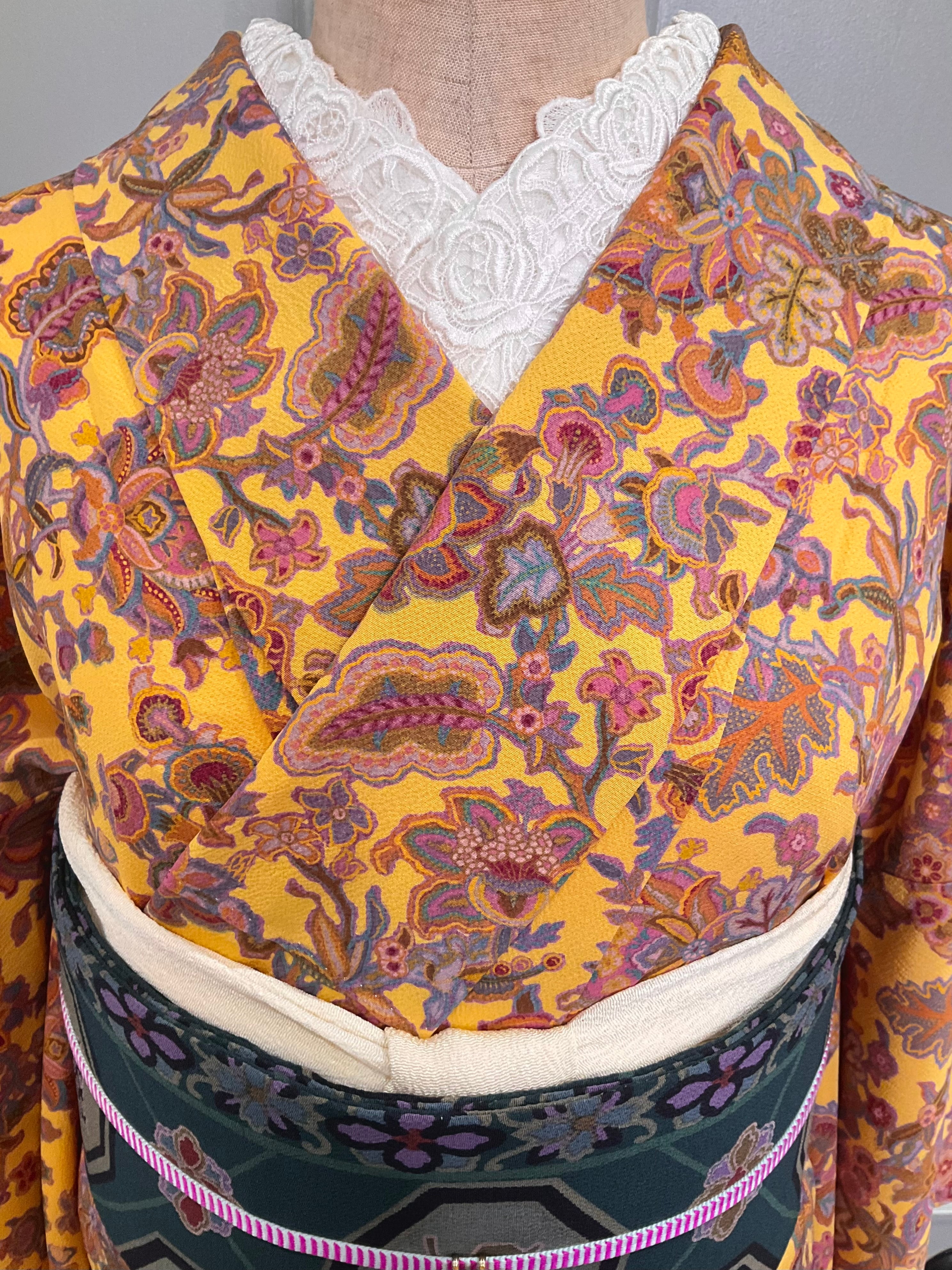 イエローの地色に、花模様がデザインされた、小紋キモノです♪