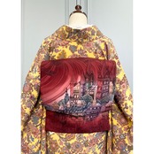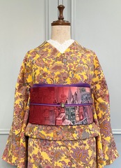 レッド系の地色に、街の風景がデザインされた、未使用品の洒落袋帯です♪