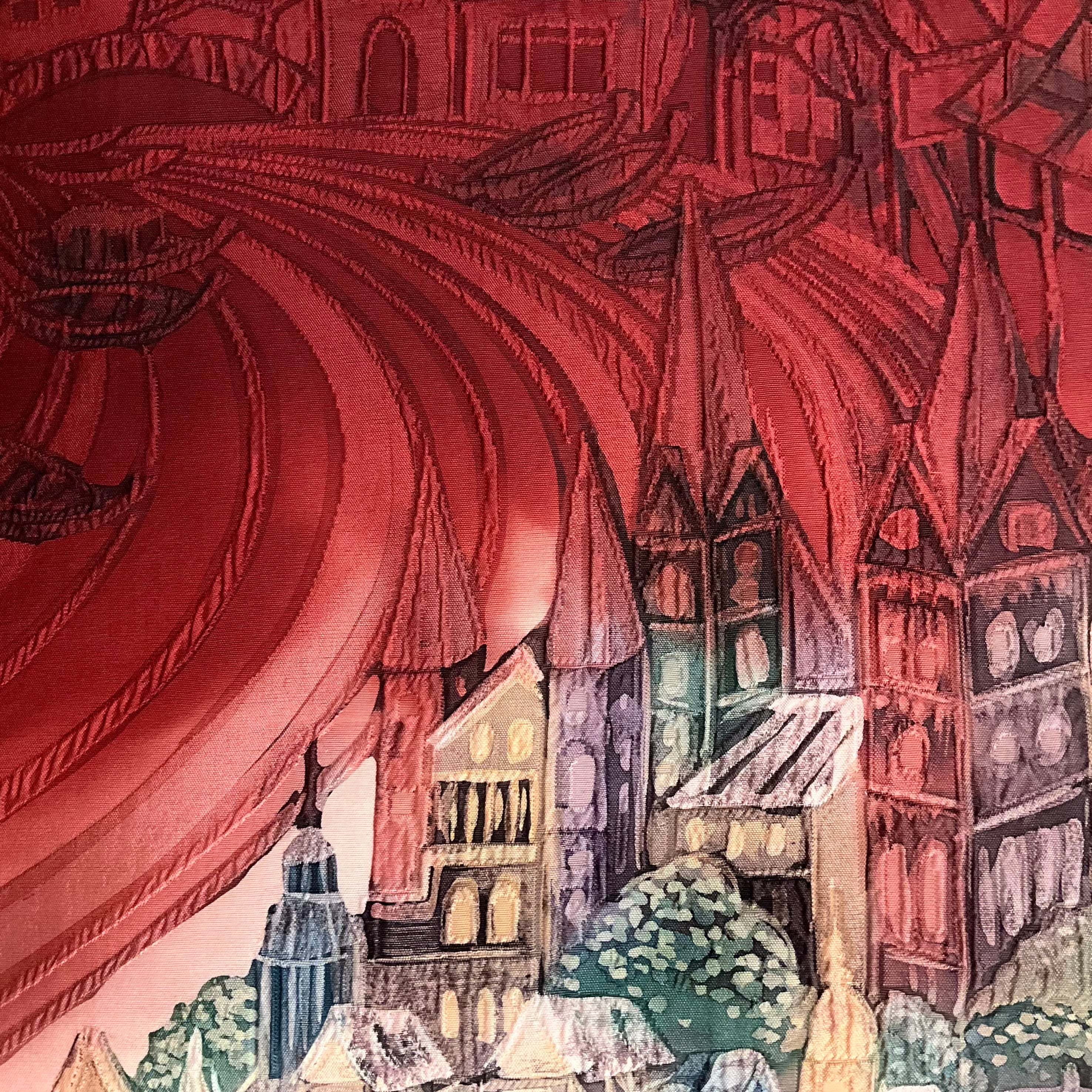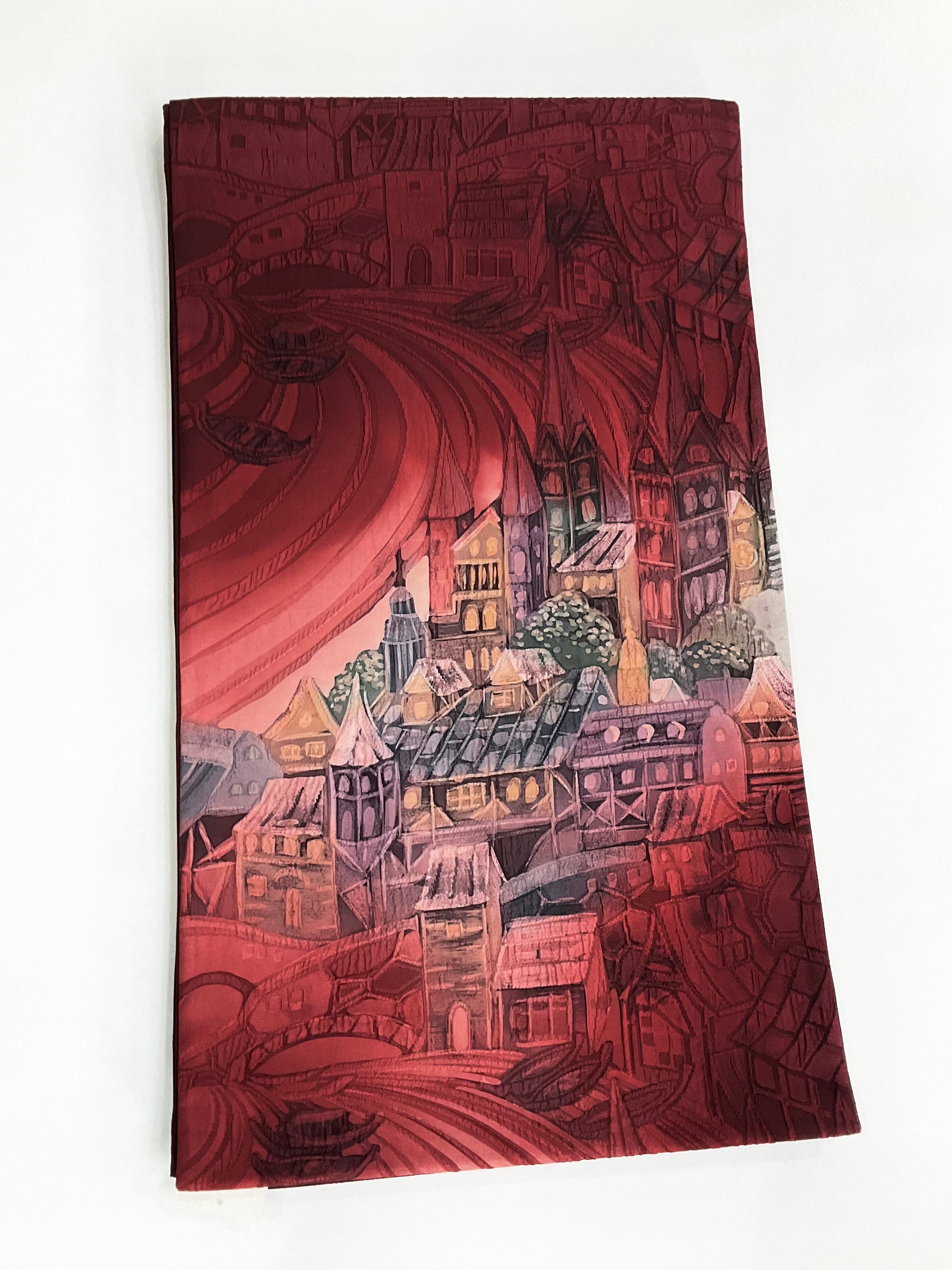 深みのあるレッド系の地色に、スモーキーなお色で彩られた街並みは絵画を見ているようで、どこかレトロで趣のあるこちらのデザイン。