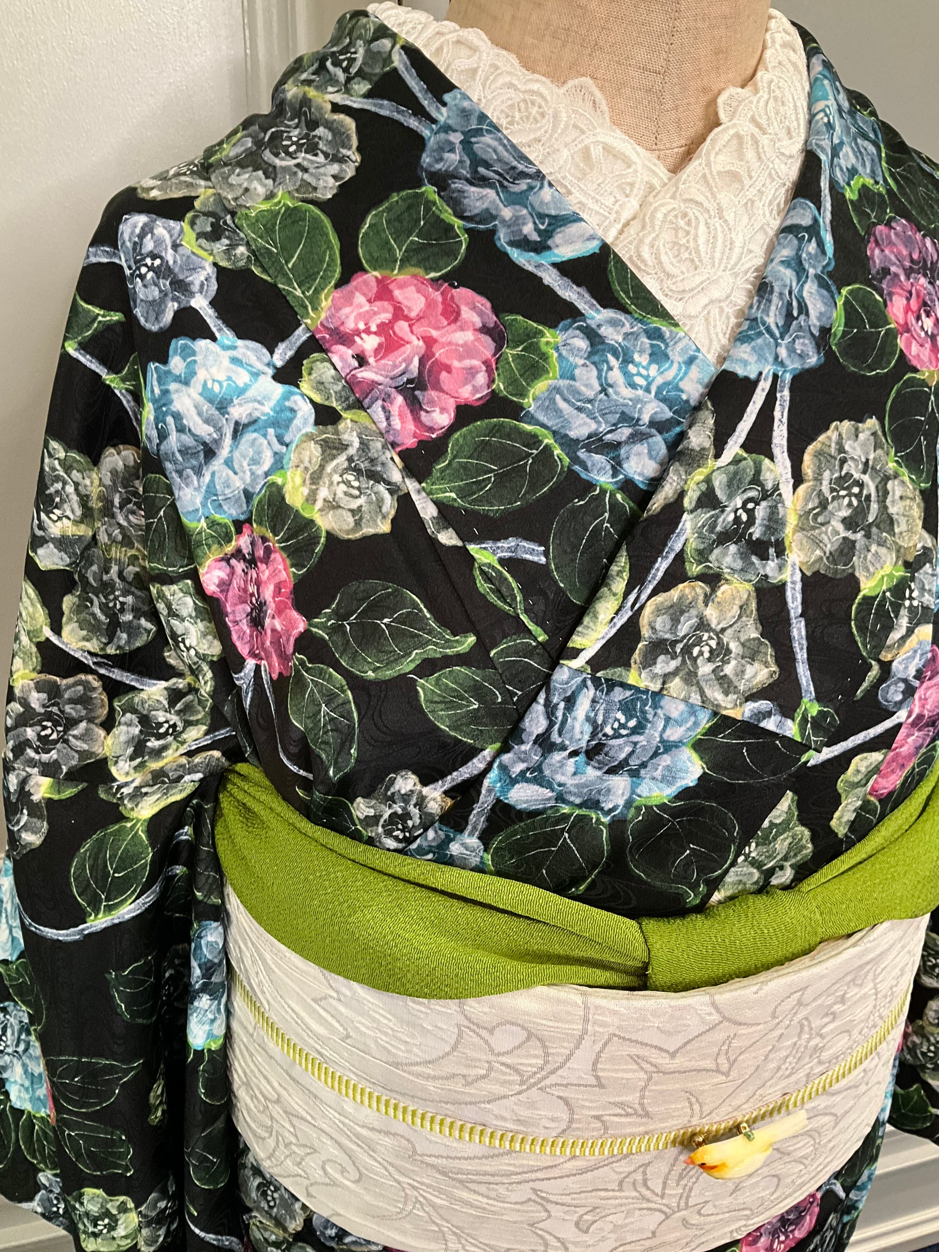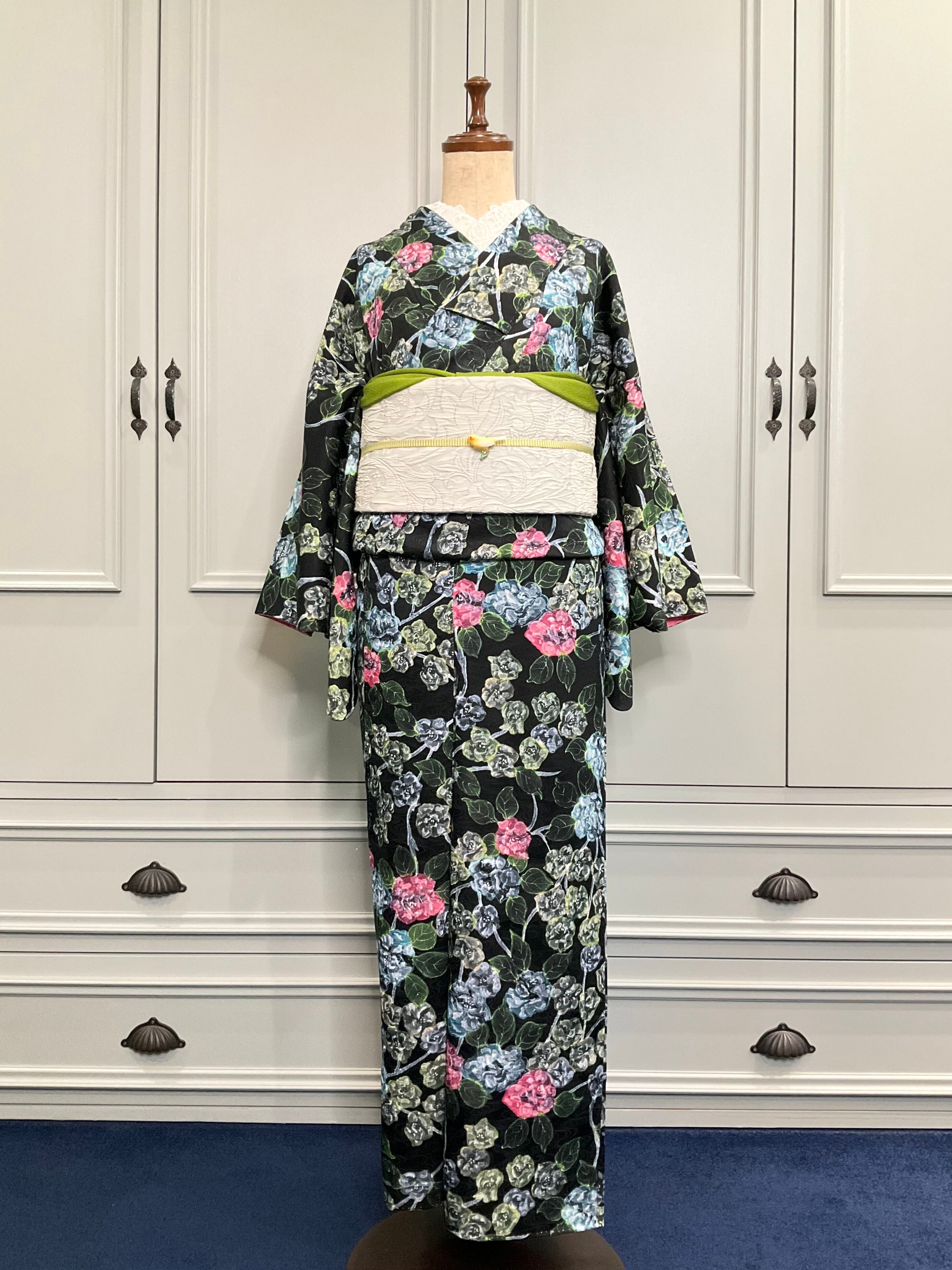 ブラックの地色に、花模様がデザインされた、小紋着物です♪