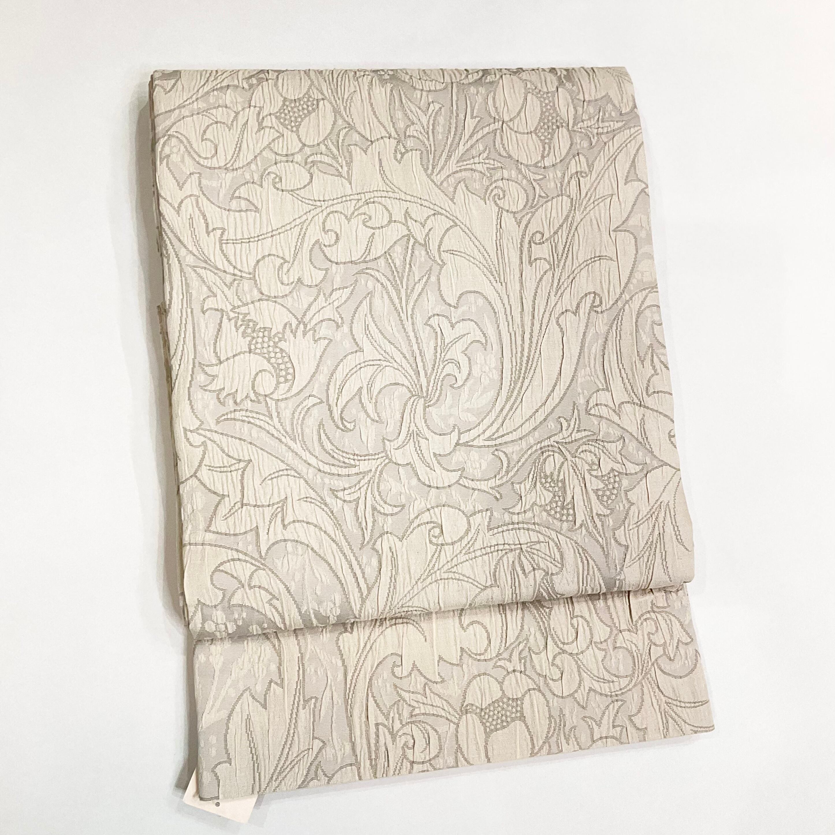 淡いグレー系の地色に、花模様がデザインされた、未使用品の洒落袋帯(全通)です♪