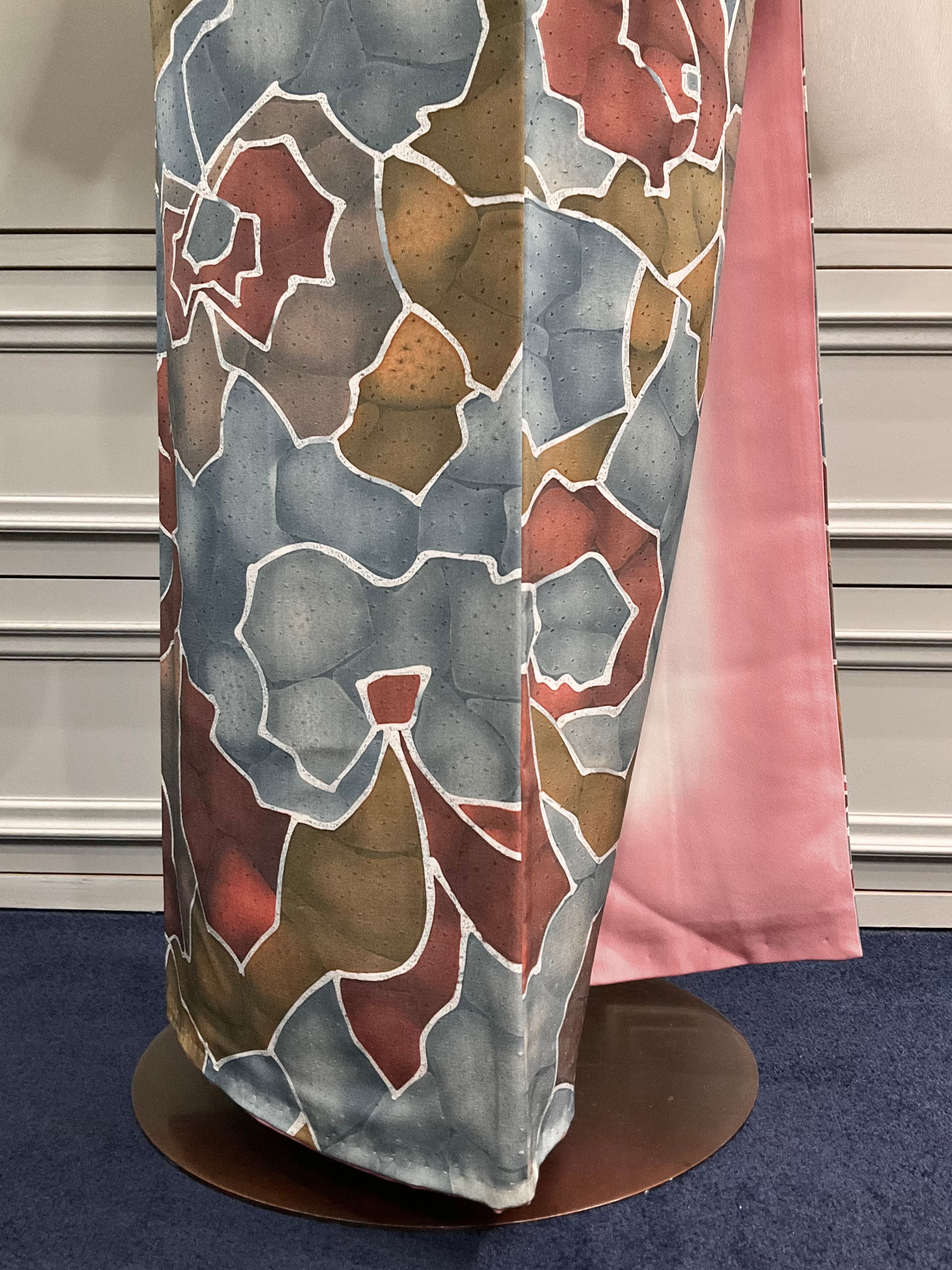 ブラウン系、レッド系、ブルーグレー系を中心としたカラーでデザインされた、モダンな柄の小紋着物です♪