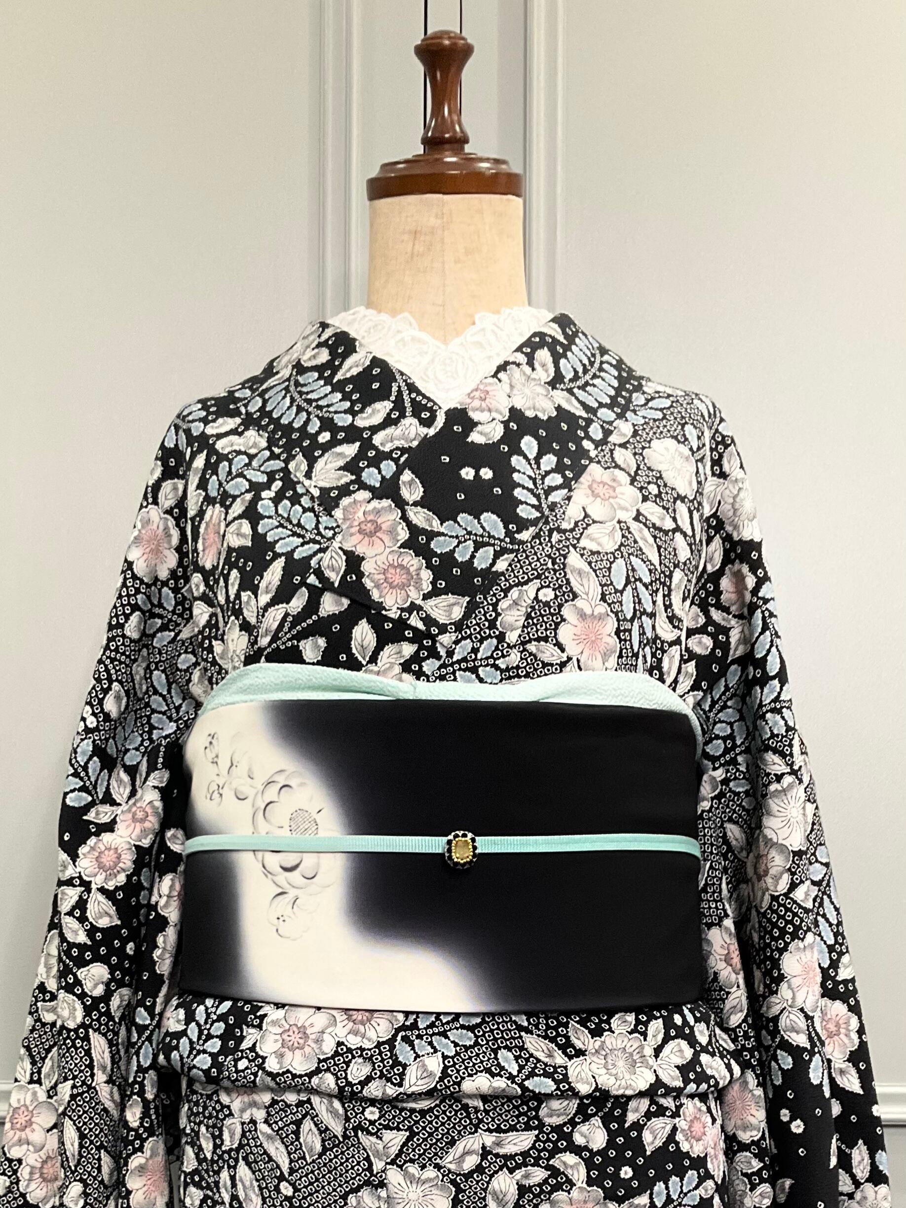 墨で色をつけたようなブラックの地色に、じわっと滲みながら浮かび上がったようなオフホワイト部分には、繊細なタッチの辻が花テイストの花模様が、上品に描かれています^^