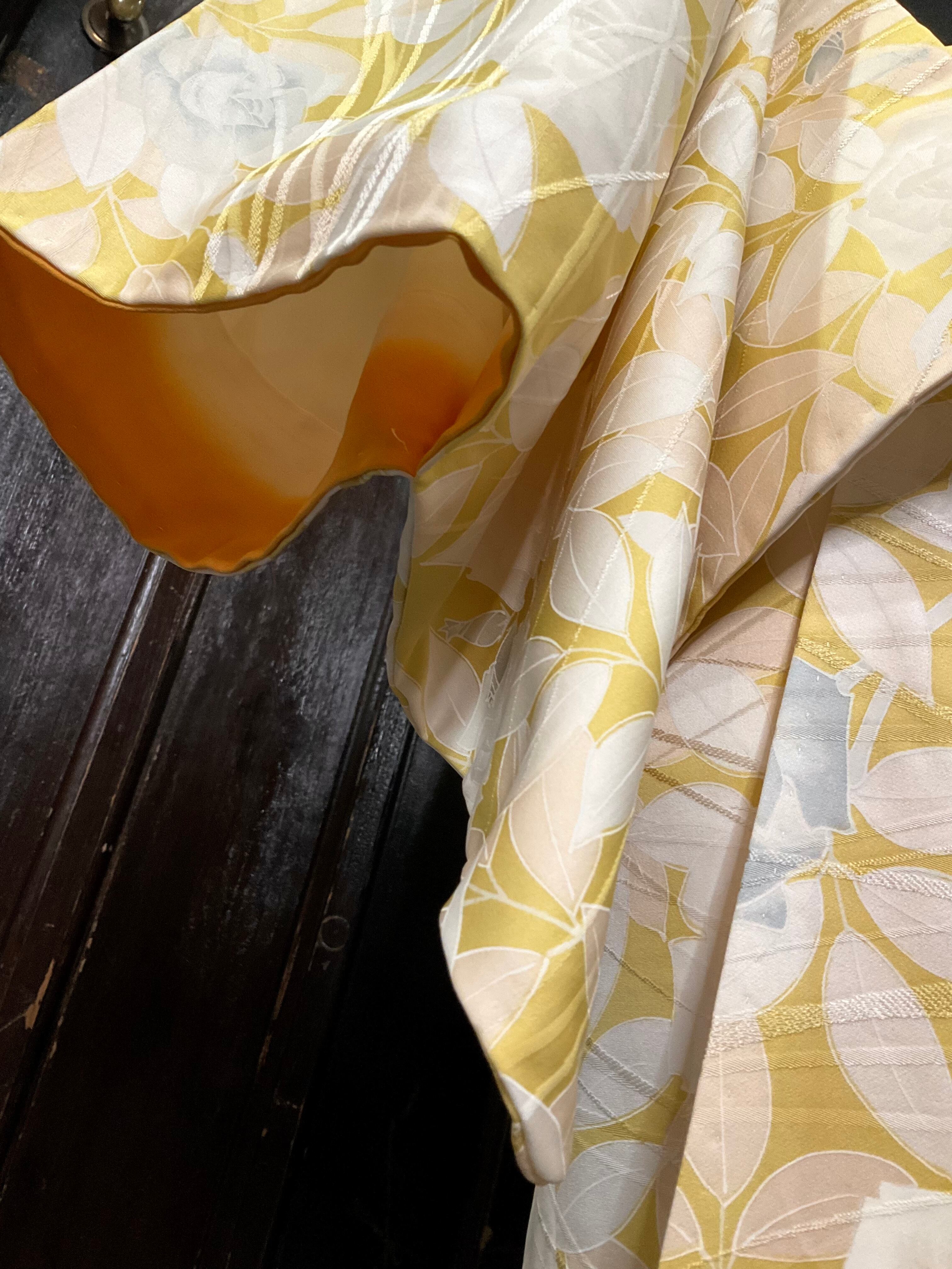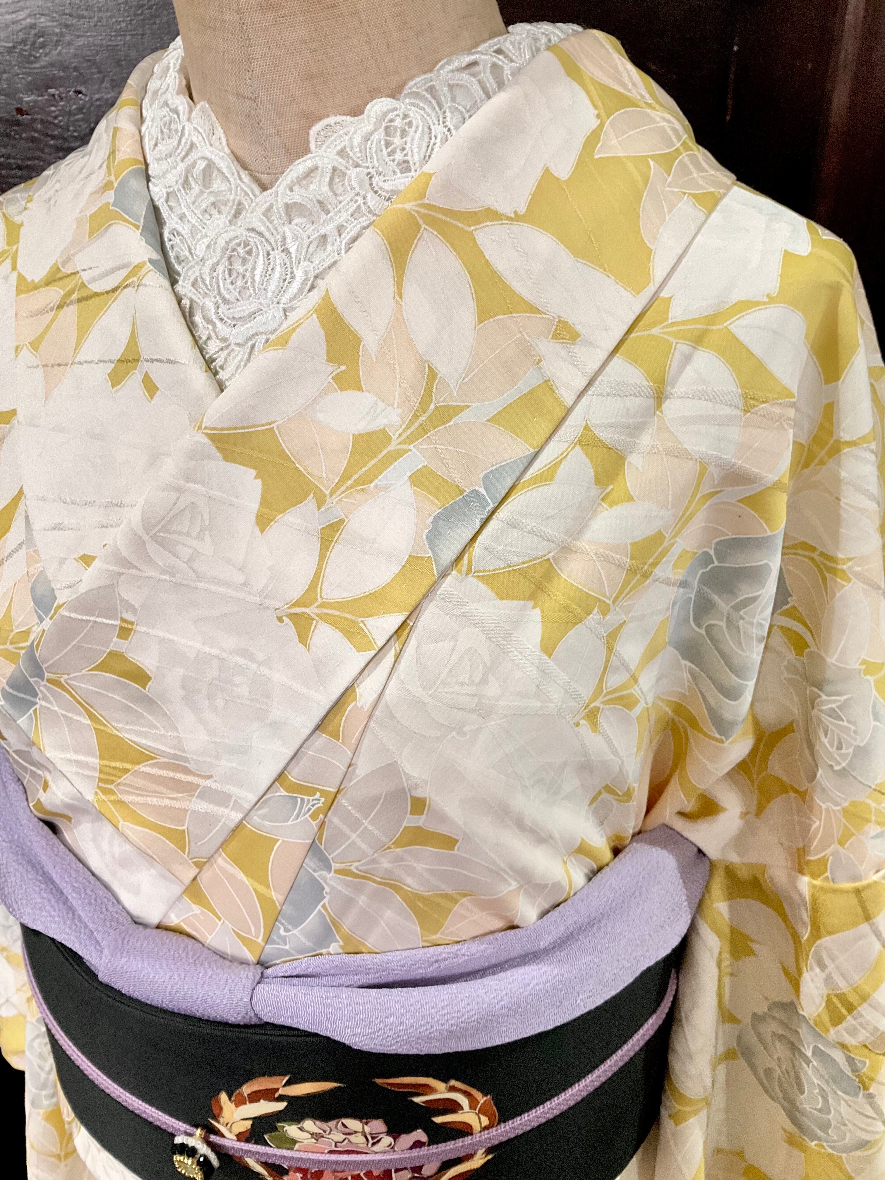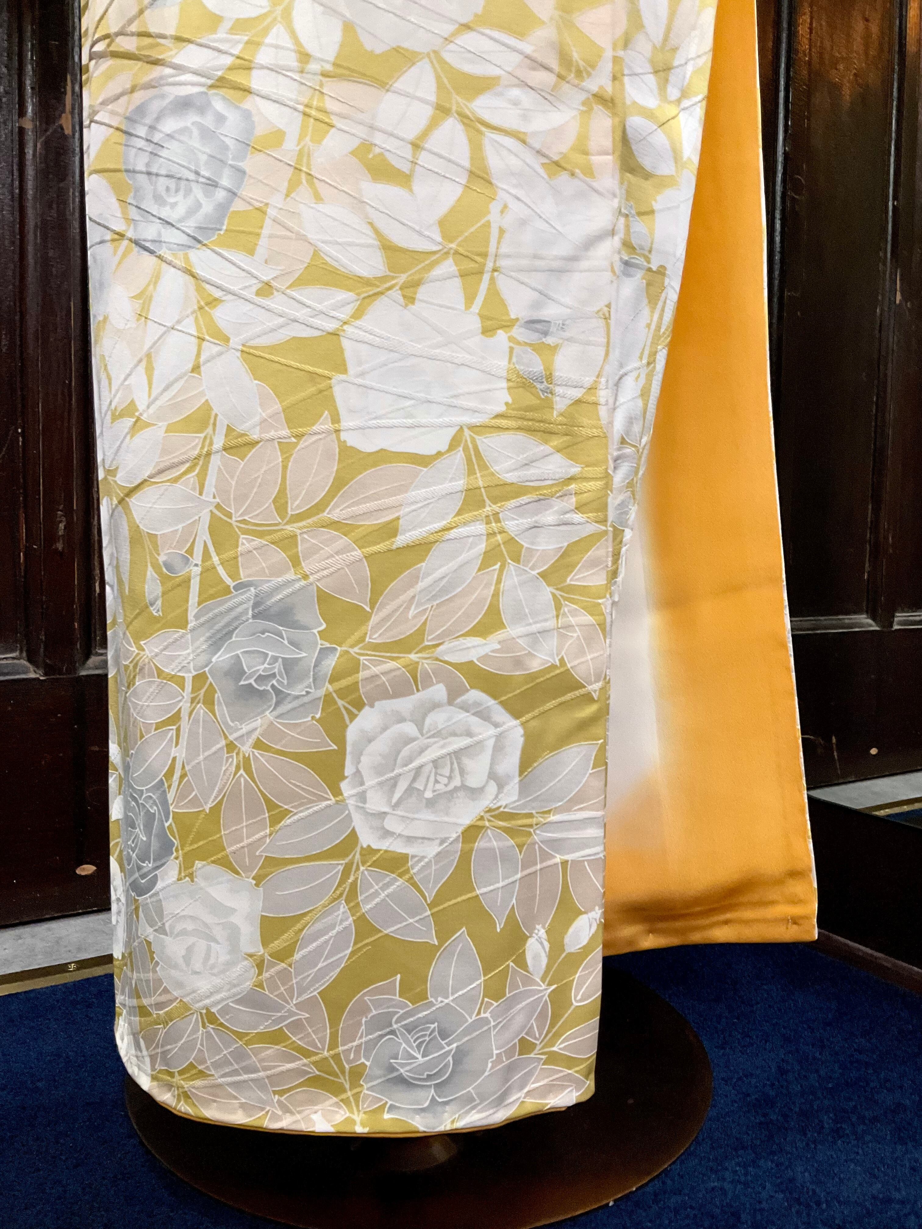 やわらかなイエローの地色に、ホワイトやグレー系で彩られた薔薇の花模様たちが、とても綺麗なこちらのお着物。