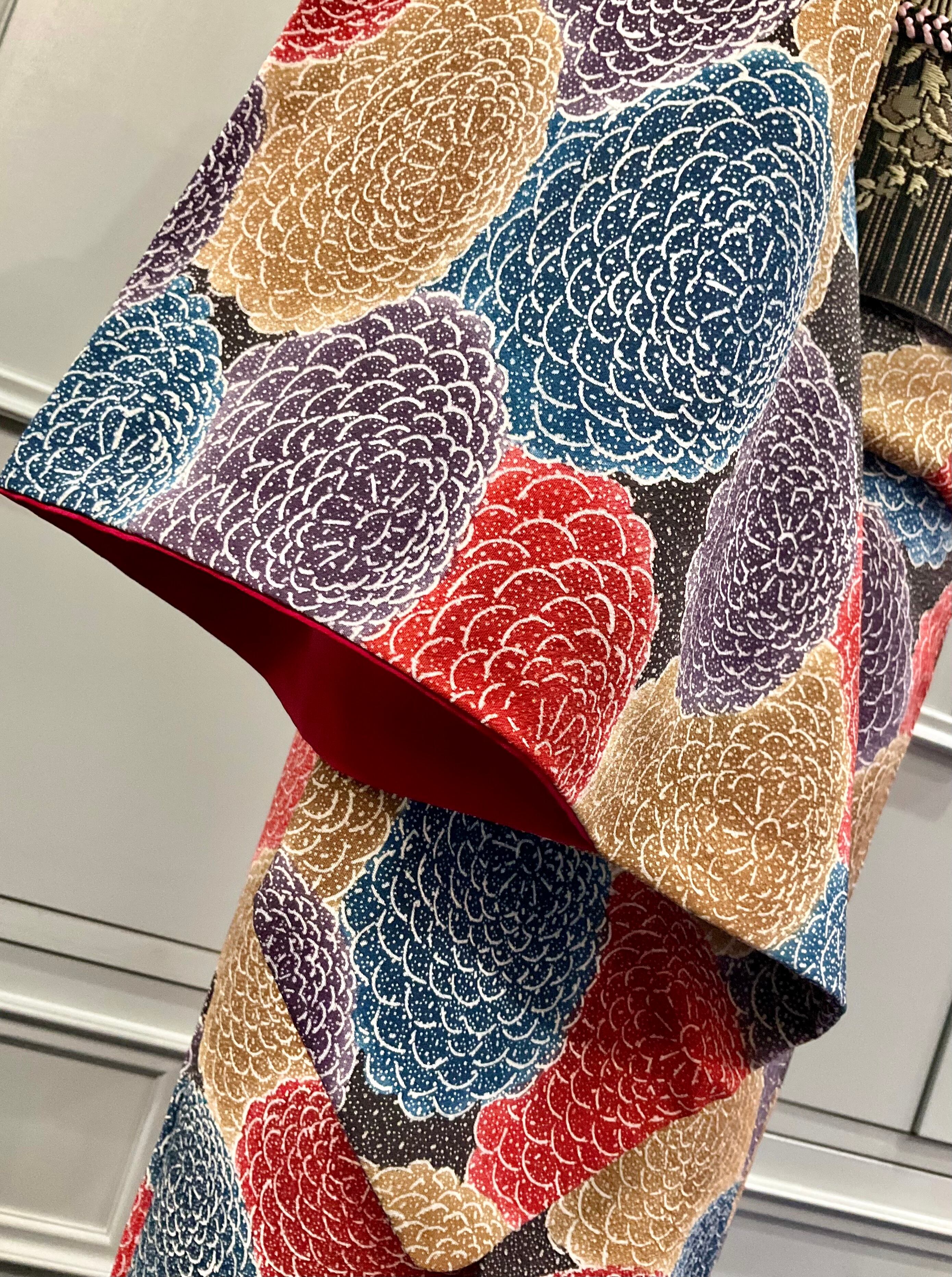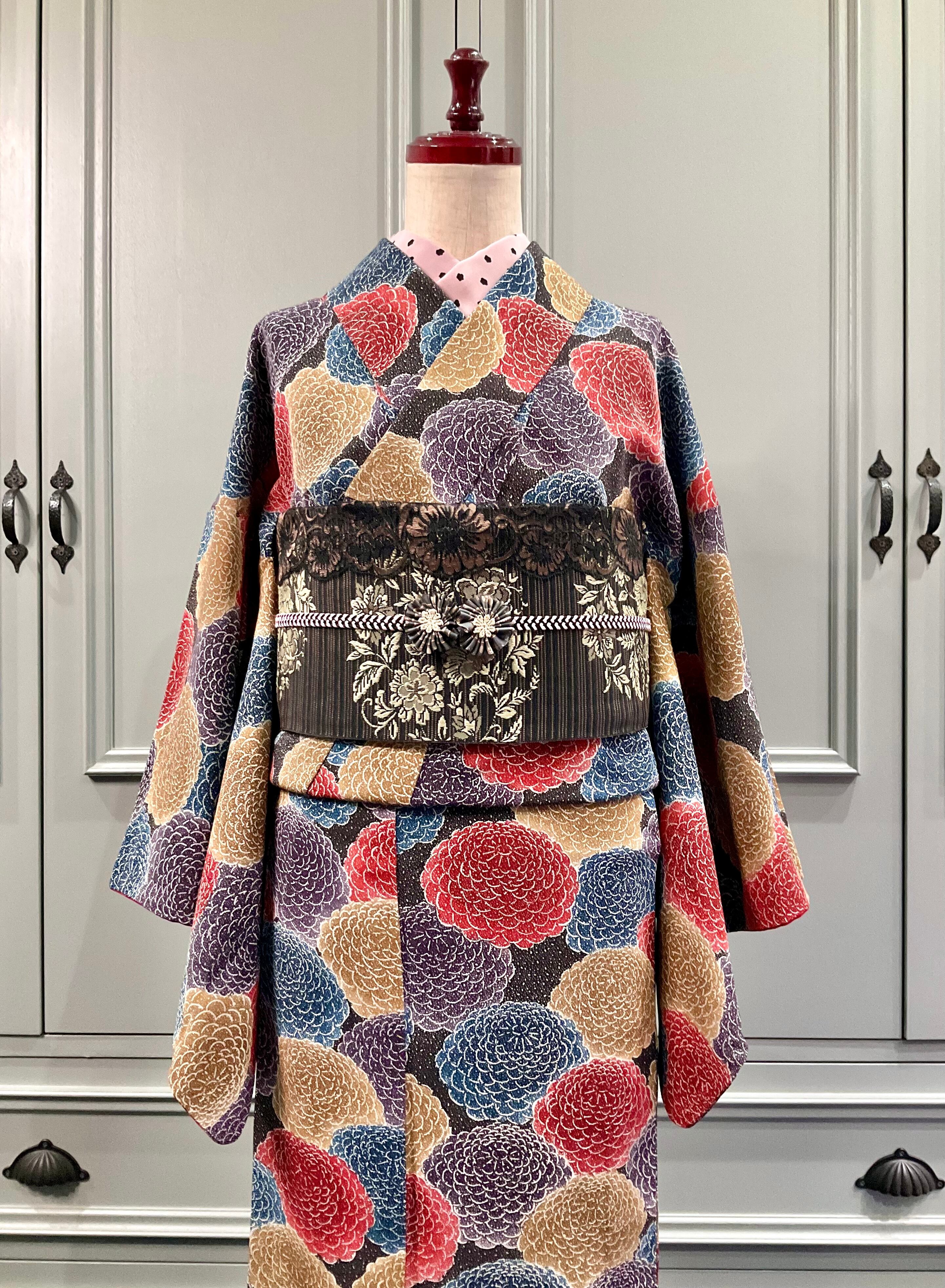 黒地に色とりどりのまあるい菊の花が咲いていて、全体に霧がかったような模様が綺麗なリサイクル小紋着物です♪