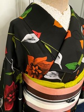 ブラックの地色に、暖色系の花模様がオシャレな、小紋着物です♪