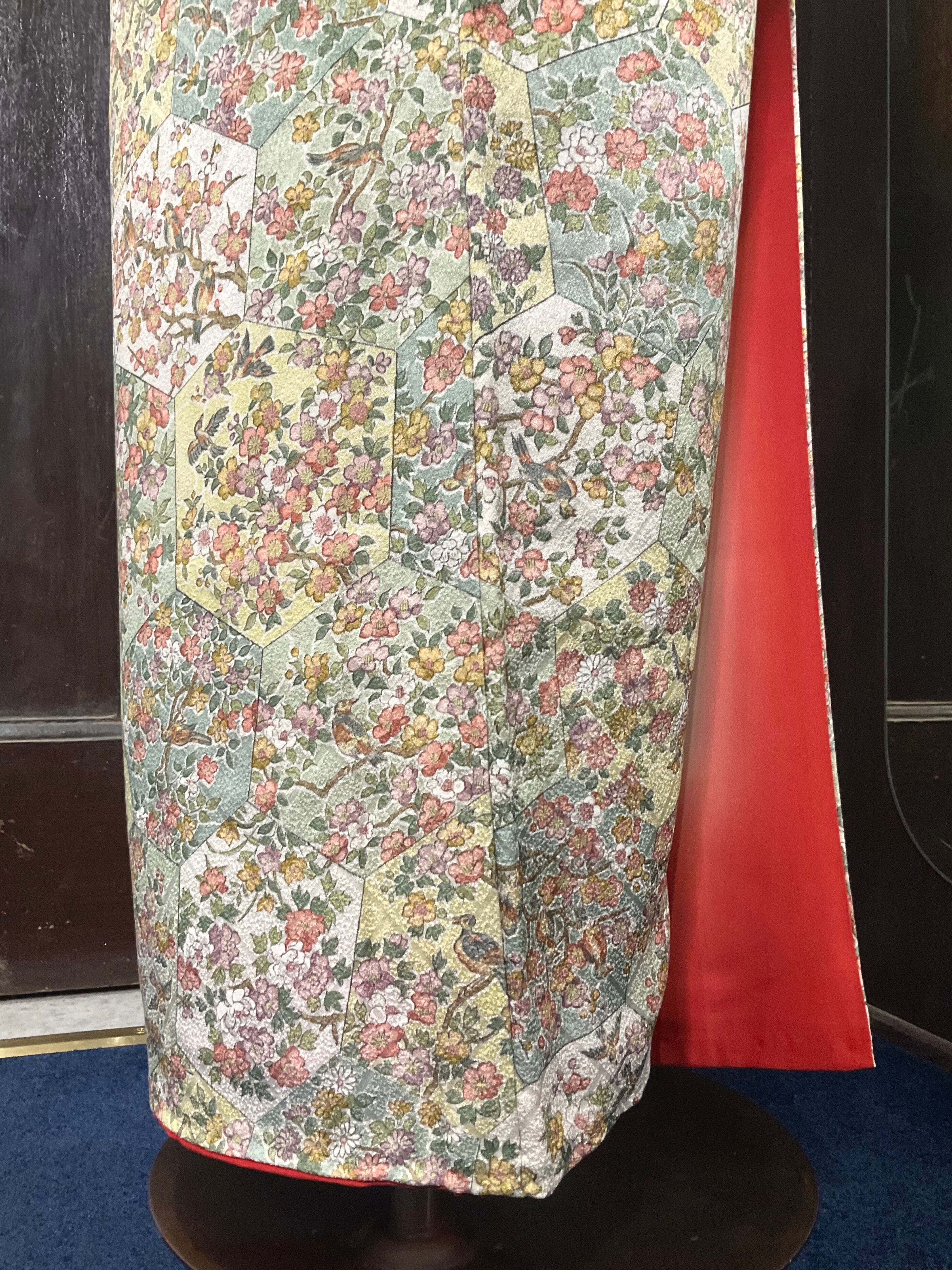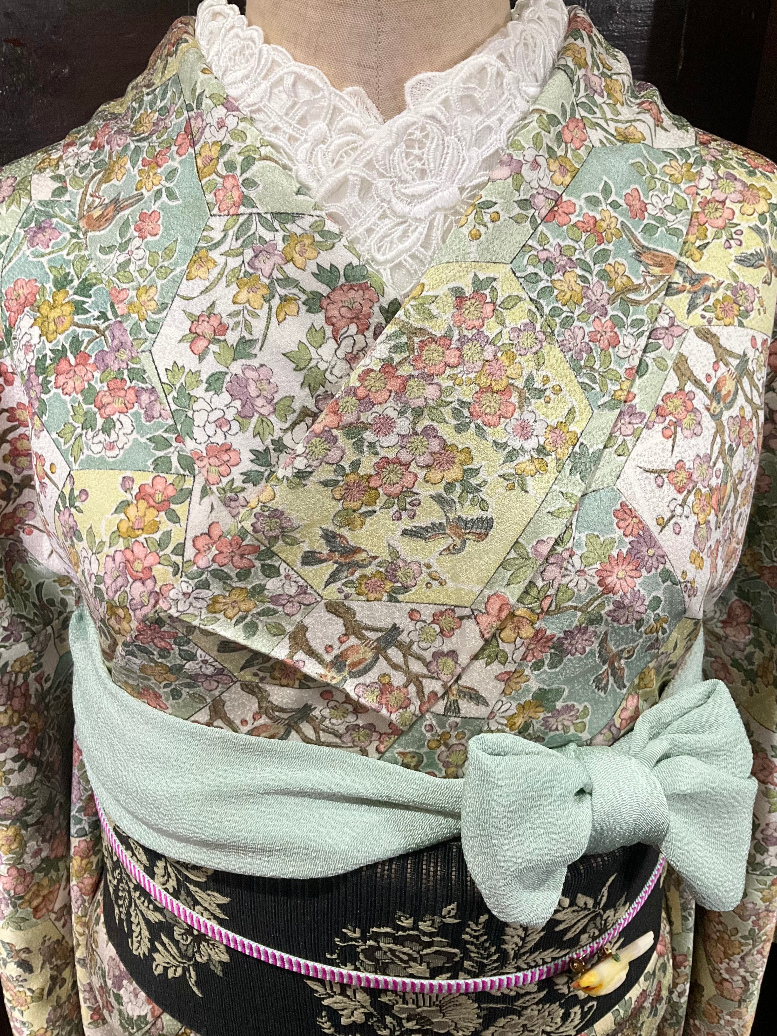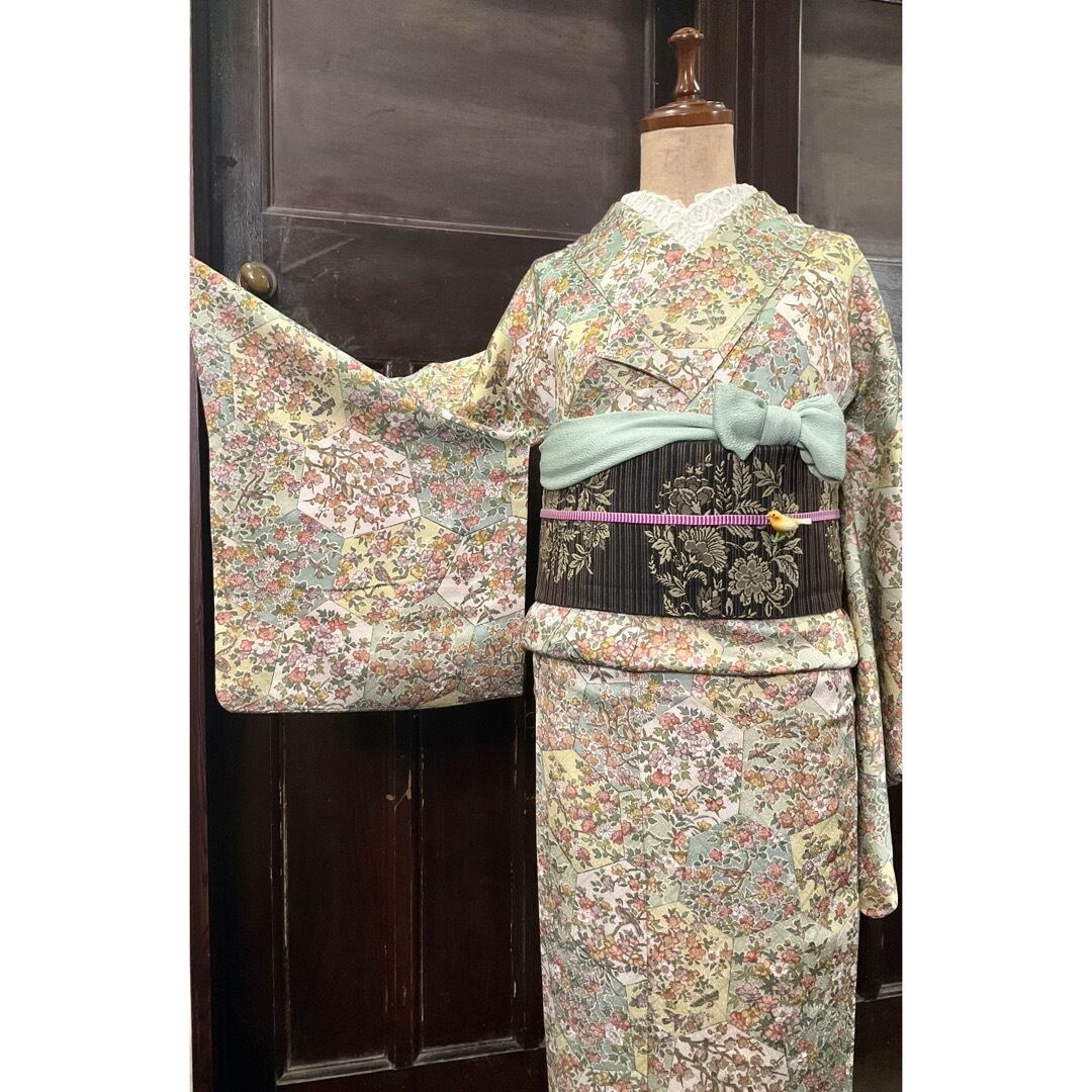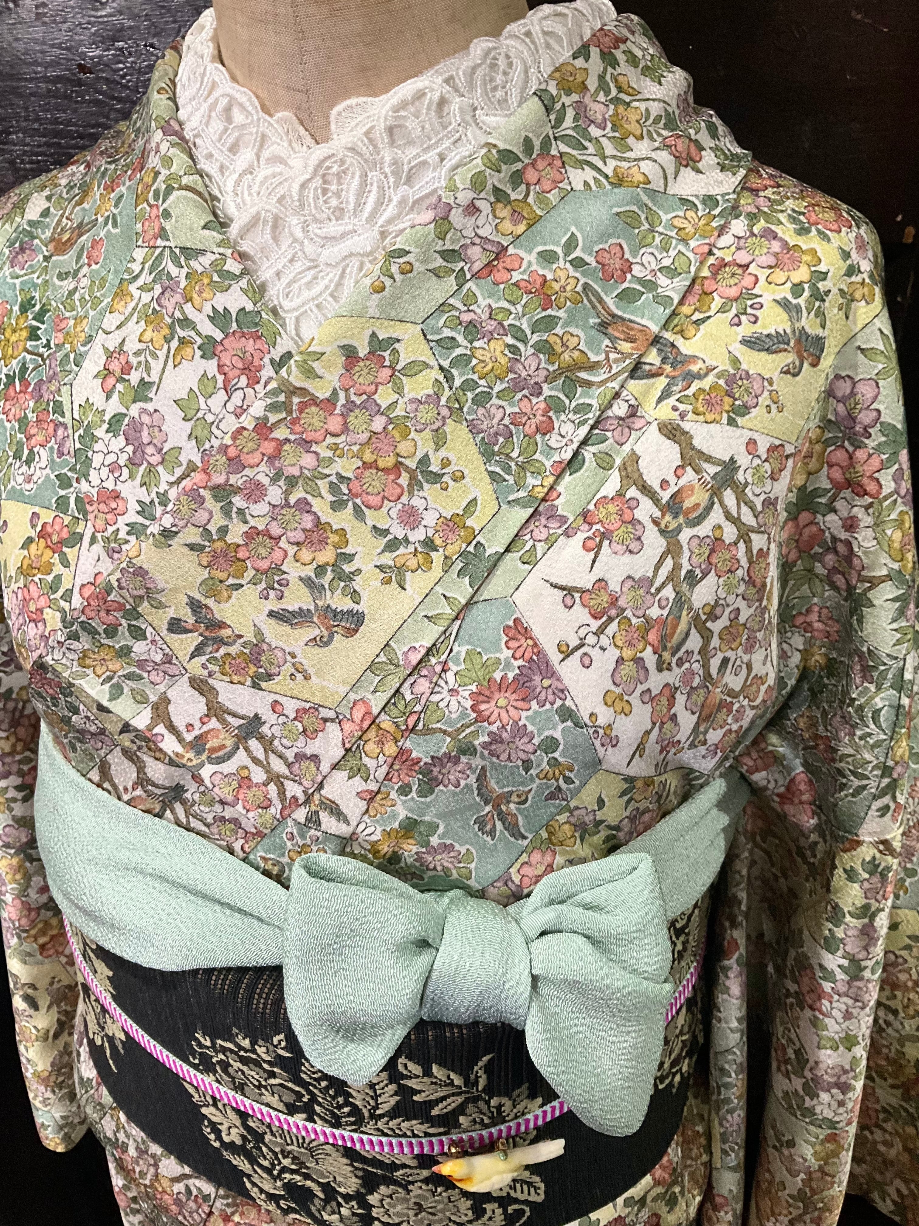 六角形の中に、さまざまな花模様や小鳥さんがデザインされた、小紋着物です♪