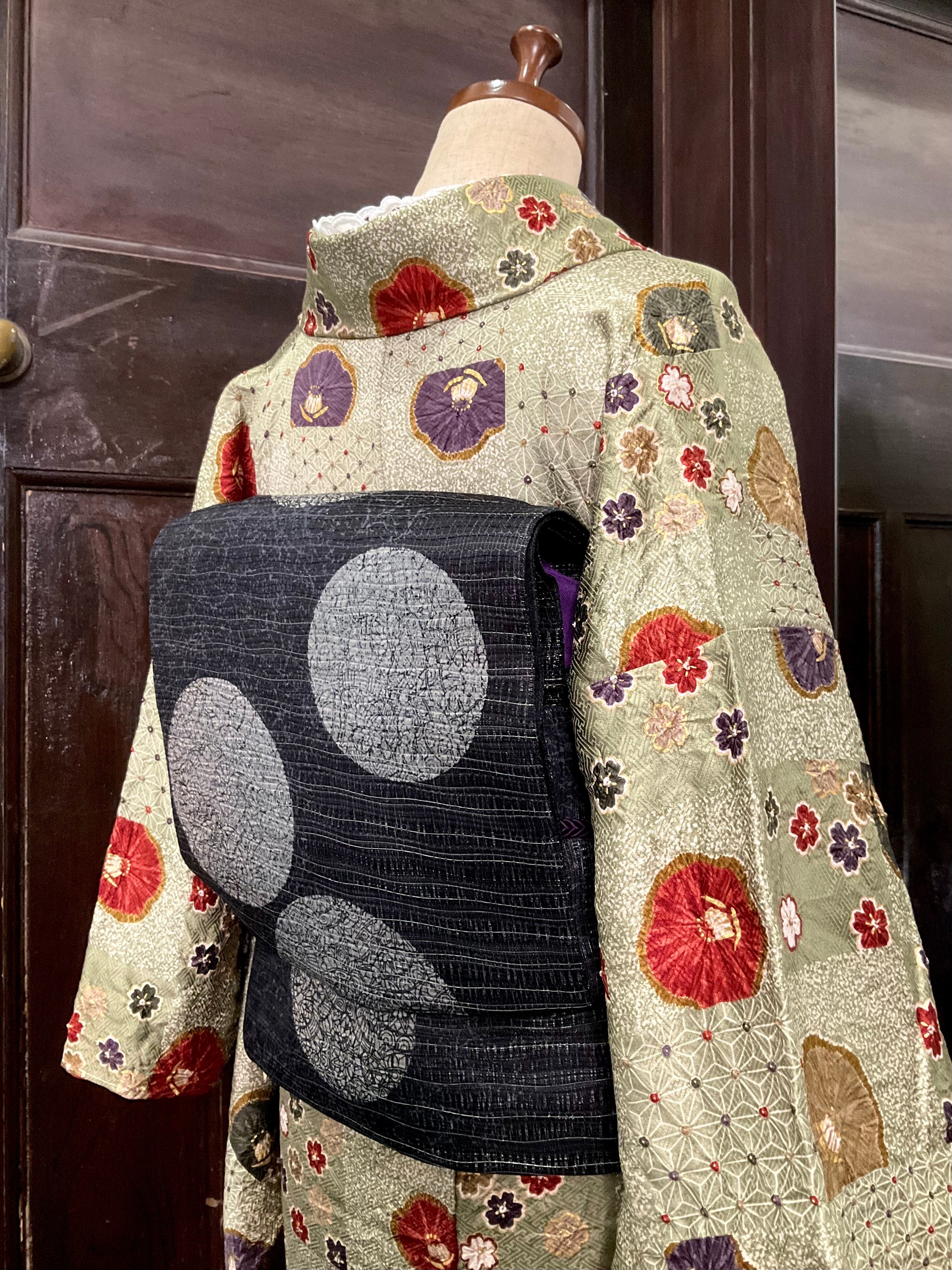 ブラック系の地色に、大きめのサークル模様がモダンなデザインの、洒落袋帯です♪