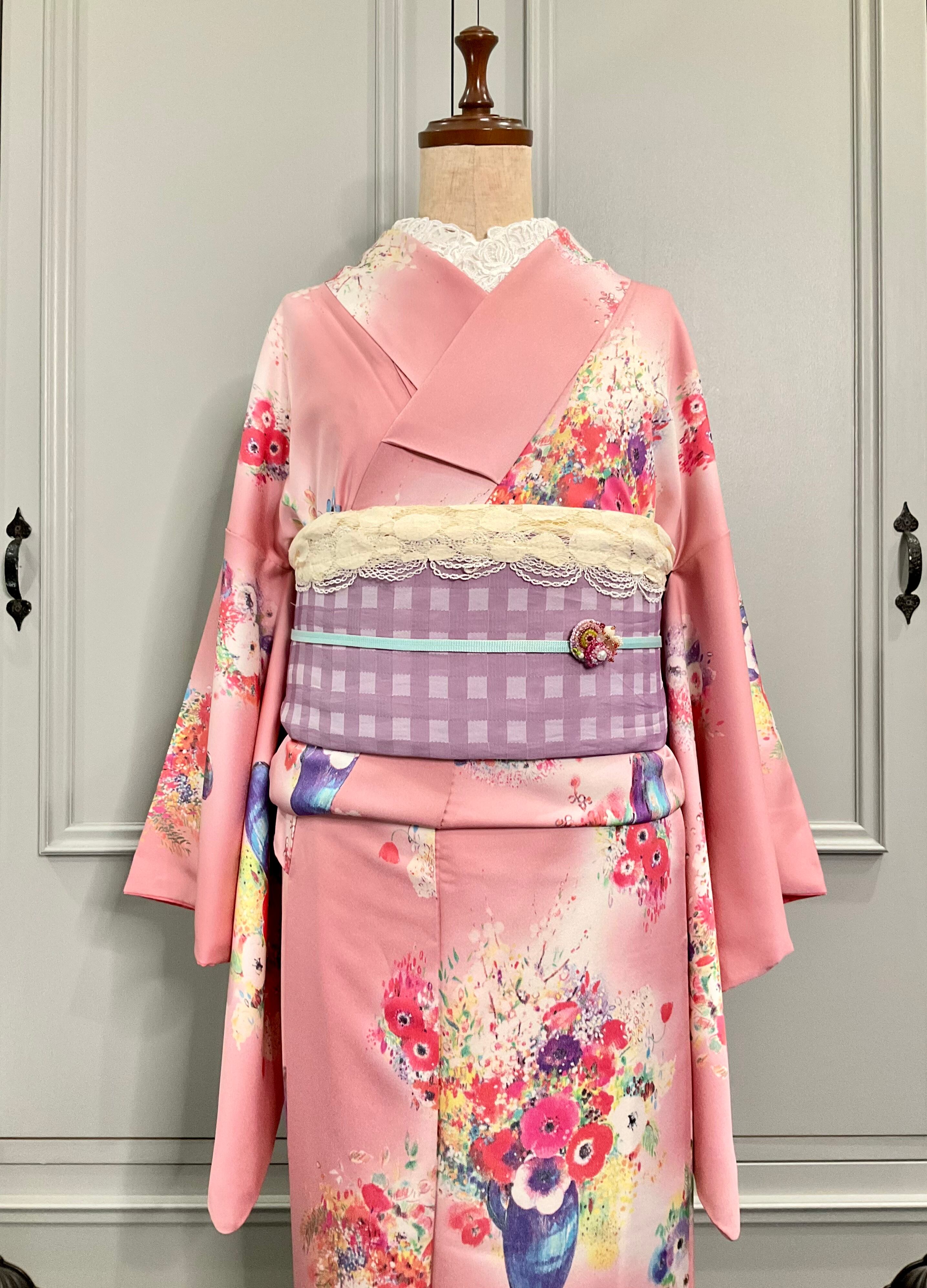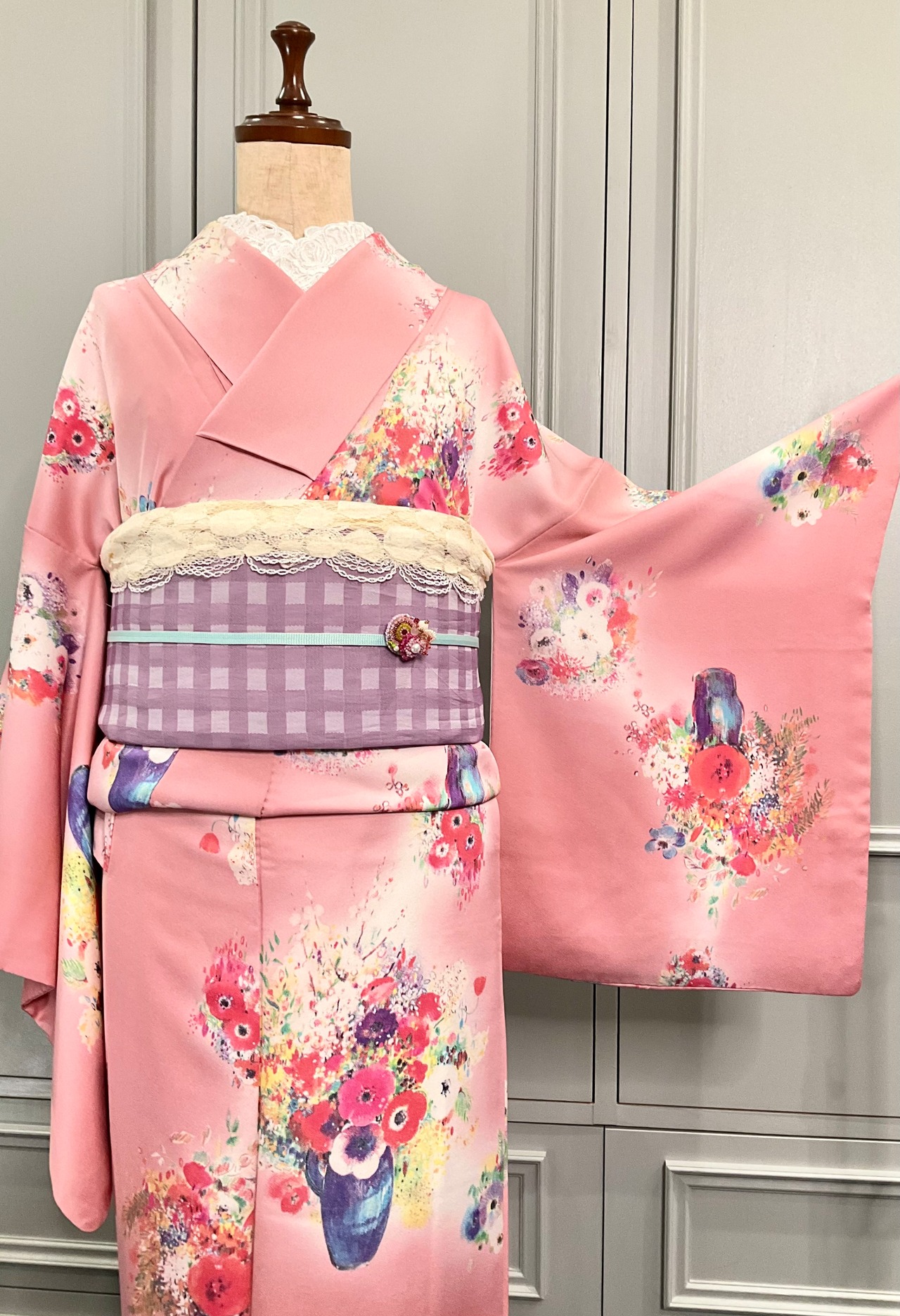 花束みたいな色とりどり、たくさんのお花が花瓶に飾られたデザインが少し珍しい、こちらのお着物。