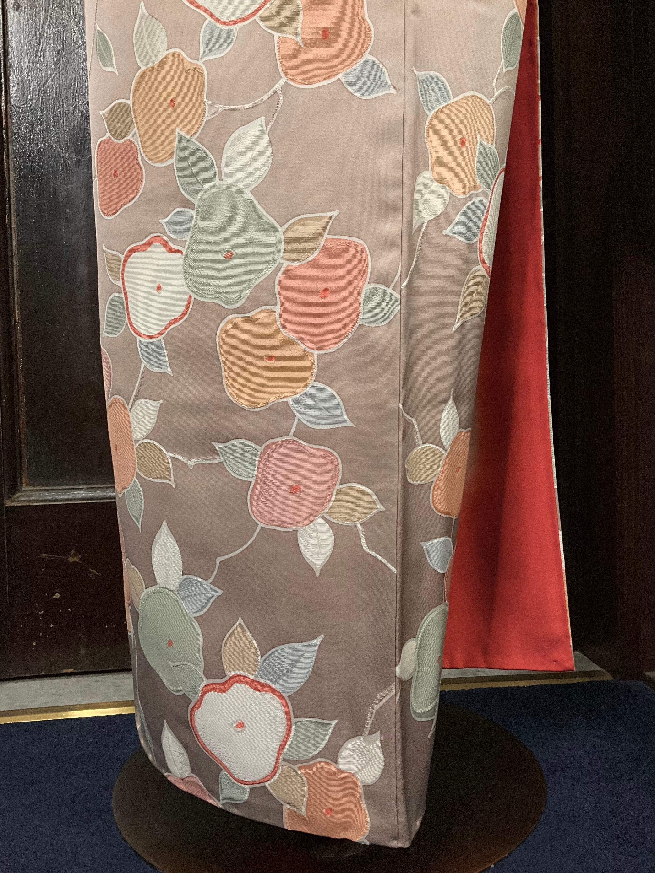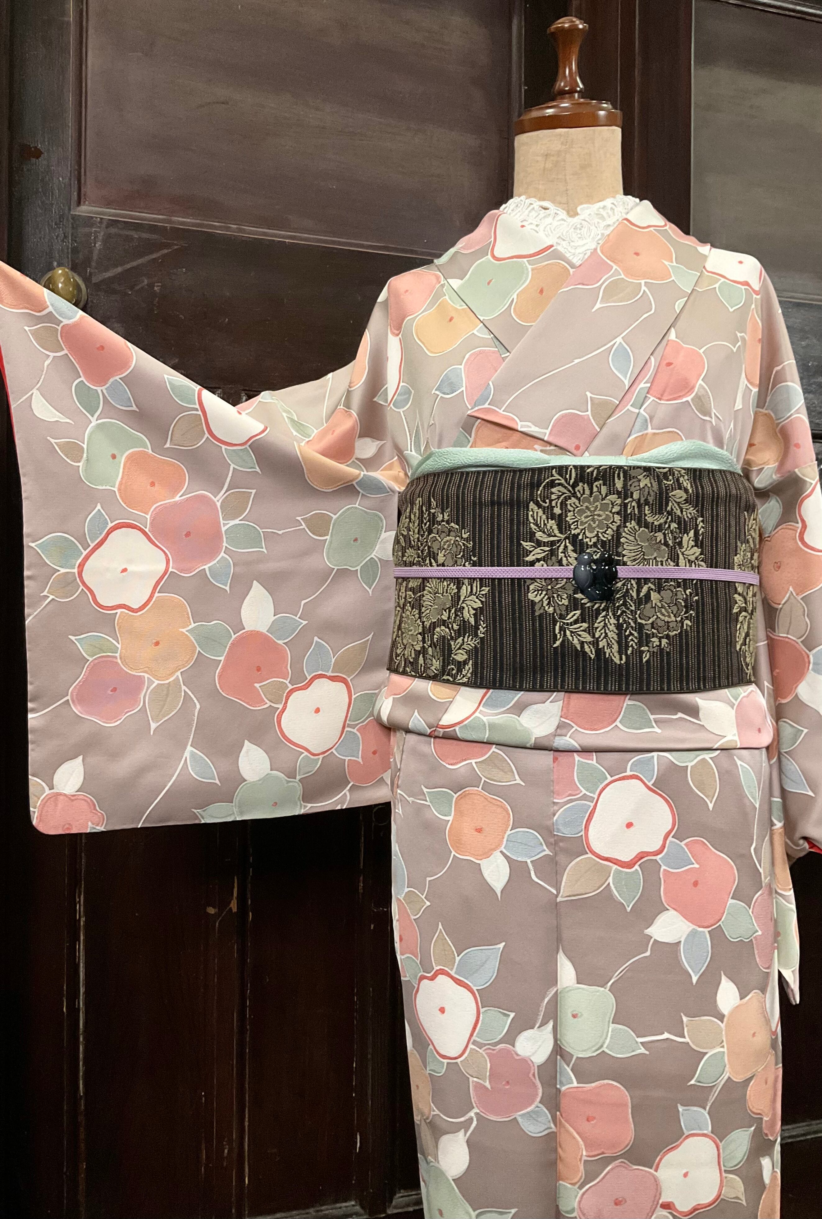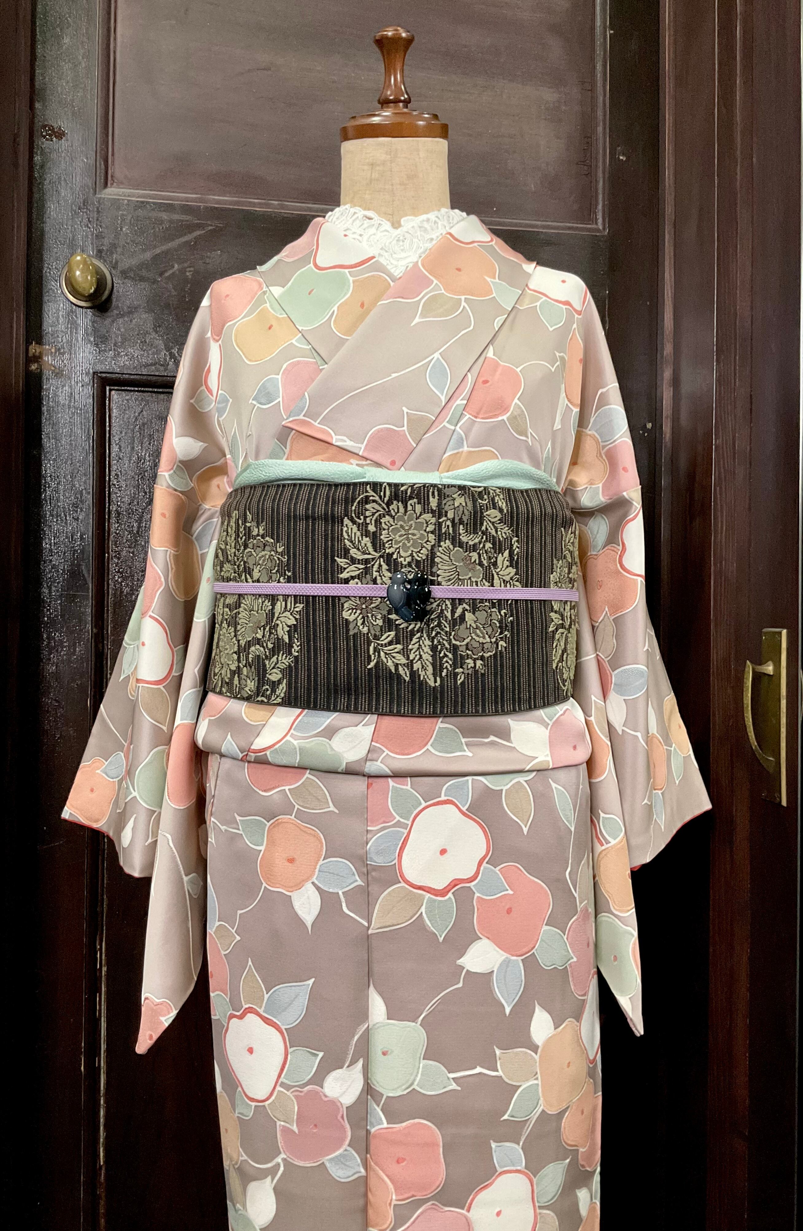 グレージュ系の地色に、抽象的にデザインされた、椿の花模様が素敵な小紋着物です♪