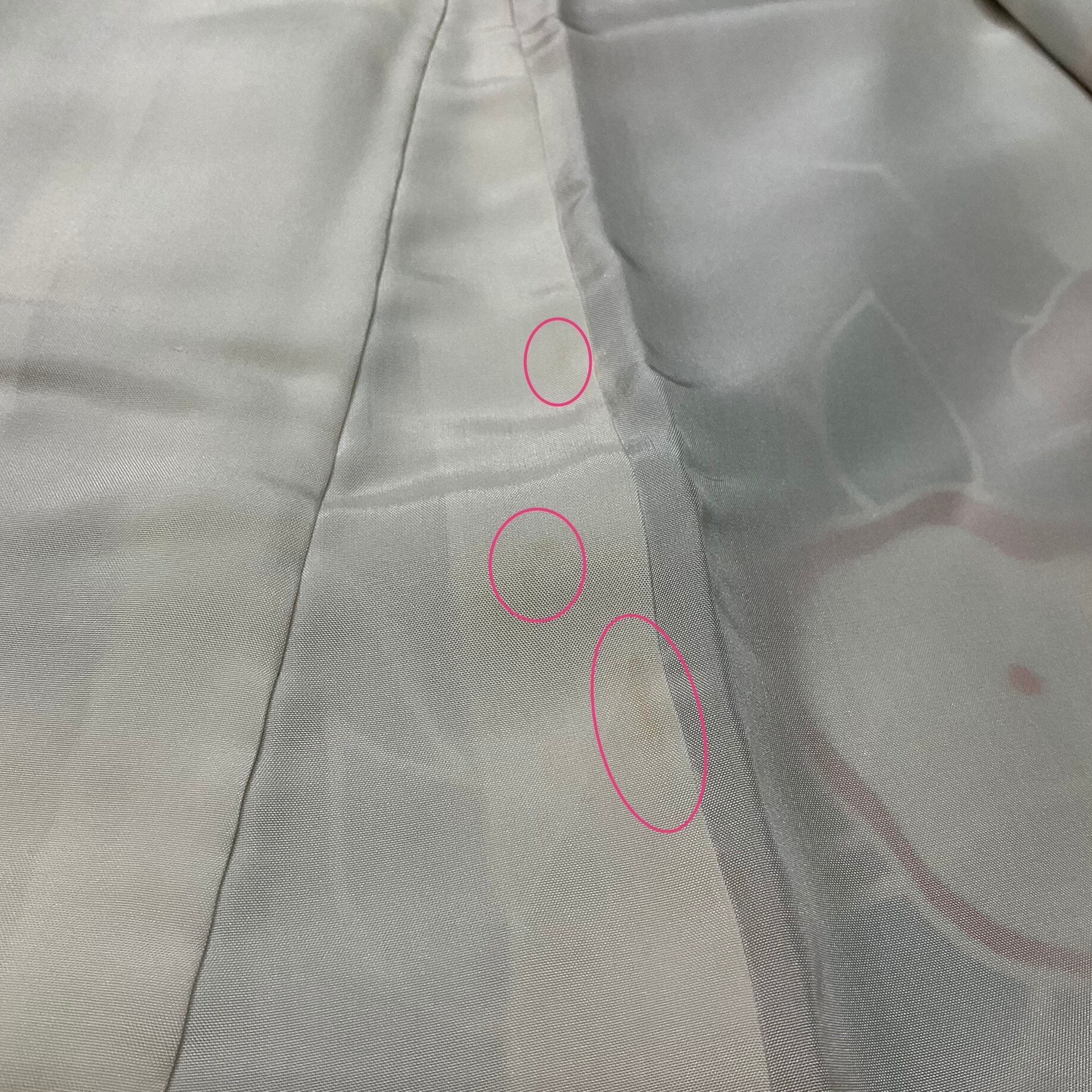 胴裏・八掛部分(主に衿や衽あたり)に、目立ちにくいですが、うっすら複数の変色有り。