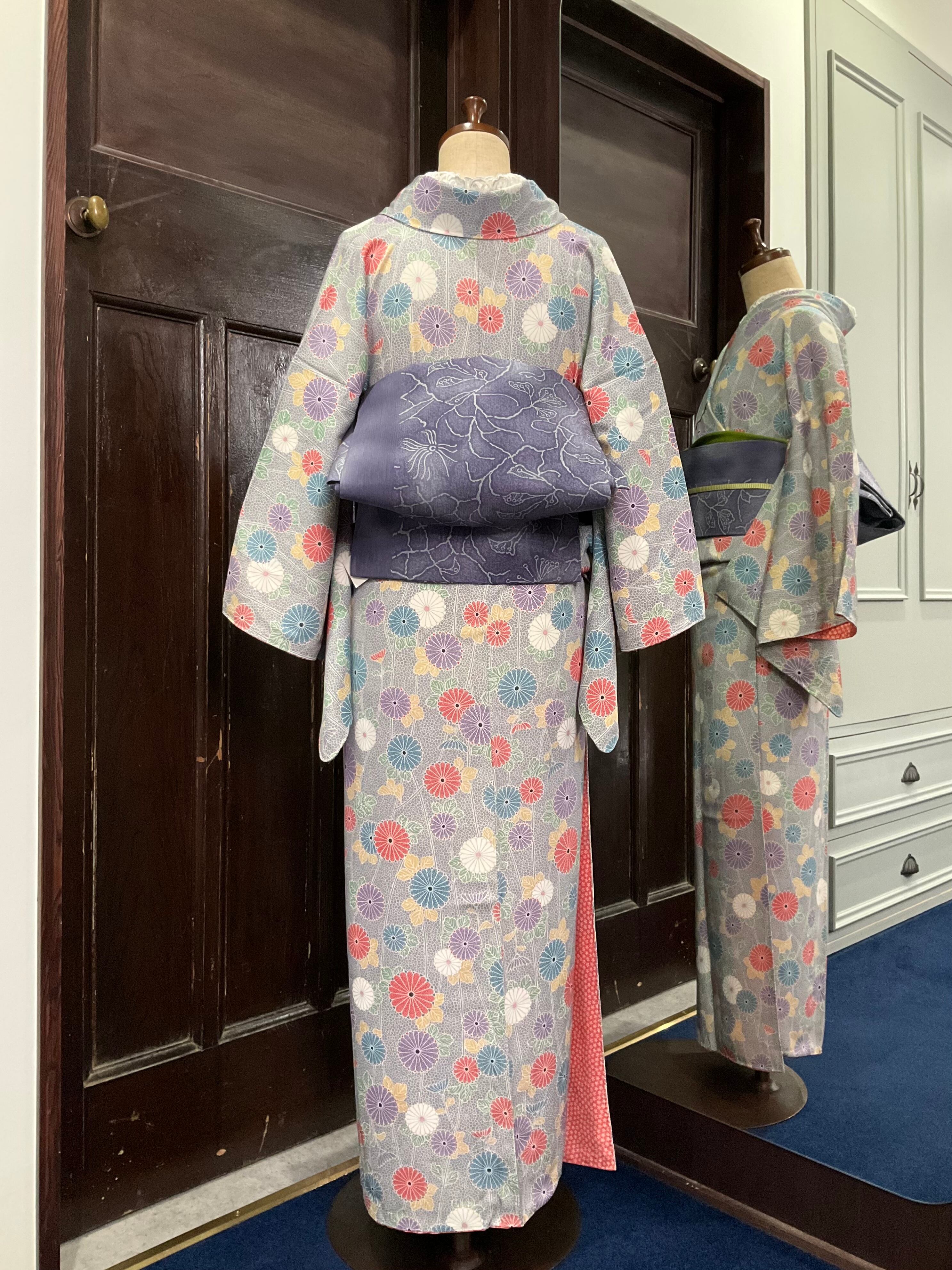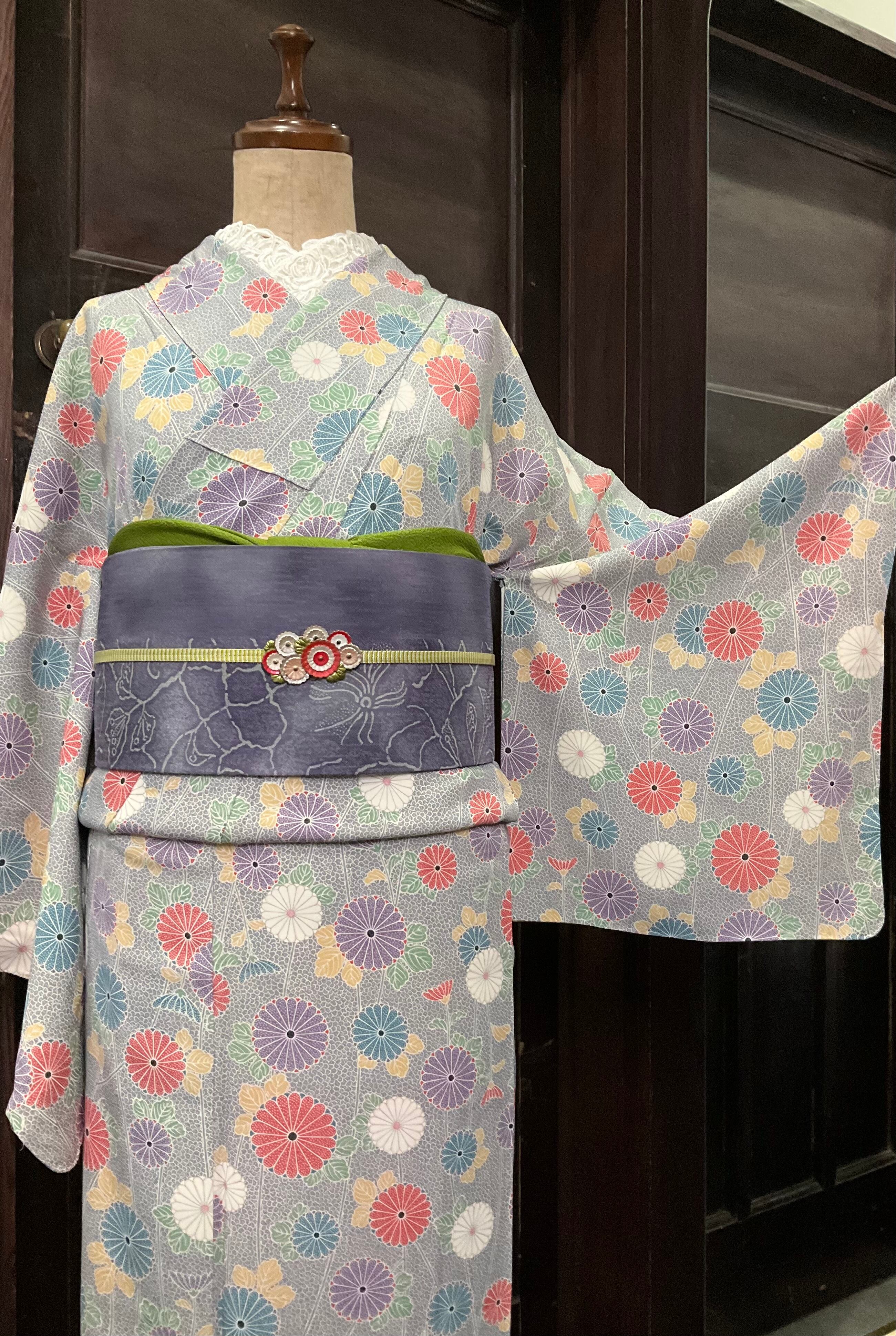 グレーの地色に、菊の花模様がデザインされた、小紋着物です♪