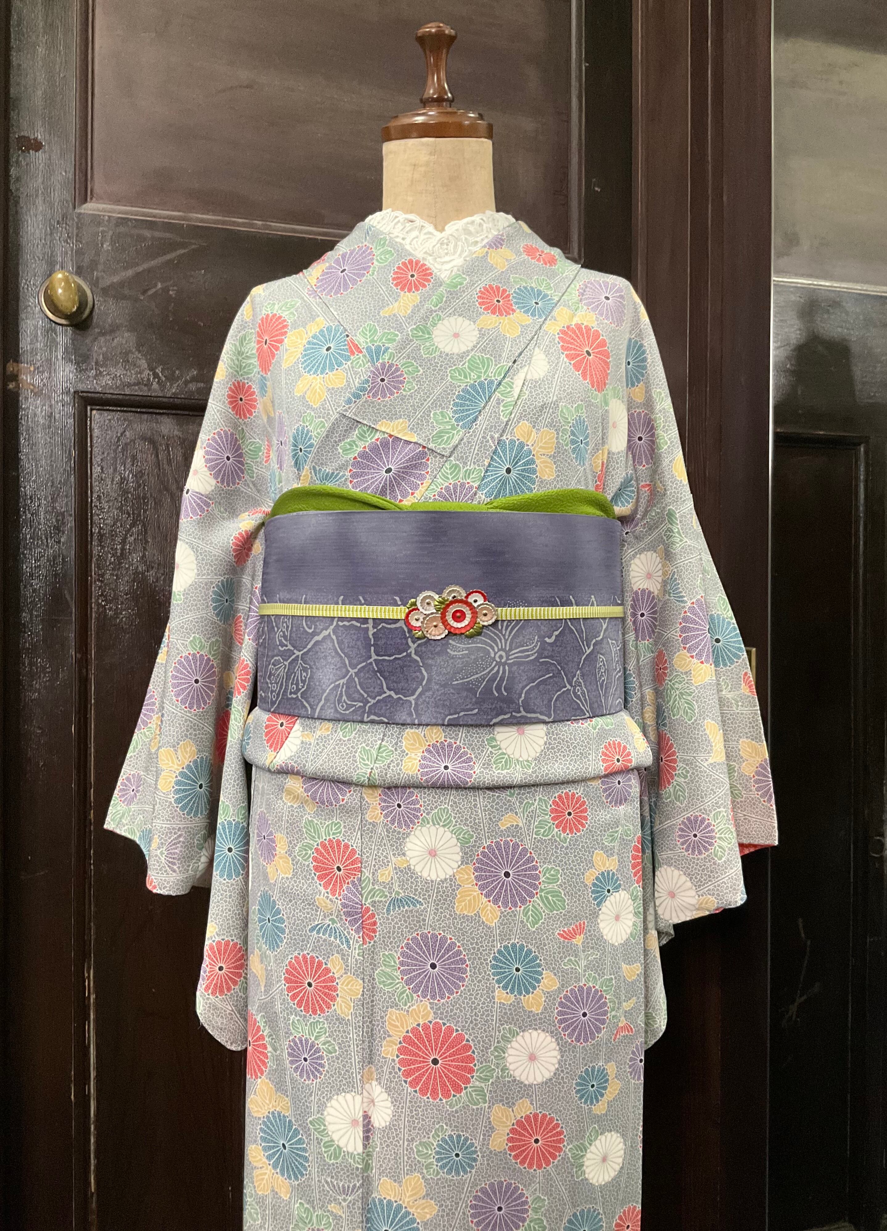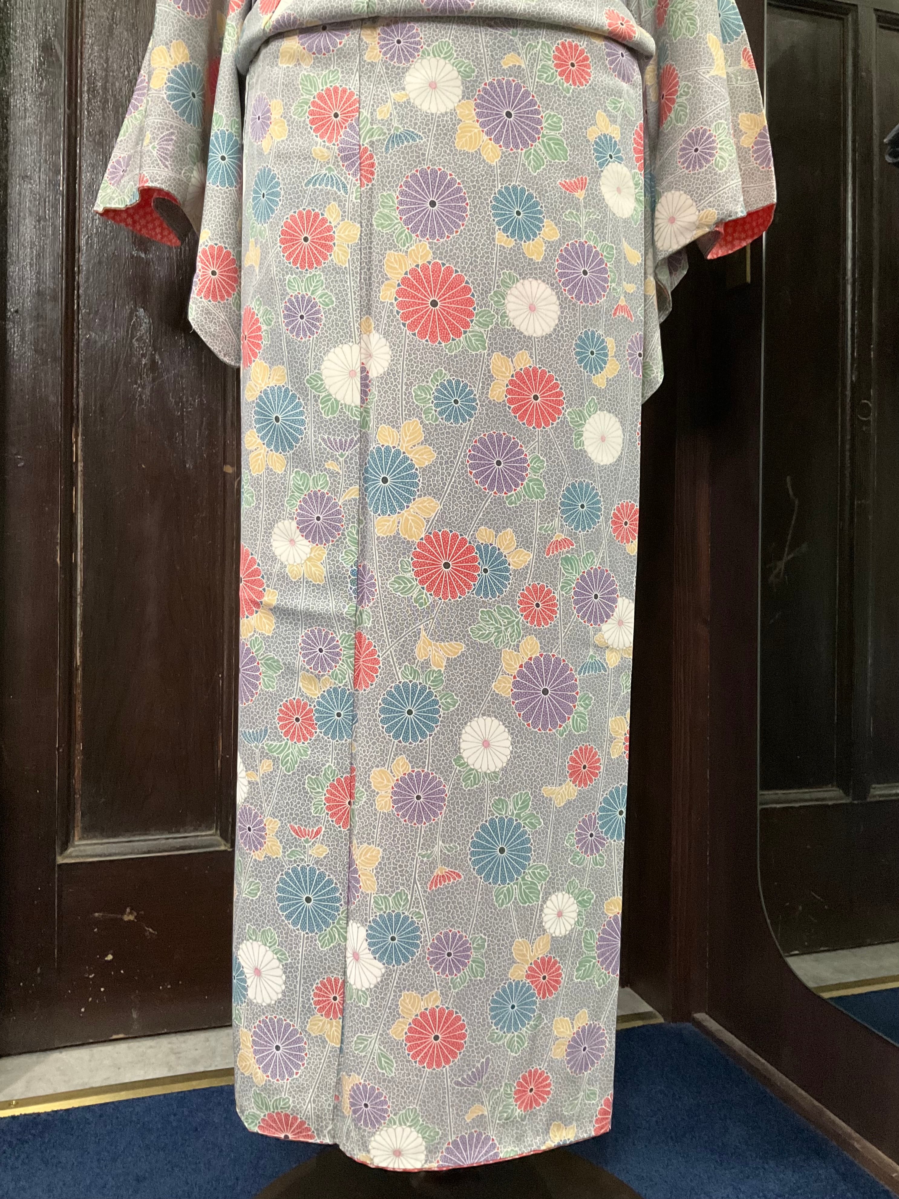 菊の花に見とれて Gray*リサイクル小紋キモノ A051