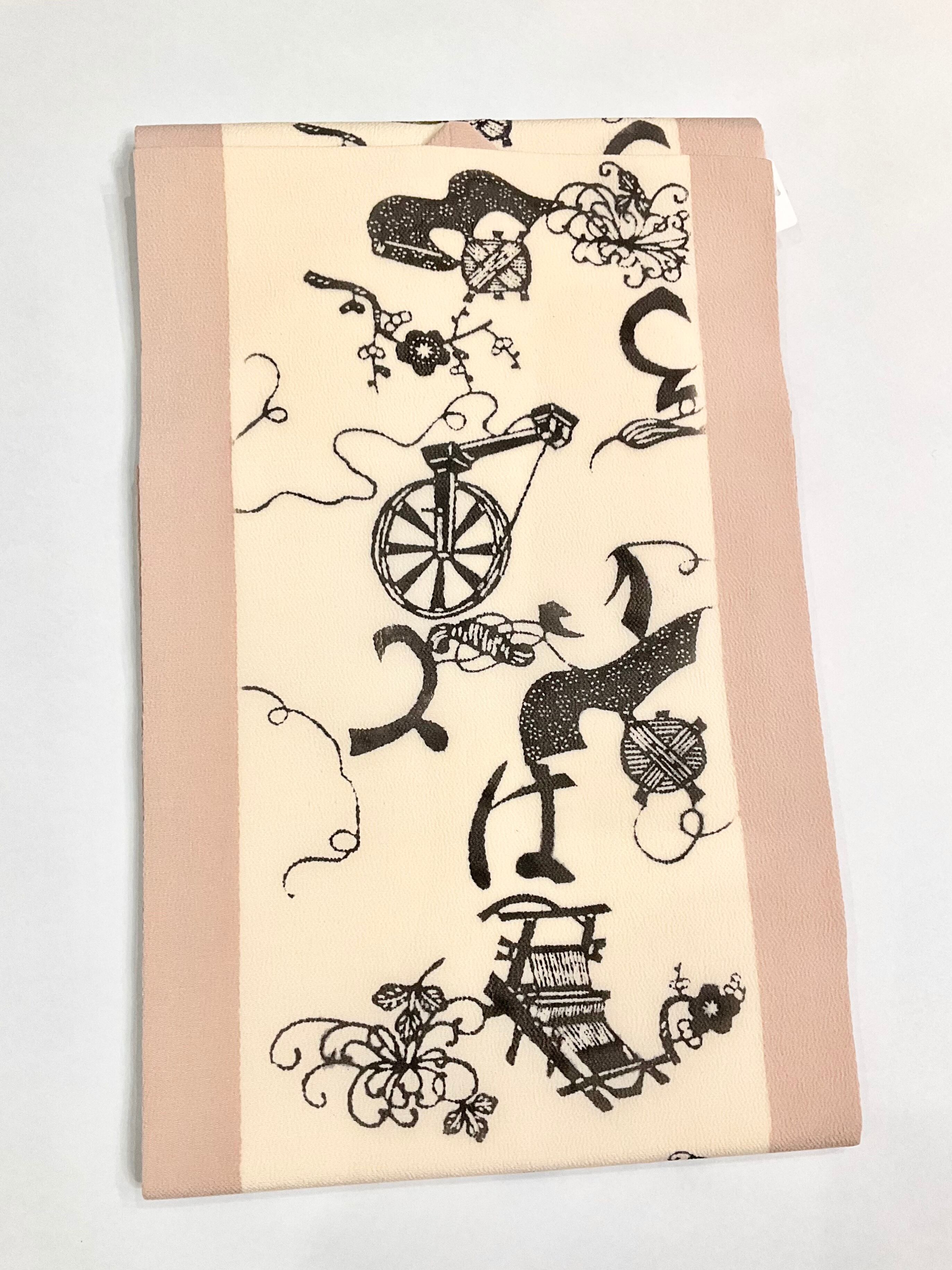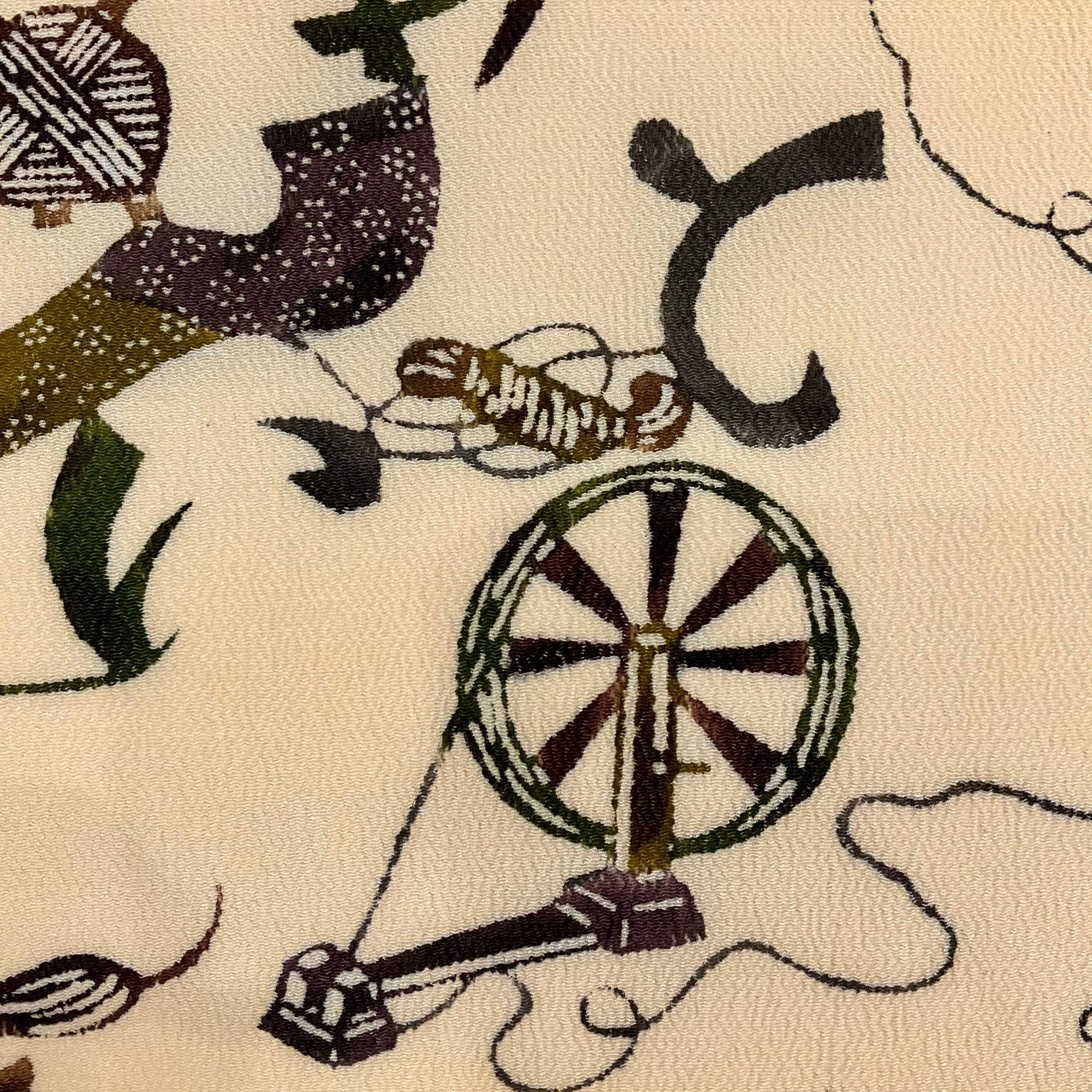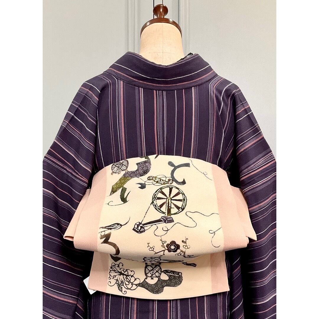 糸巻きや糸車、そして機織り機…と、生地になるまでの流れがわかるようなデザインが少し珍しいこちらの名古屋帯。