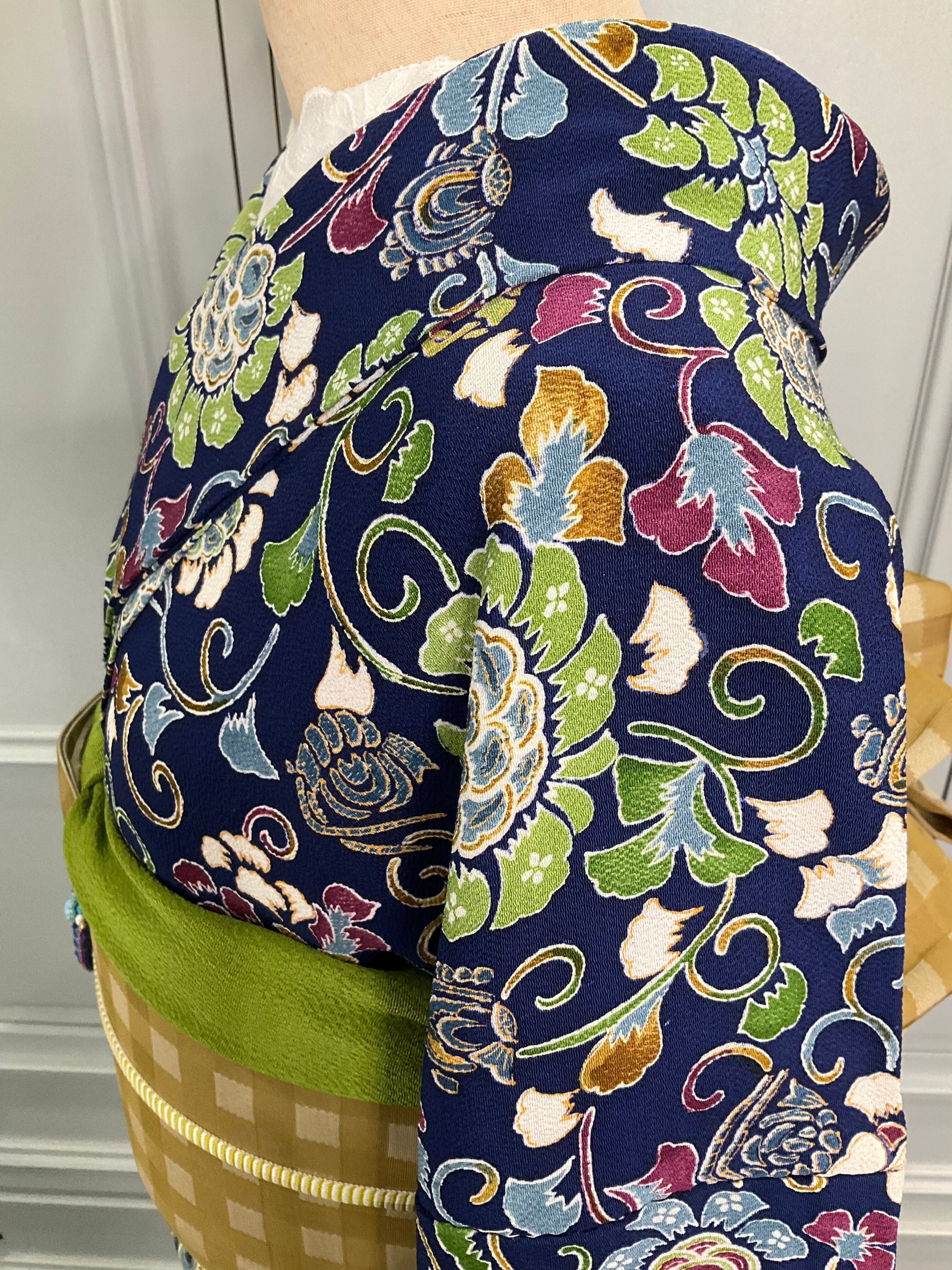 グリーン系やパープル系、オーカーやブルー系にホワイトなど、パッと目を引くお色味で彩られた花模様が、濃いめの地色によく映えて、華やかですよね✨