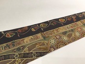 グリーン系の地色と、ブラウン系×ブラック系のラインが左右に入った、バティック調のデザインが素敵な、名古屋帯です♪