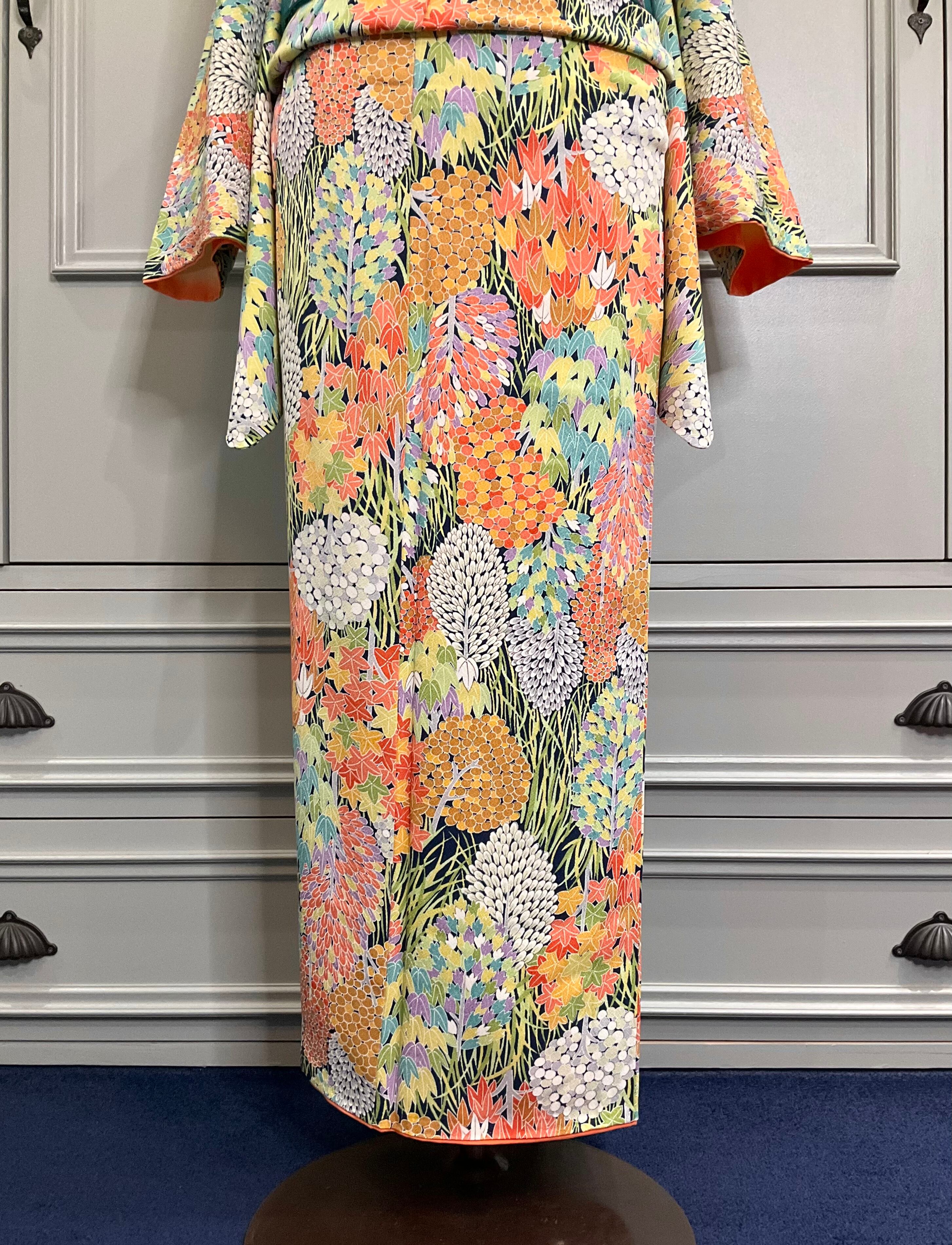 インディゴブルー系の地色に、さまざまな木々が描かれた、小紋着物です♪