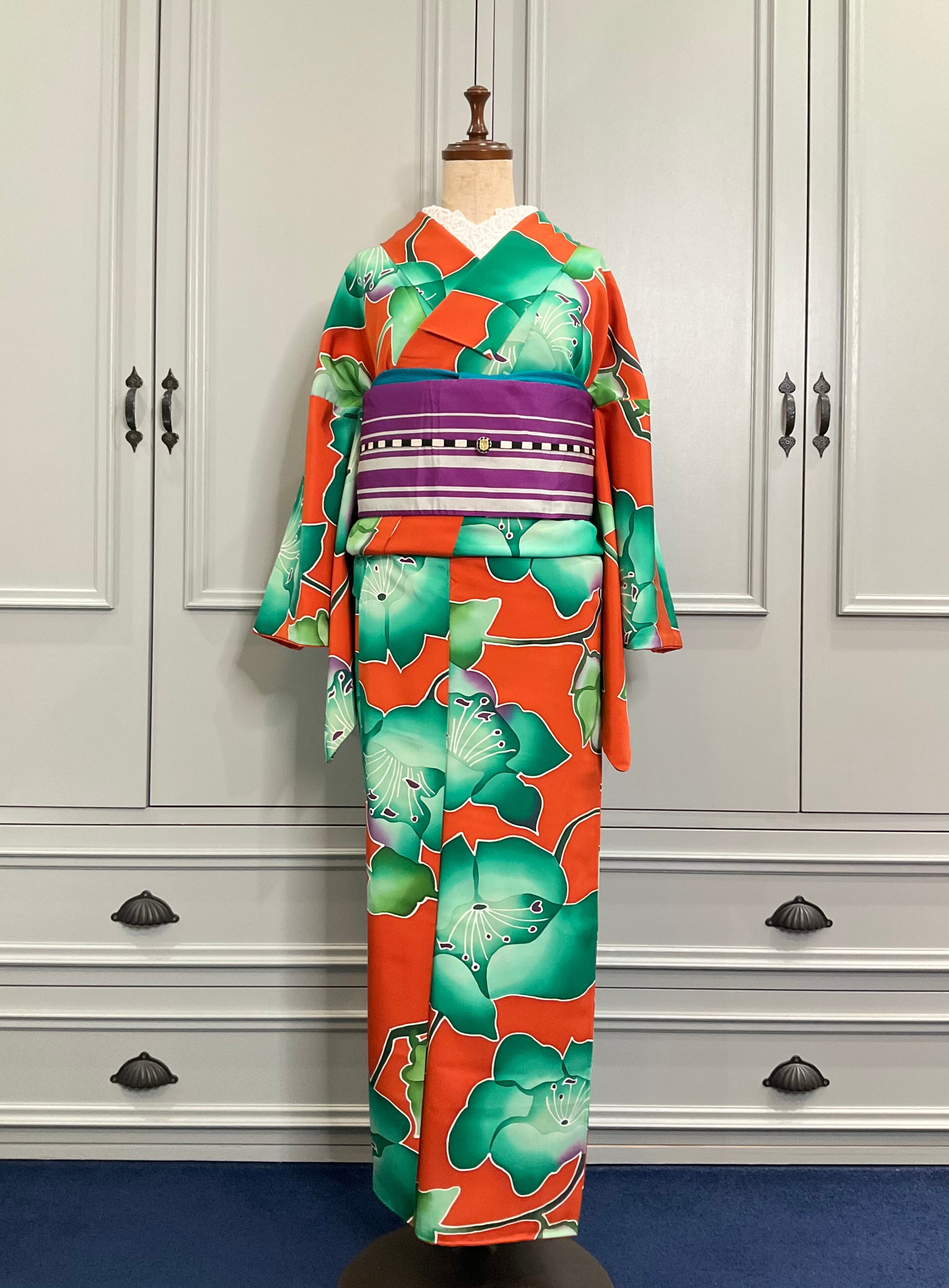 少し黄み寄りのトマトレッド系の地色に、花模様がデザインされた、小紋着物です♪