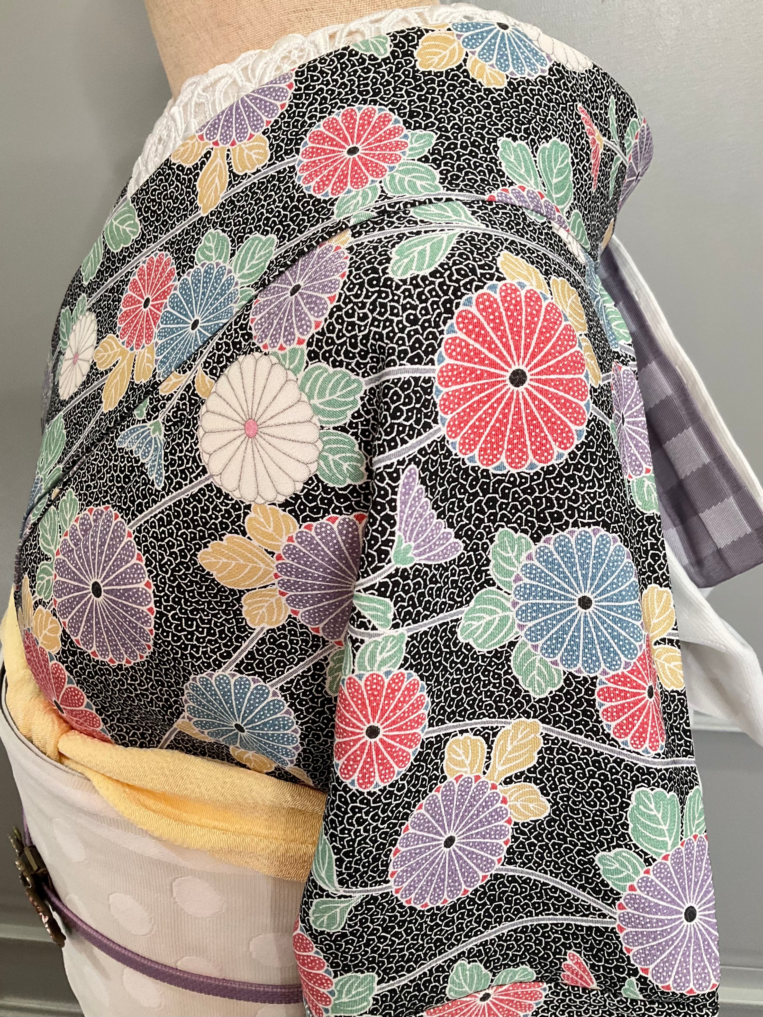 ブラックの地色に、菊の花がデザインされた、小紋着物です♪