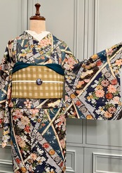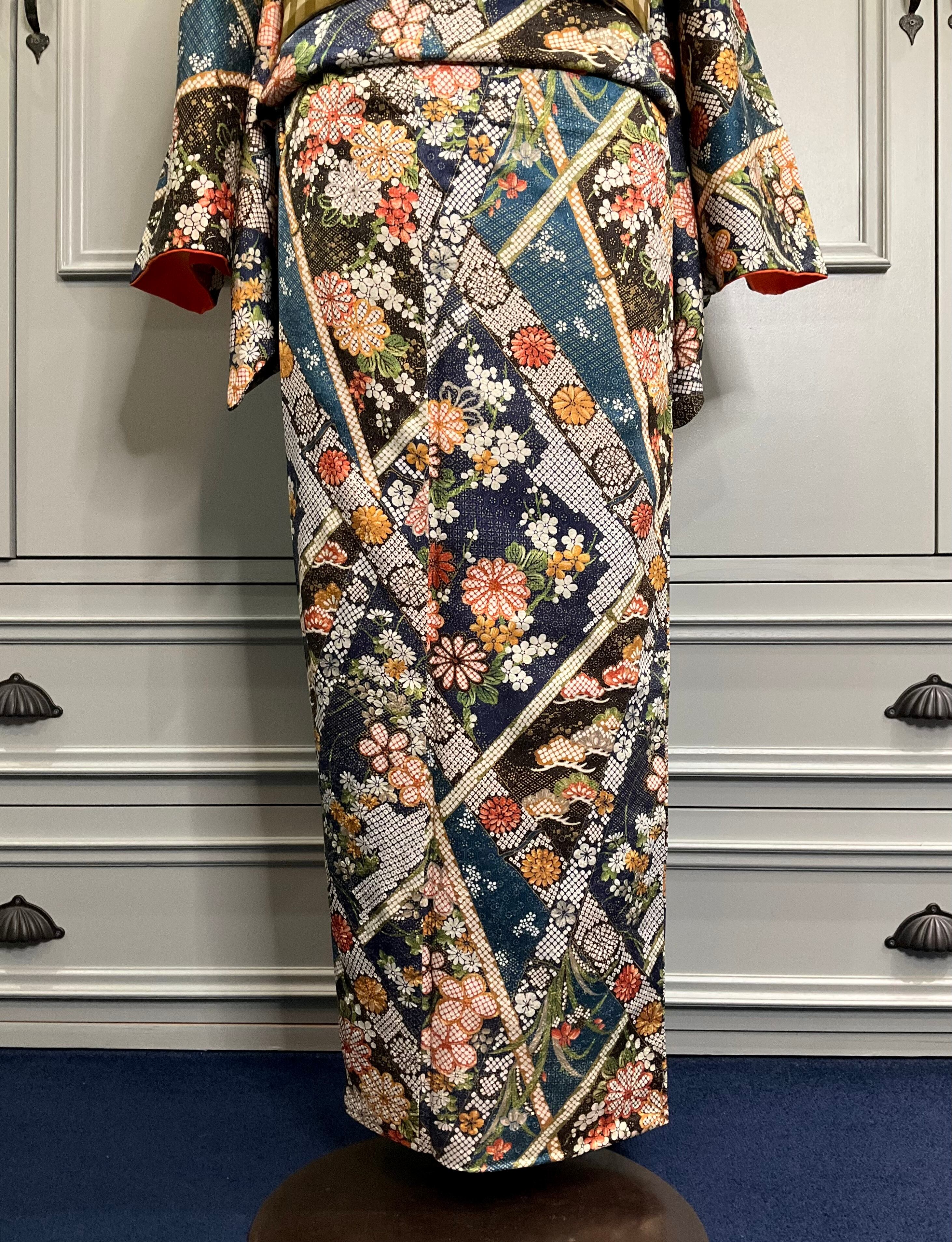 ブルー系を中心とした地色に、花模様がデザインされた、小紋着物です♪