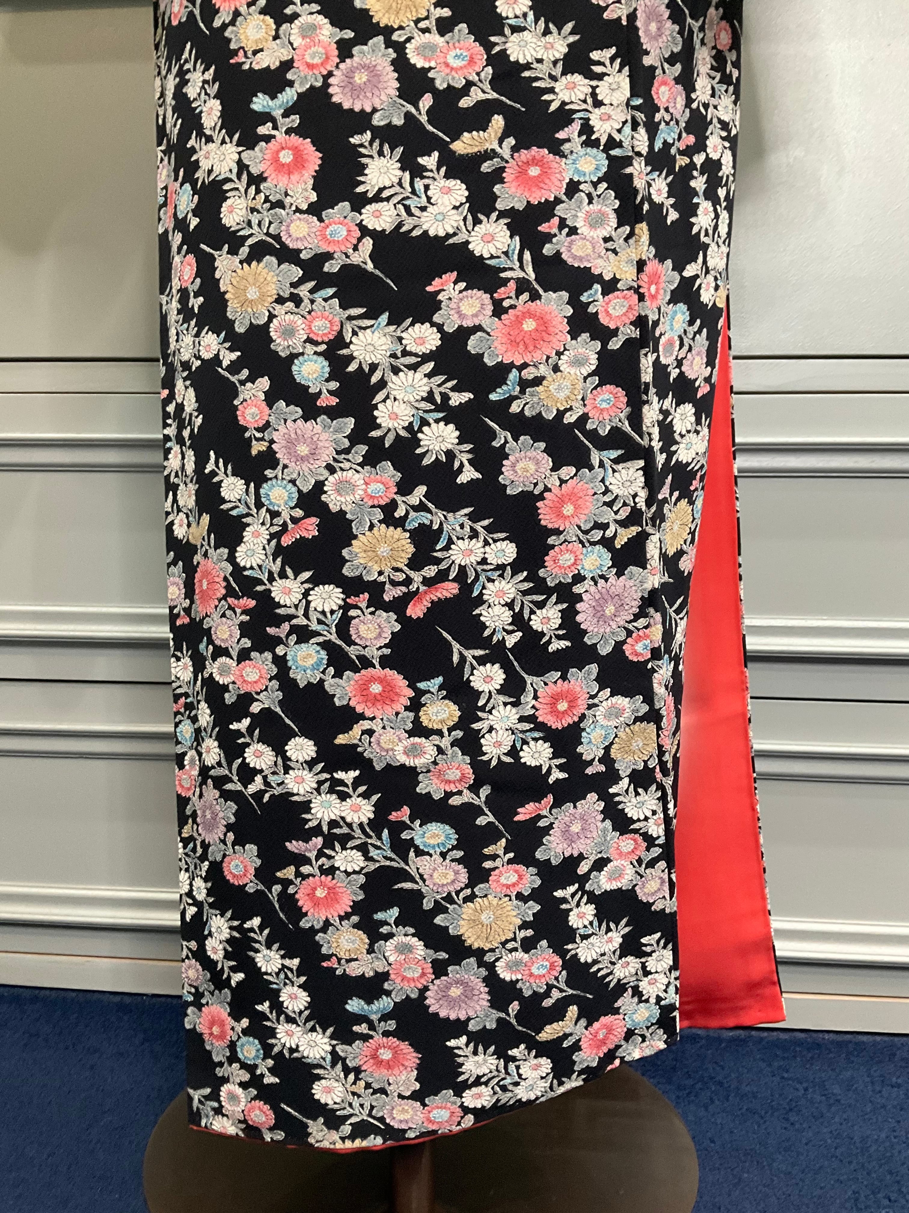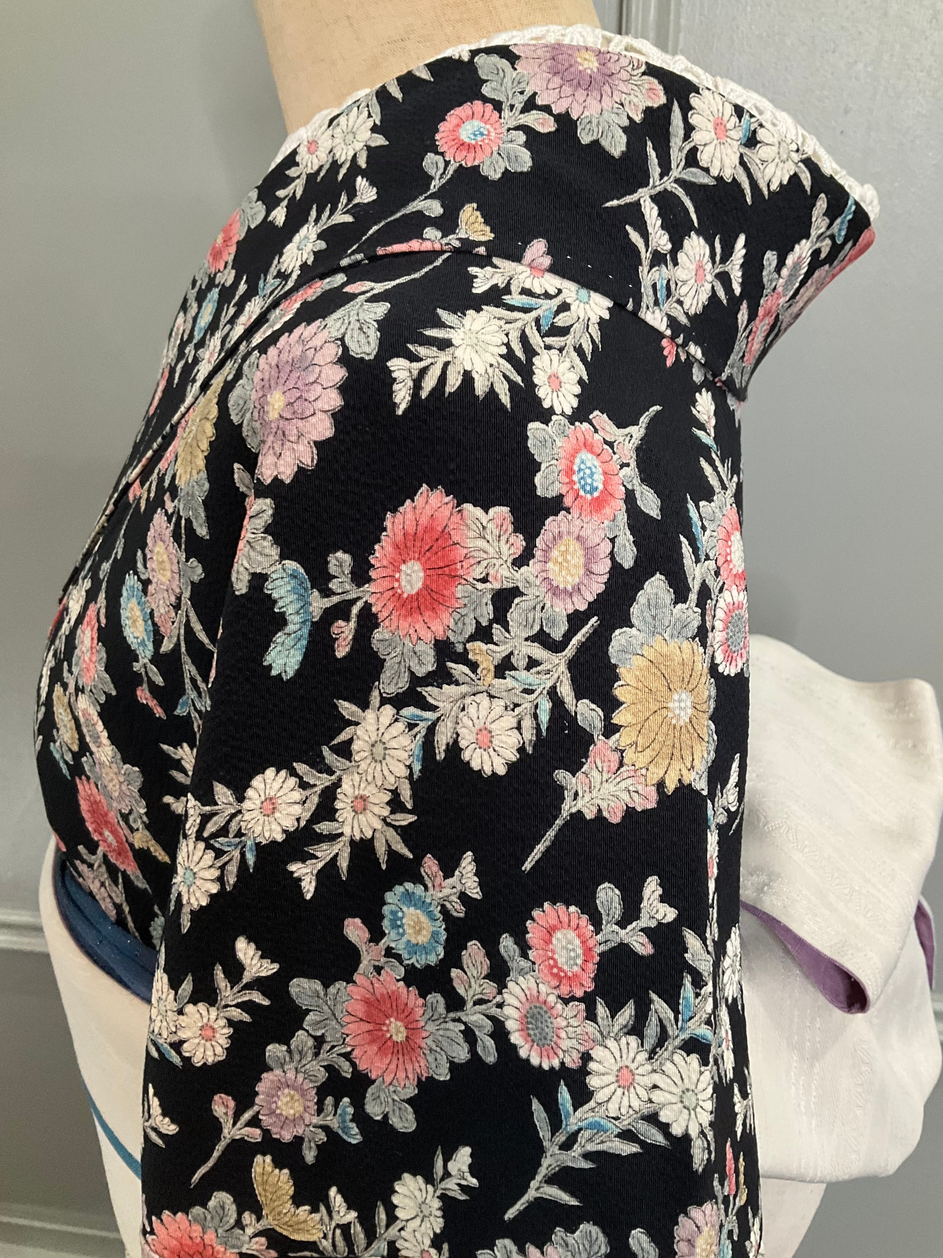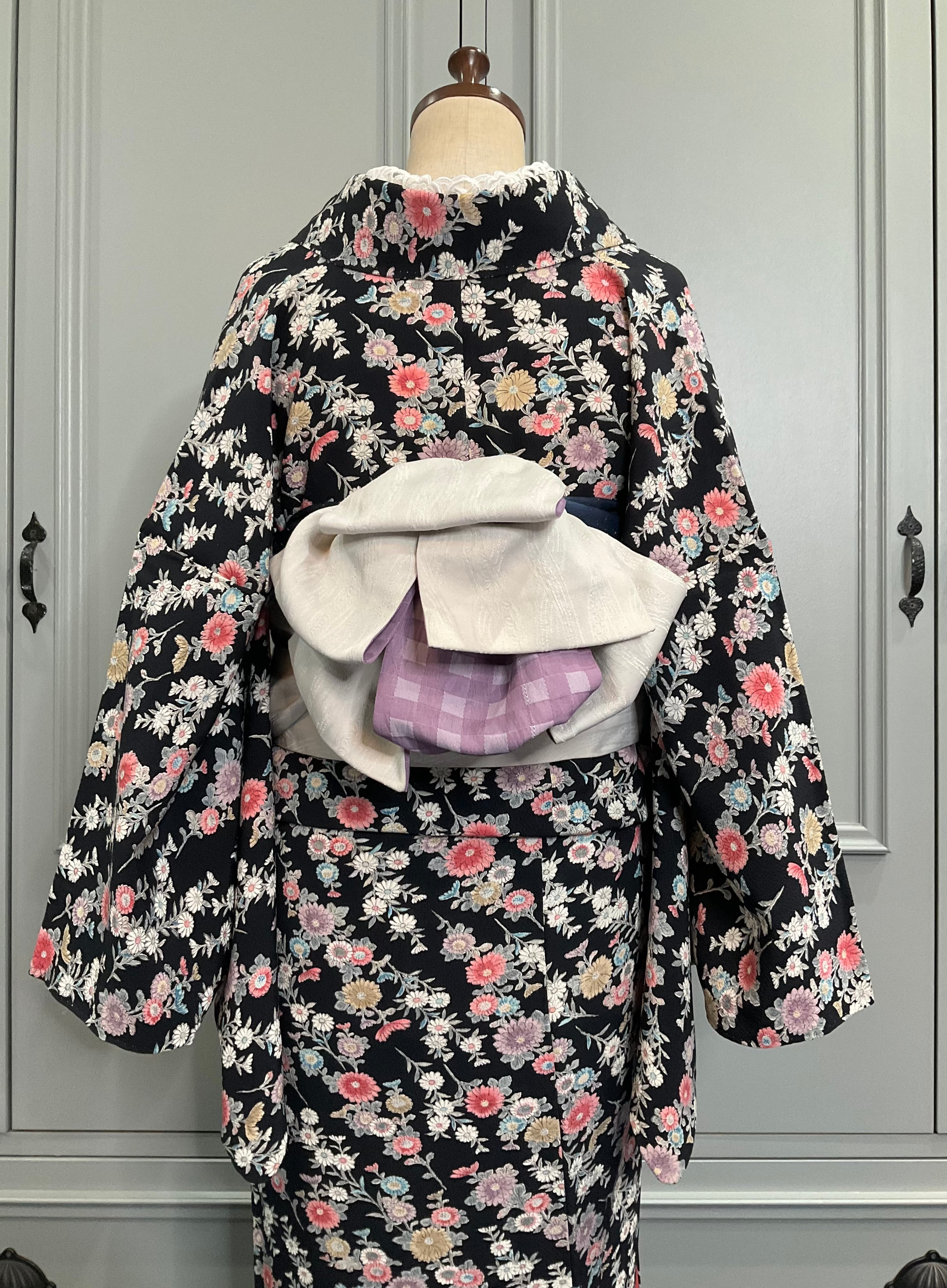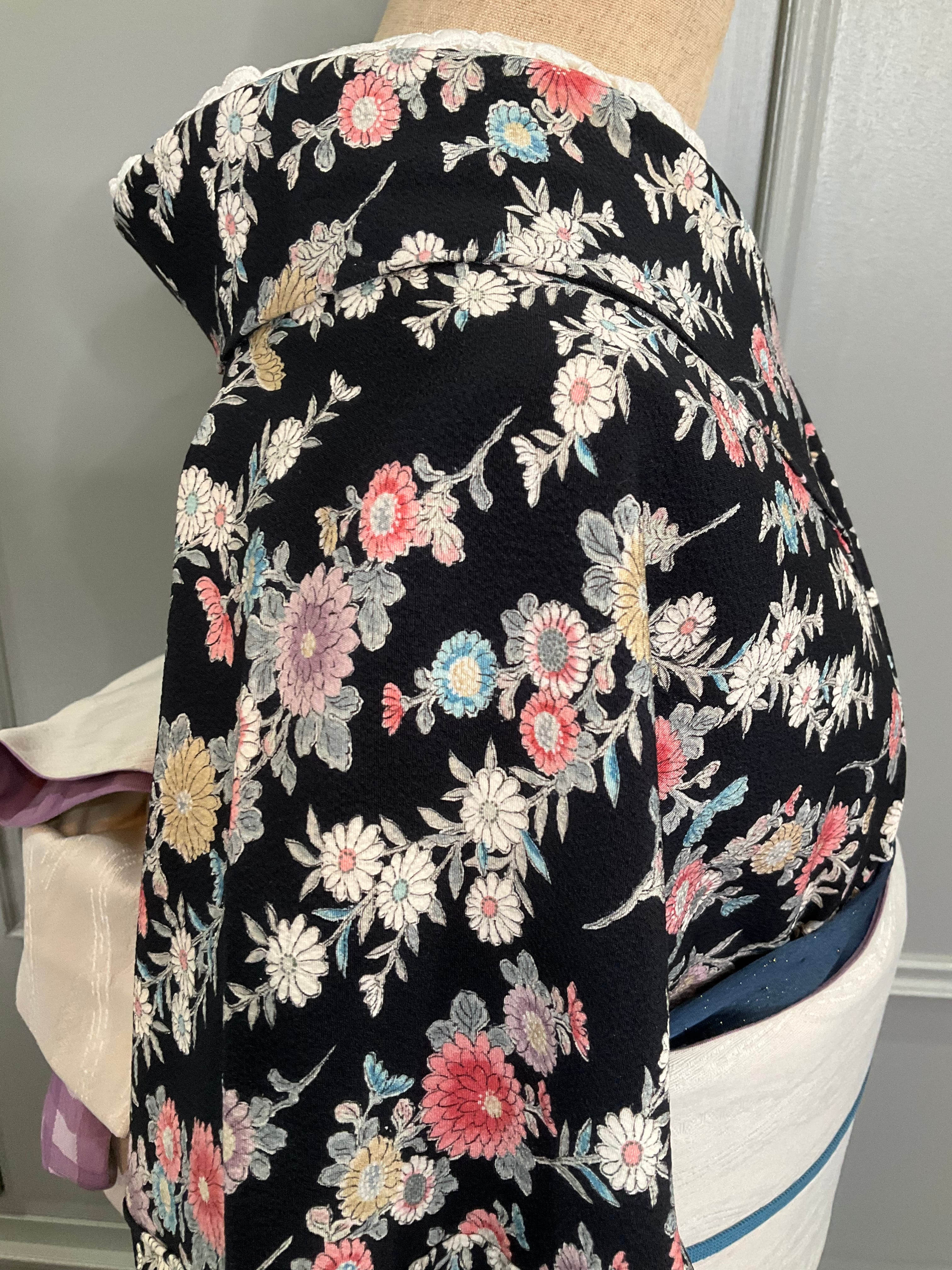 ブラックの地色に、菊の花がデザインされた、小紋着物です♪