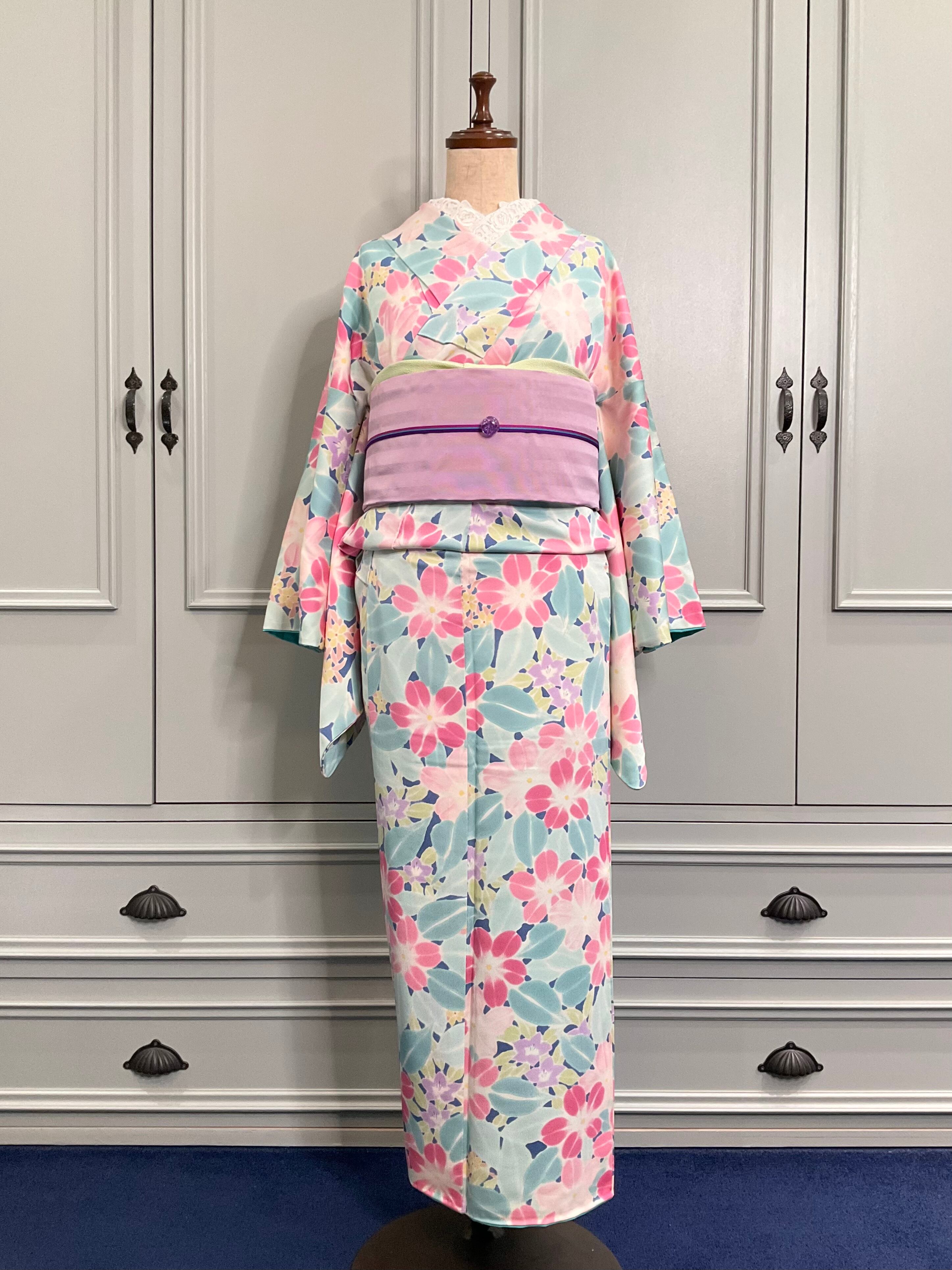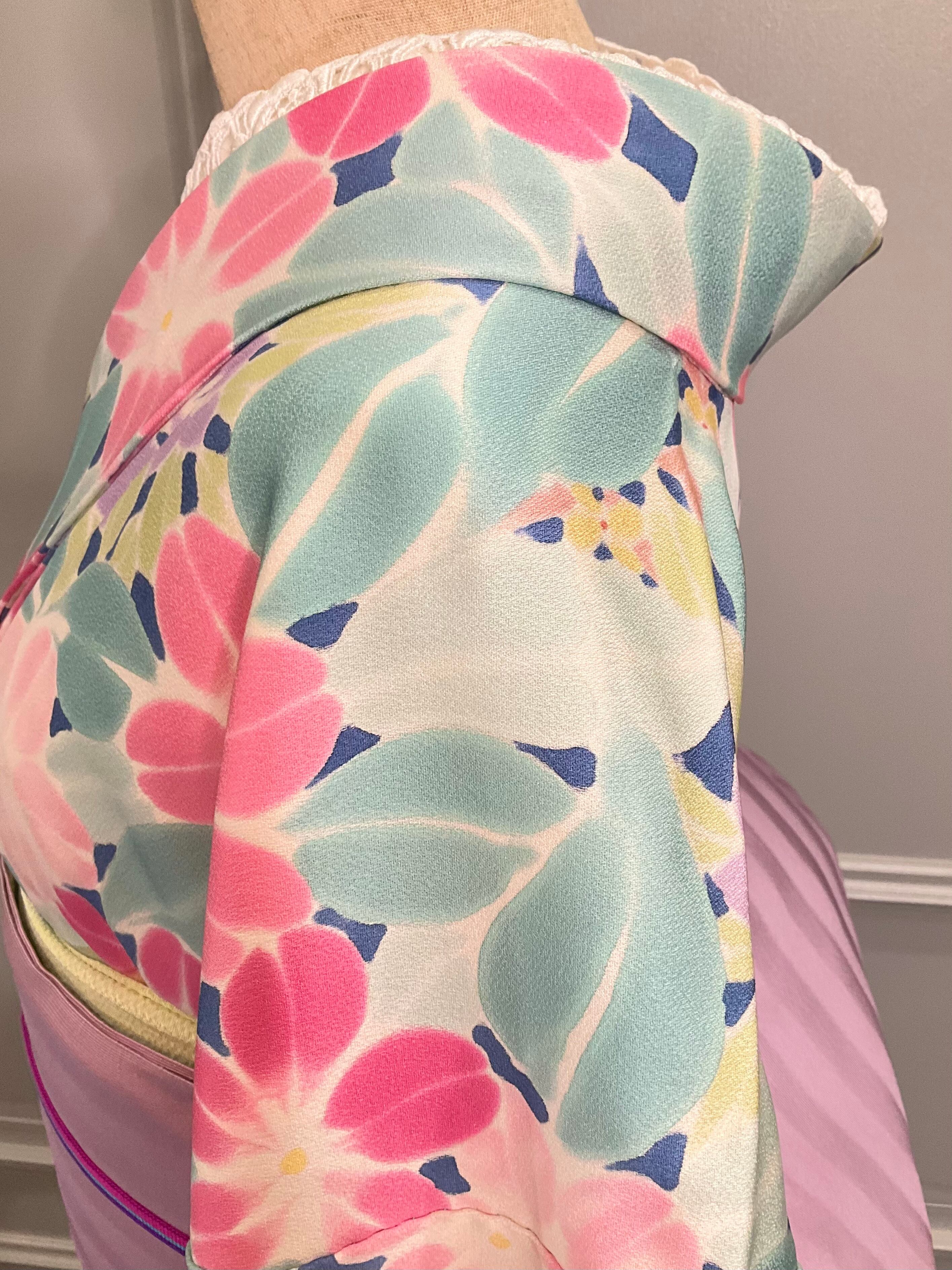 long*パステルカラーと花模様*リサイクル小紋着物 A085