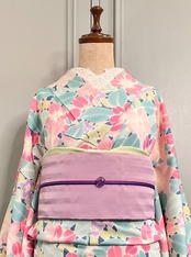 ほんのり赤み寄りの、パステル系パープルが、やわらかく、シンプルで上品な名古屋帯。