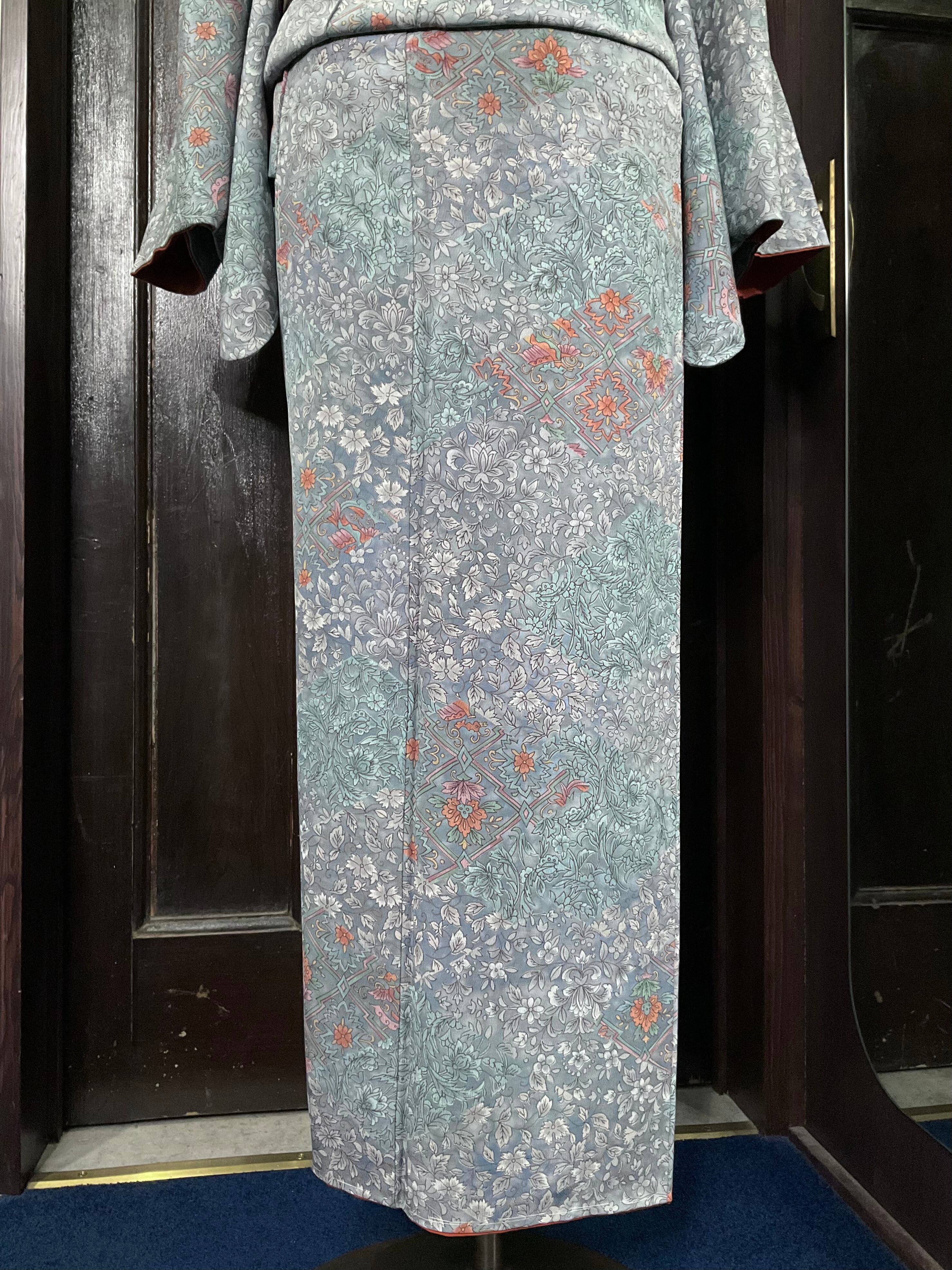 tall*blue gray oriental*リサイクル小紋着物 A091