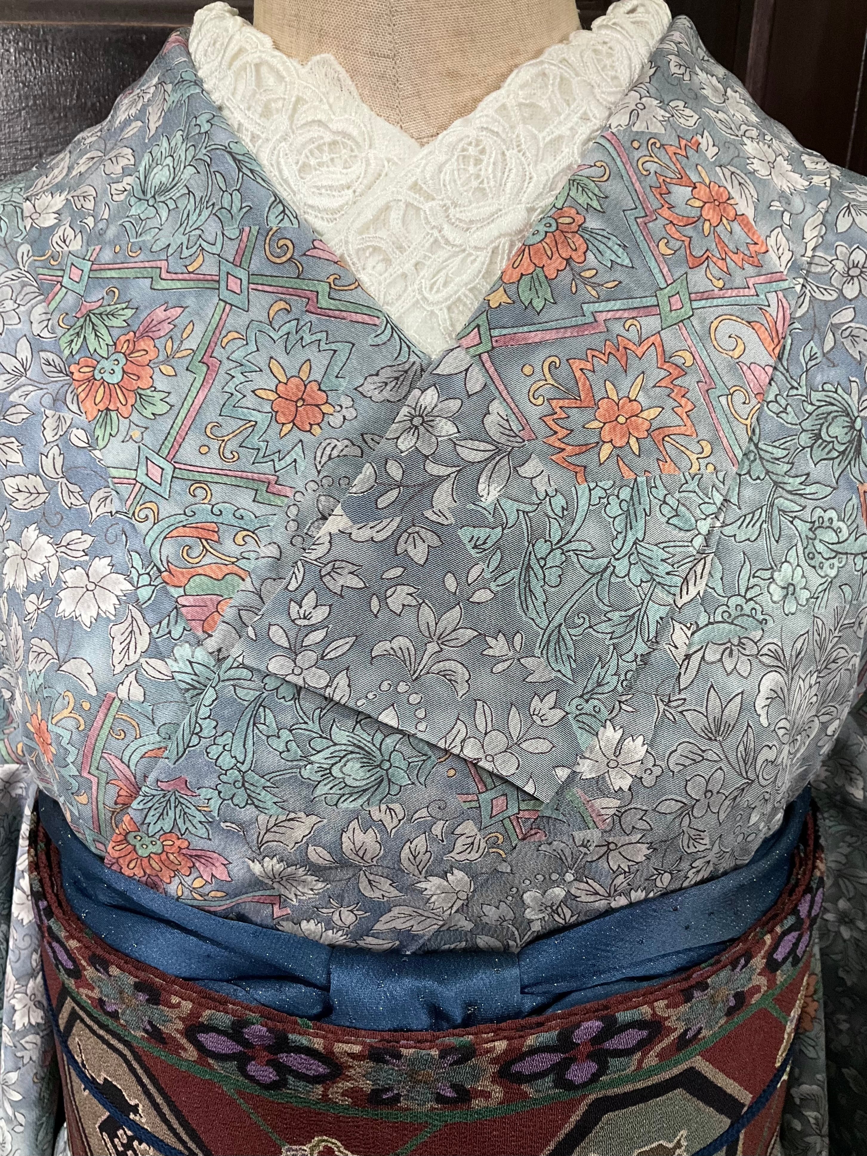 ブルーグレー系の地色に、花模様や鳳凰がデザインされた、小紋着物です♪