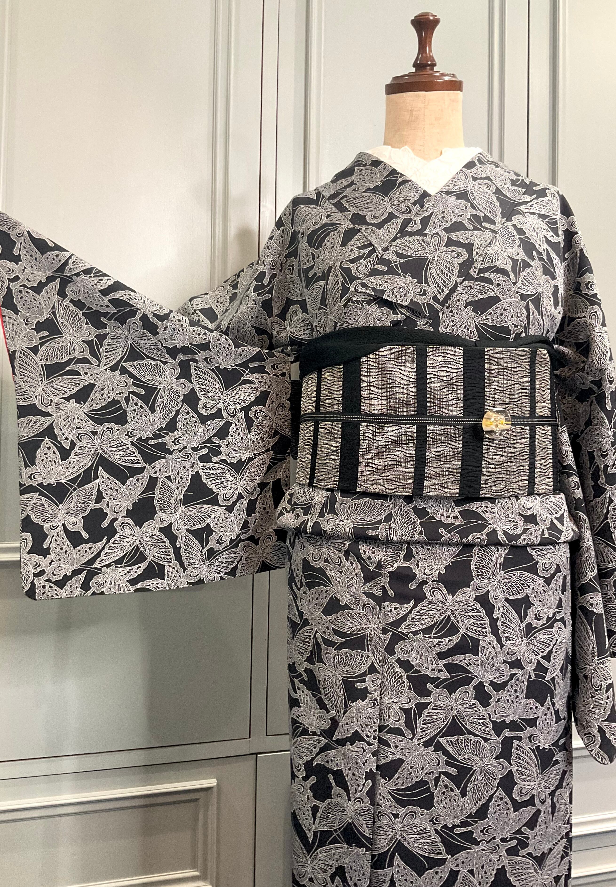 ブラックの地色に、蝶々がデザインされた、小紋着物です♪