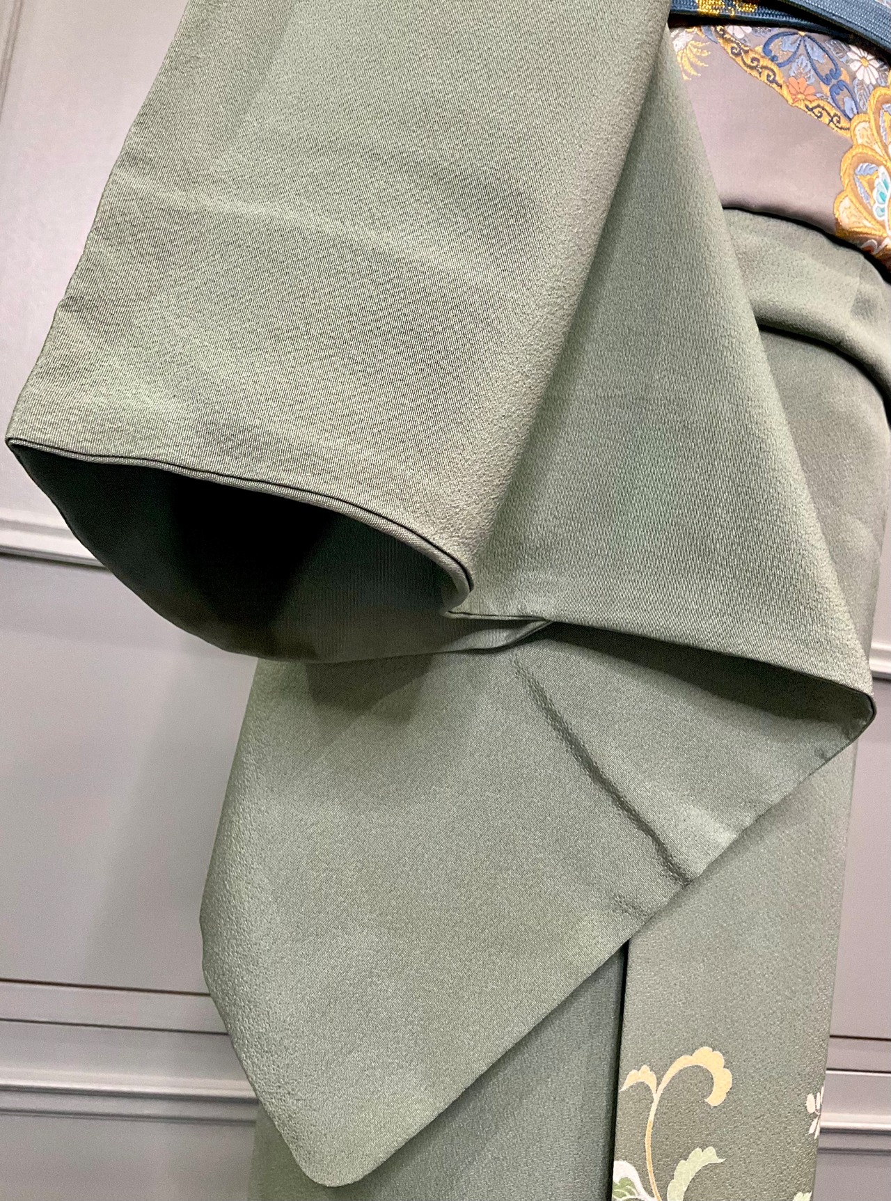 落ち着いたくすみグリーンに、やさしい色づかいの模様で、華やかさもありながら上品に長く着られるデザインです。
