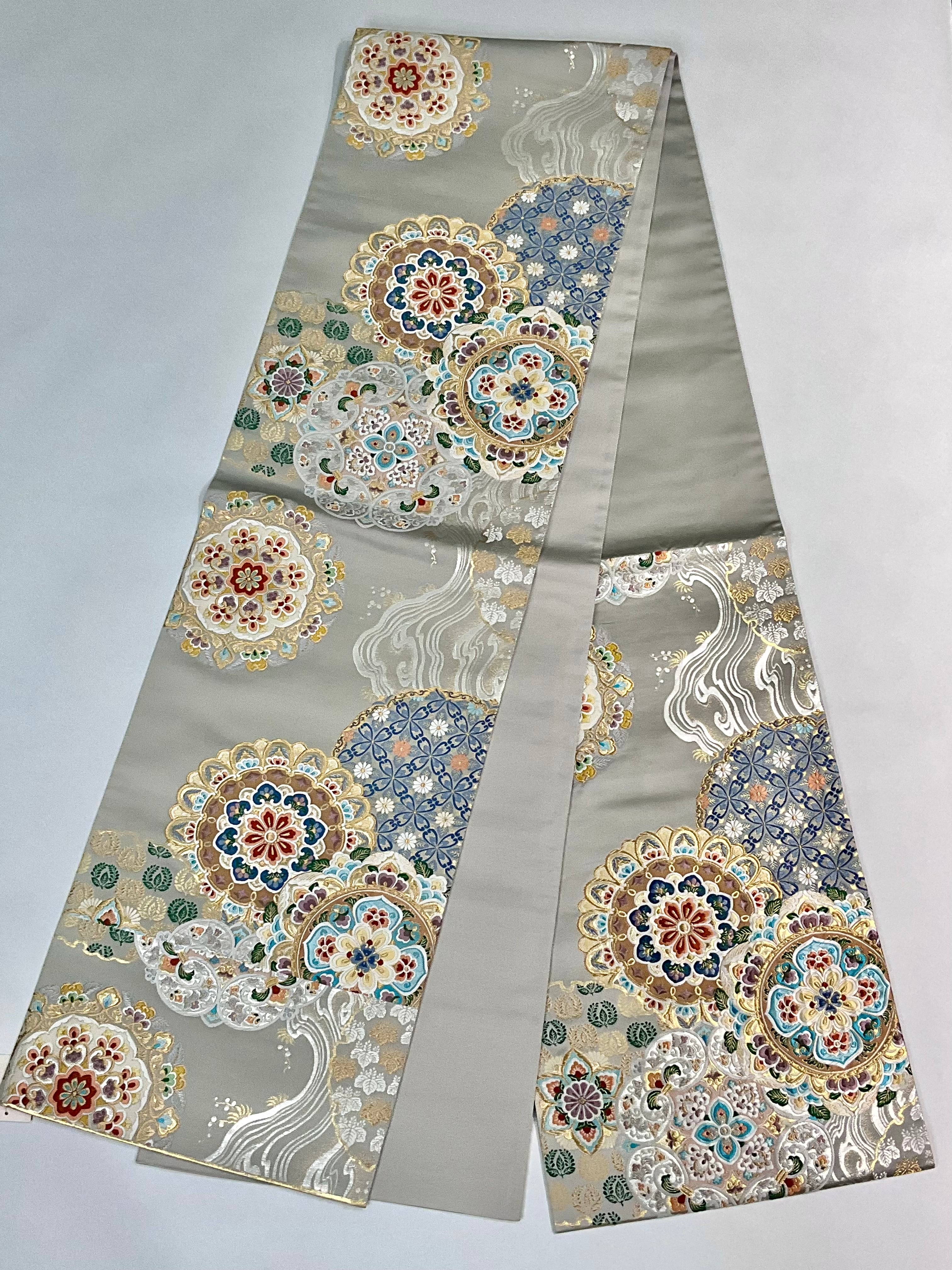 ライトグレー地に色とりどりの華文がデザインされた袋帯です♪