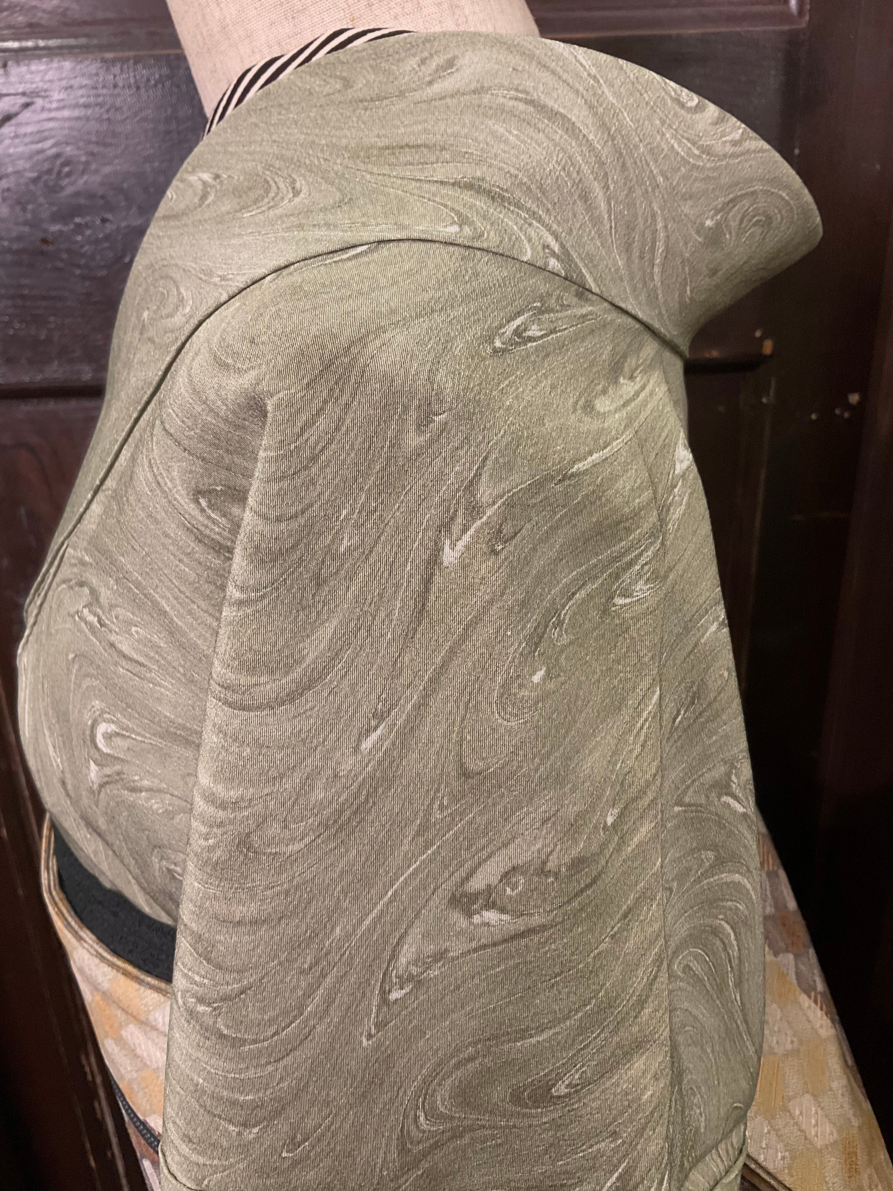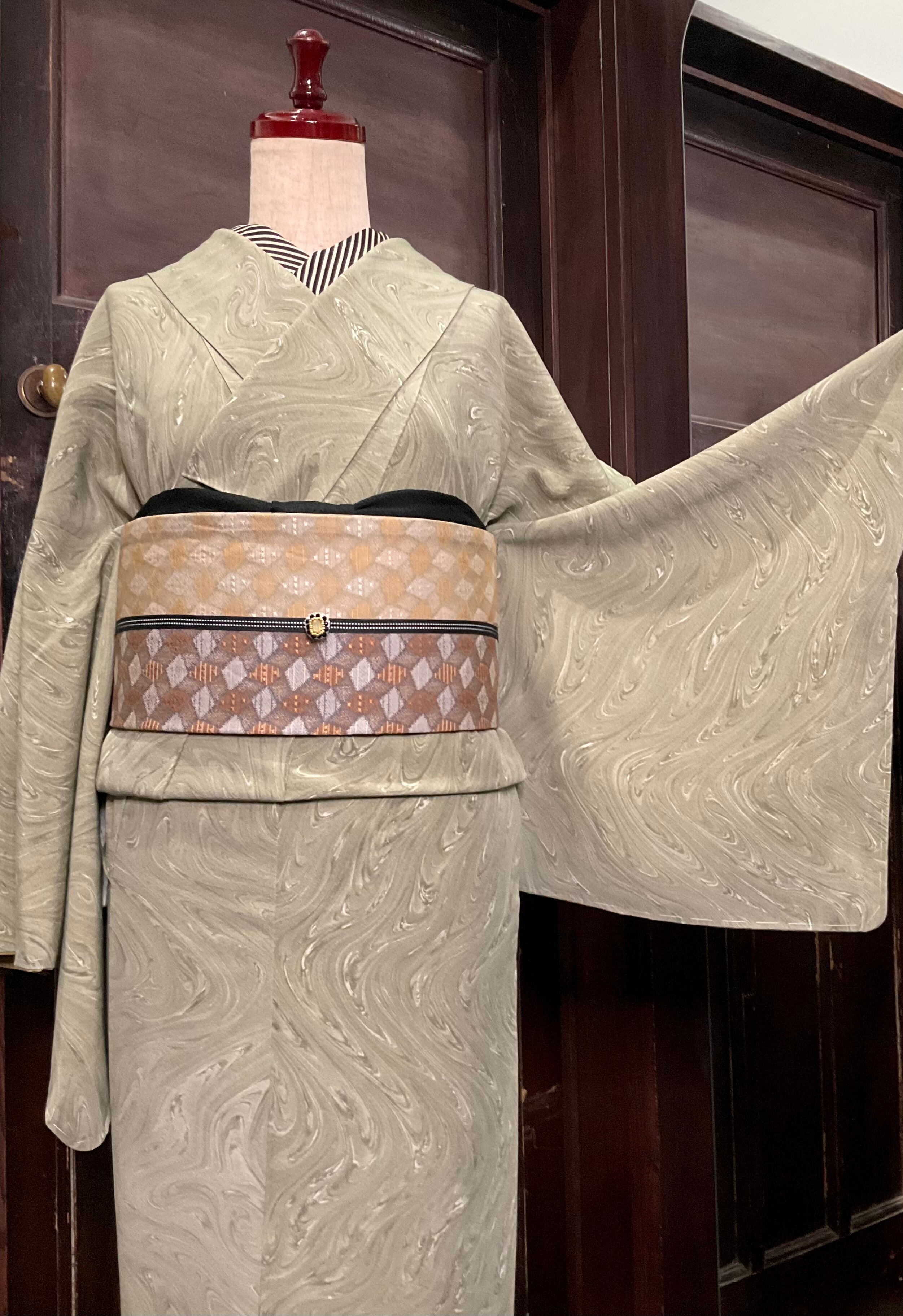 マーブル模様は色数も少なく濃淡のみなので、無地に近い感覚でお召しいただけるので、帯のデザインを気にせず、色々合わせていただきやすい1着かと思います^^