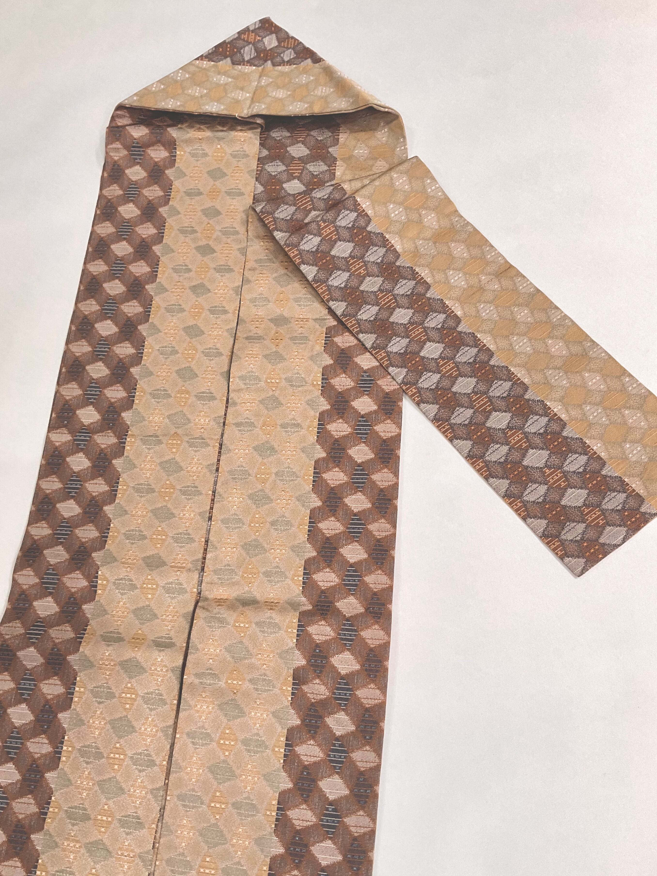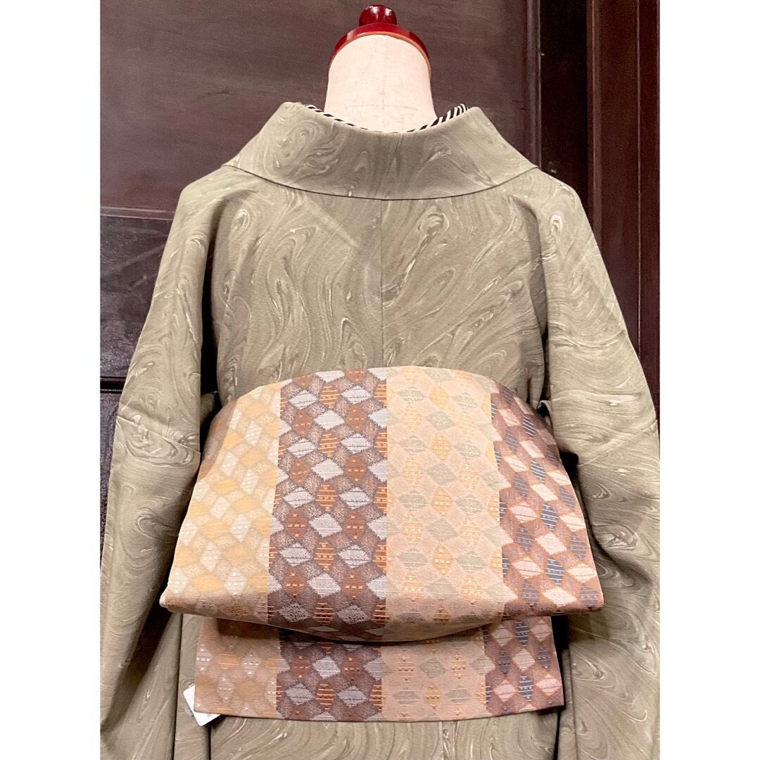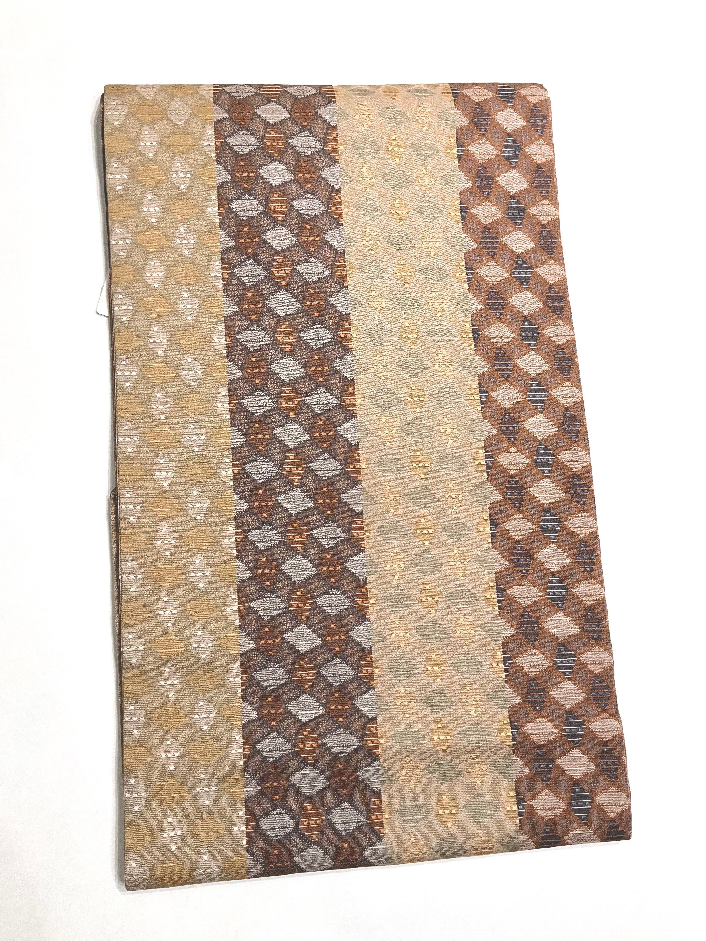 ブラウン系を中心に彩られた、モダンなデザインが素敵な、名古屋帯です♪