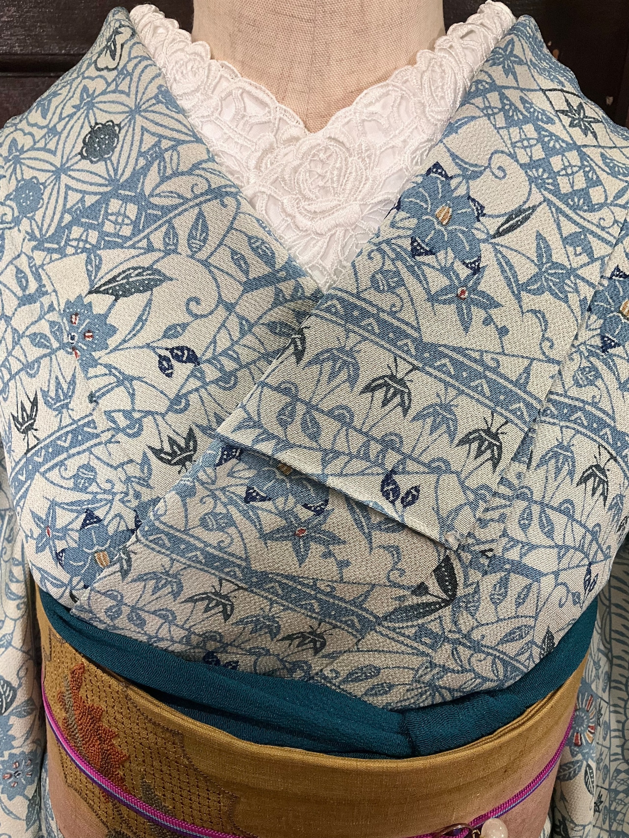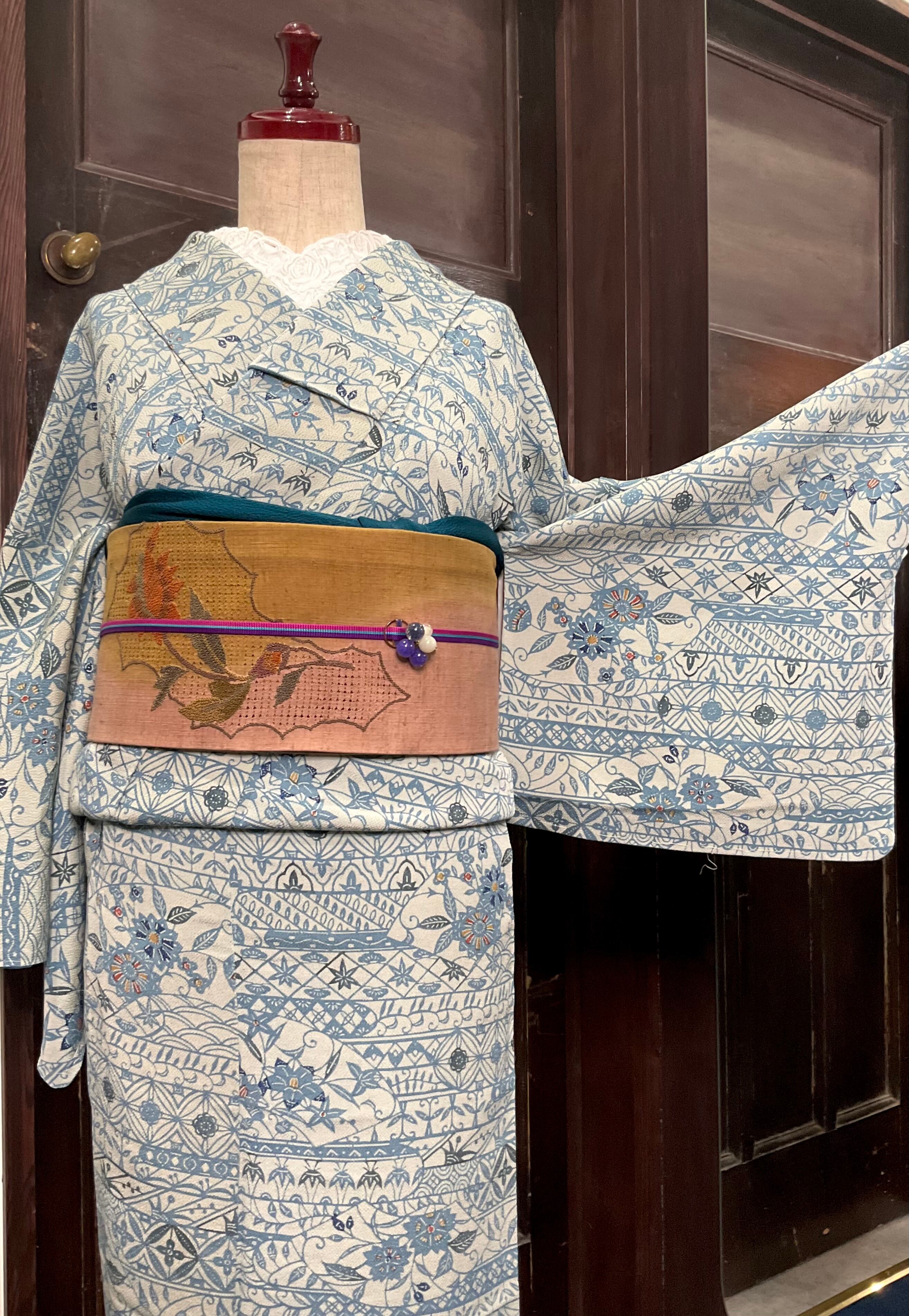 淡いグレー系の地色に、ブルー系を中心とした配色で紅型調にデザインされた、小紋着物です♪
