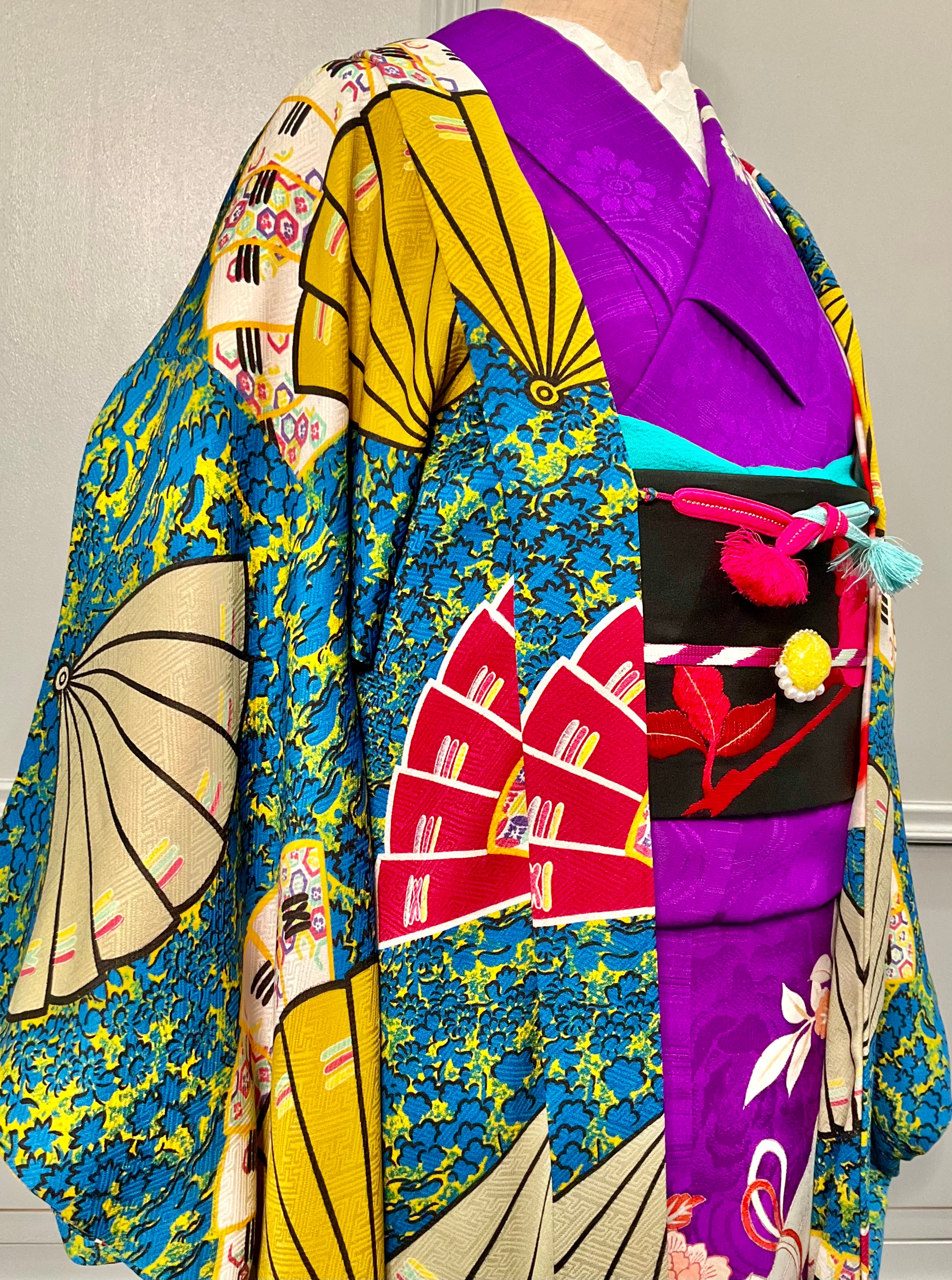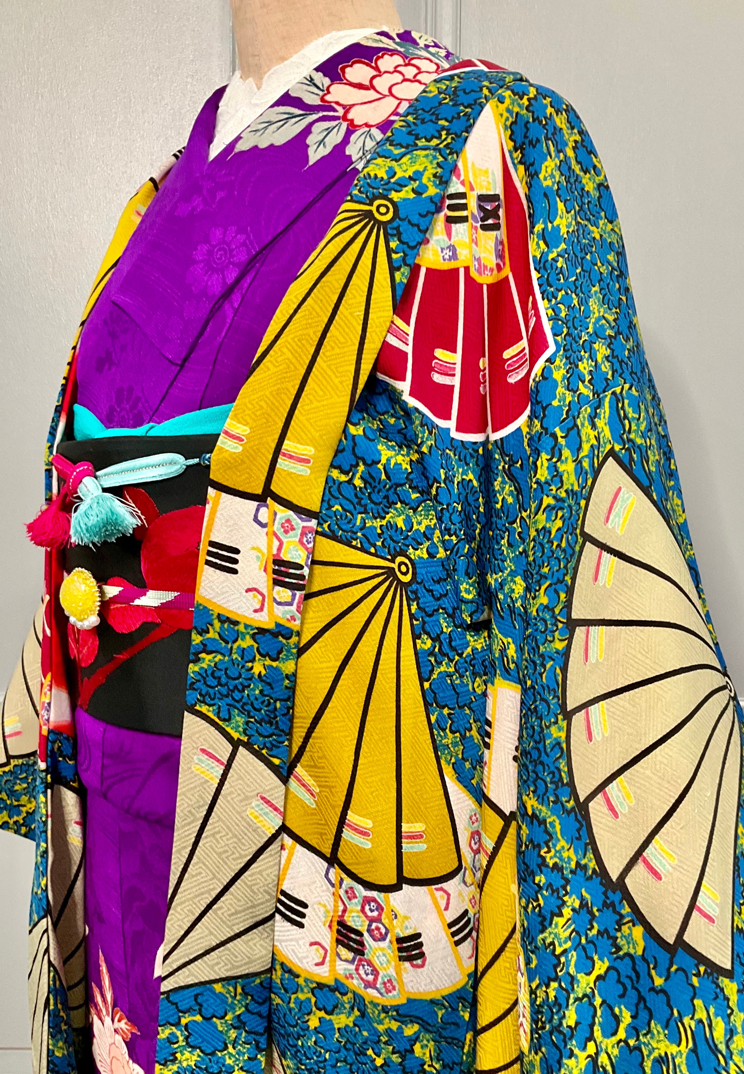 芥子や紅い扇子が目を惹き、晴れやかなデザイン✨