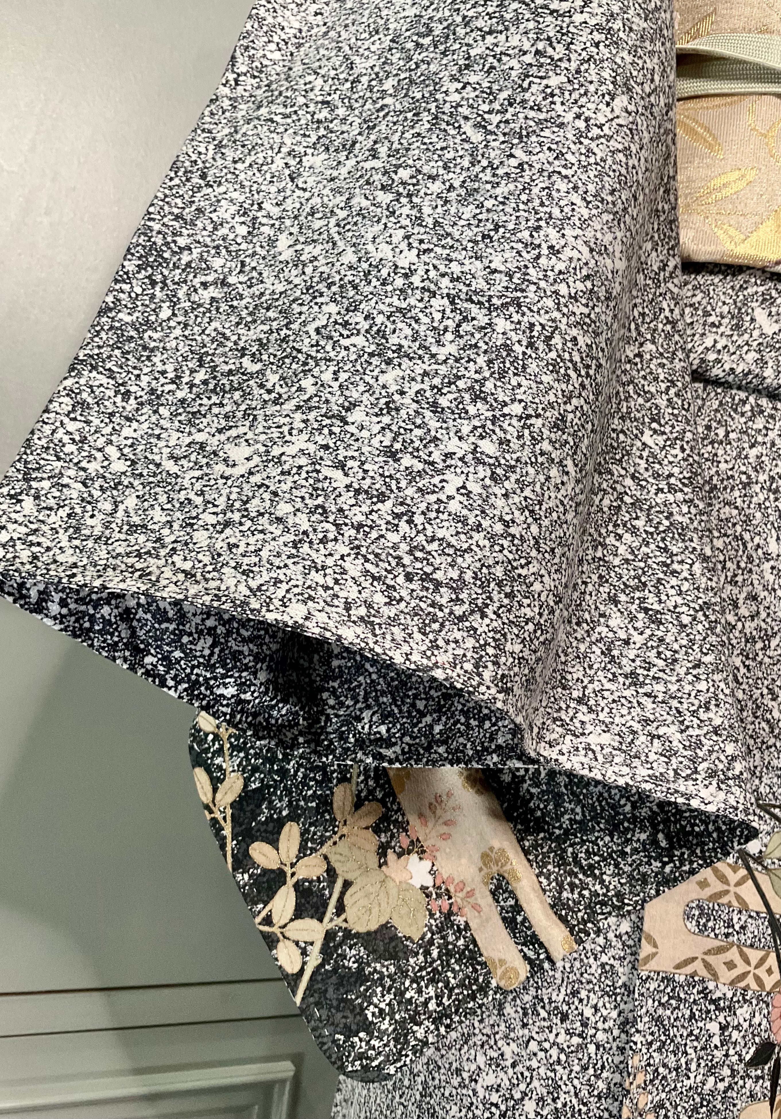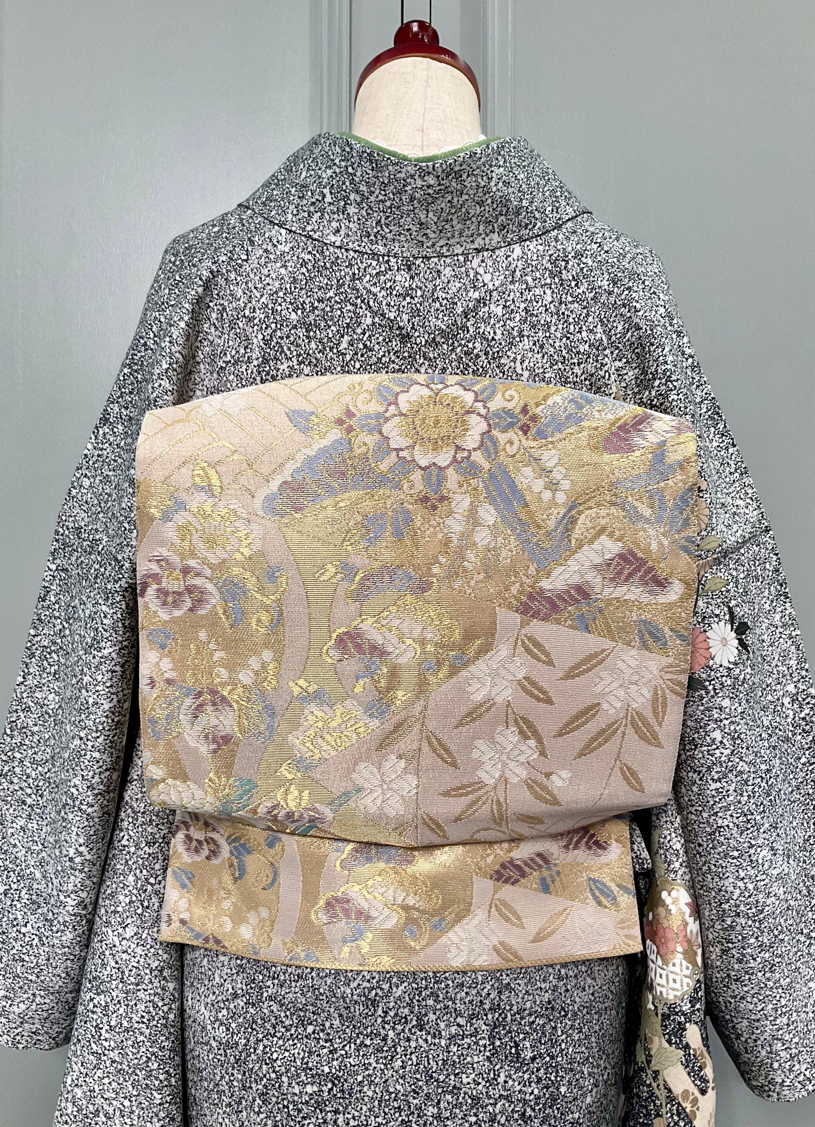 たたき染めという技法で、全体に霞のようなグレー系のグラデーションに、枝垂れる花々や雪輪の模様が奥ゆかしい雰囲気で美しいですね。