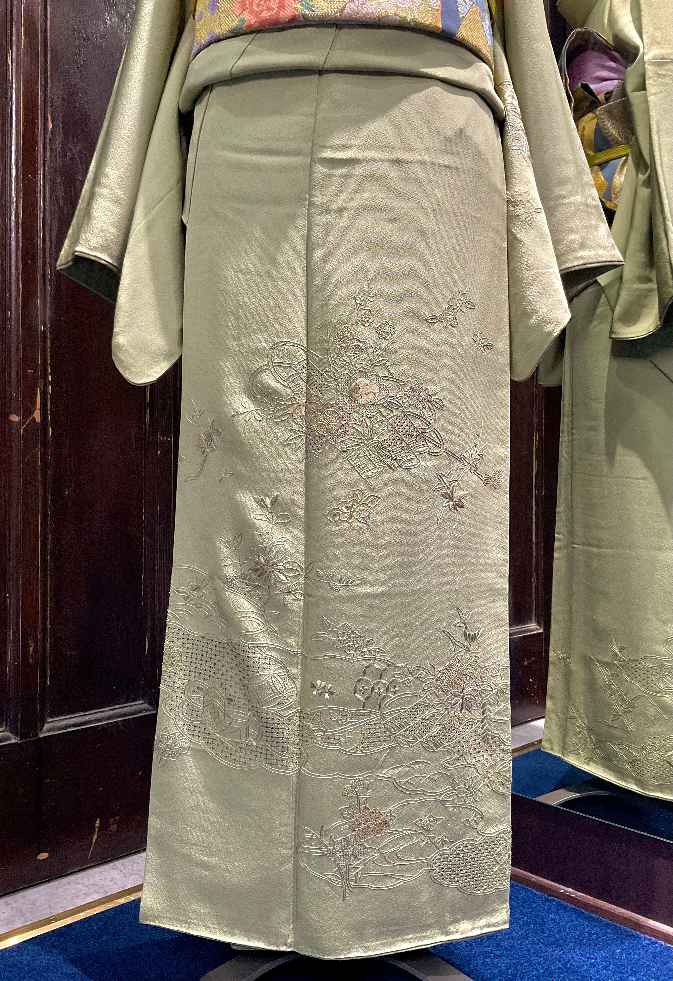 抹茶色に花筏模様のスワトウ刺繍が美しい袷のリサイクル訪問着です♪