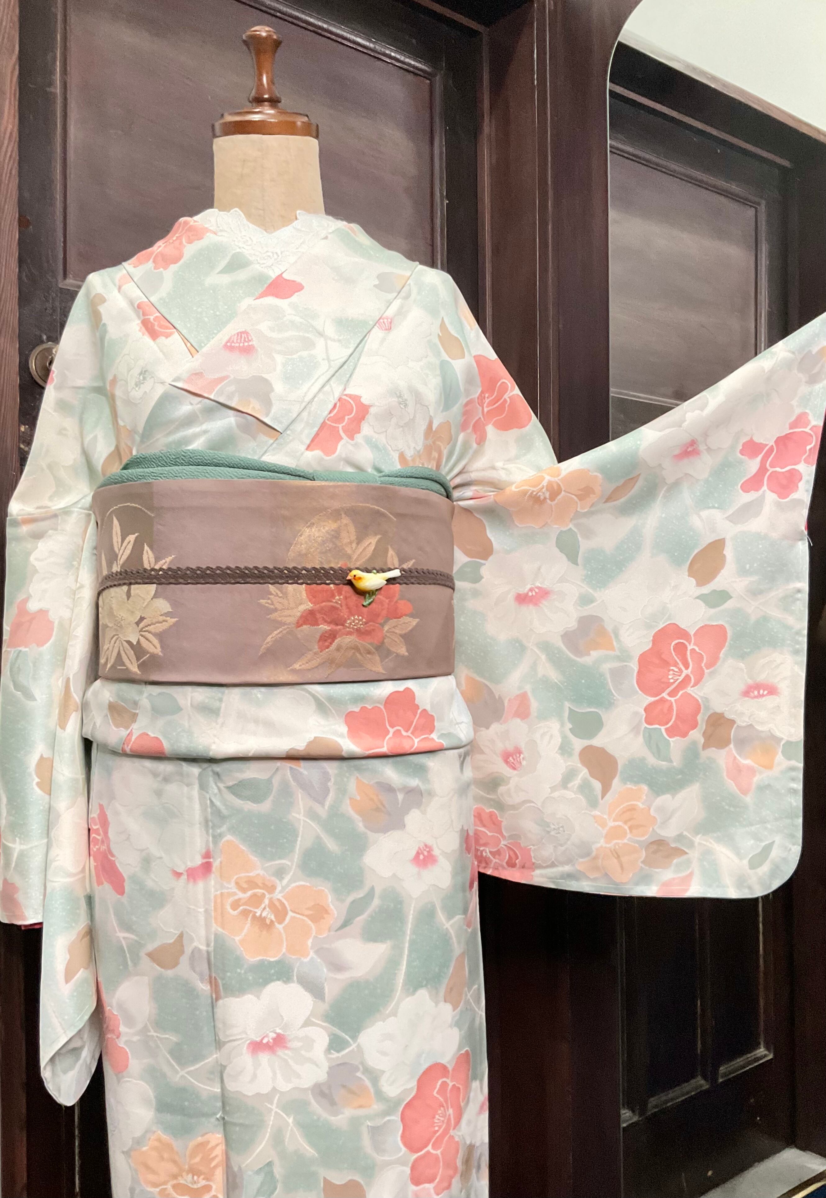 淡いグリーン系の地色に、花模様がデザインされた、小紋着物です♪