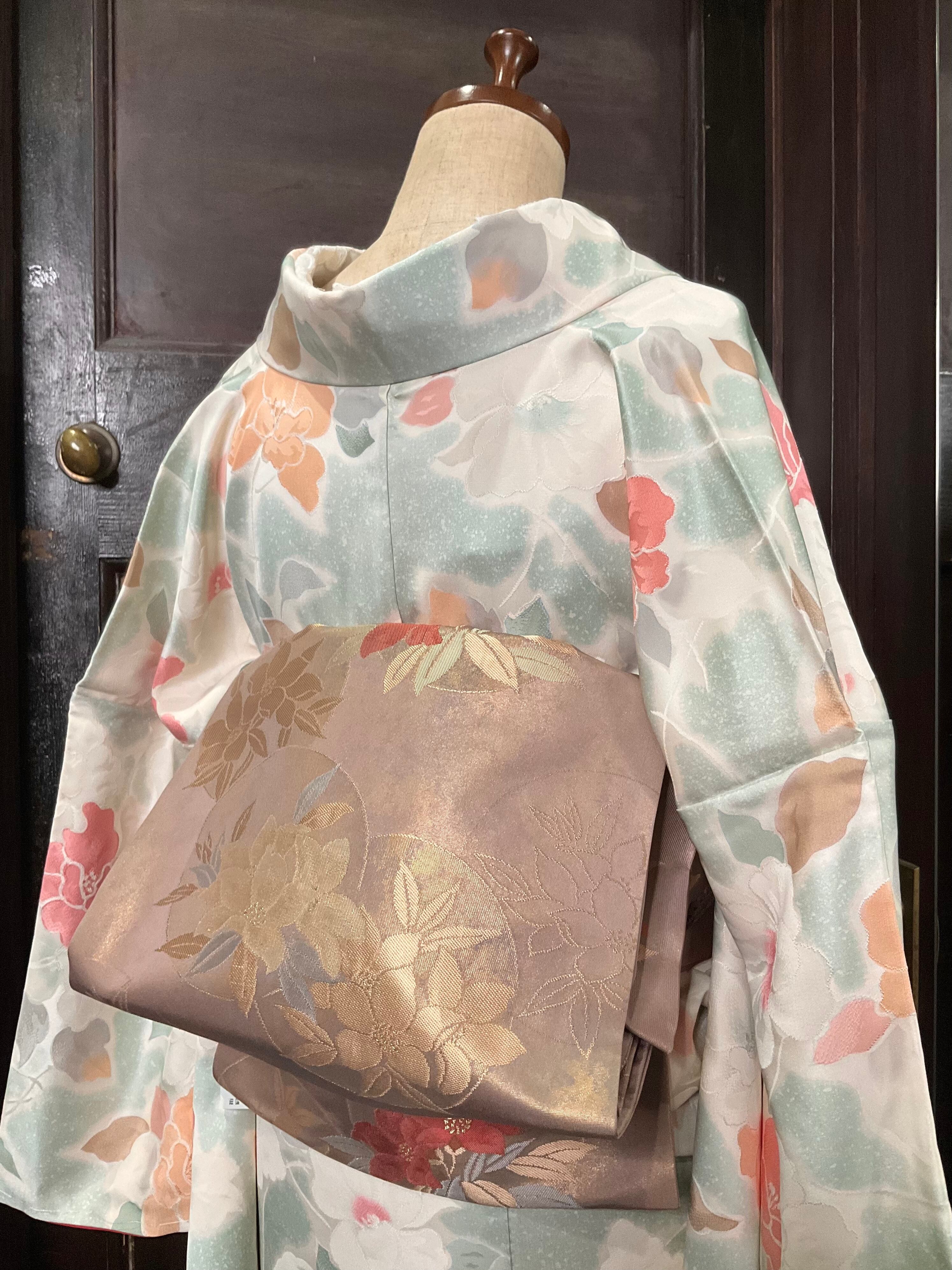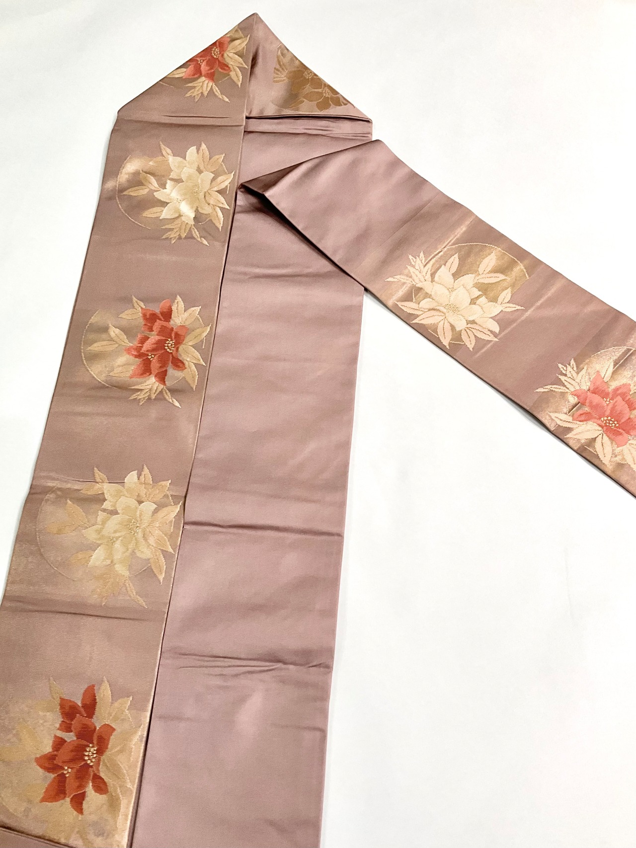 淡いブラウン系の地色に、花模様がデザインされた、名古屋帯です♪